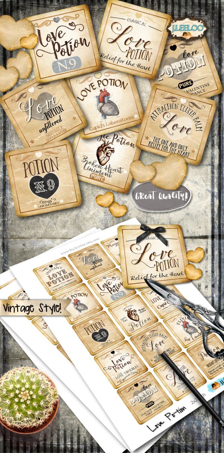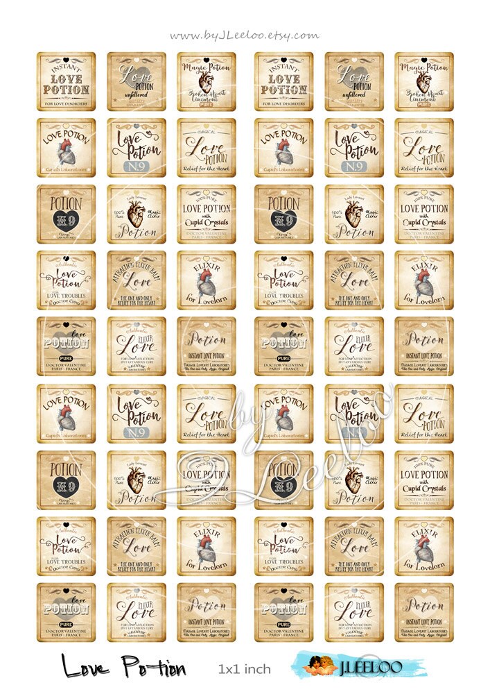 LOVE POTION Instant Download - Digital collage sheet - Square printable steampunk heart for apothecary jar labels, jewelry, glass cabochons, paper goods, cards, bottle caps, stickers, hang tags and all your artwork.