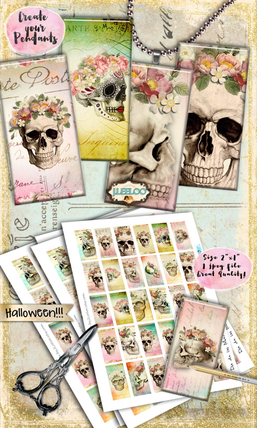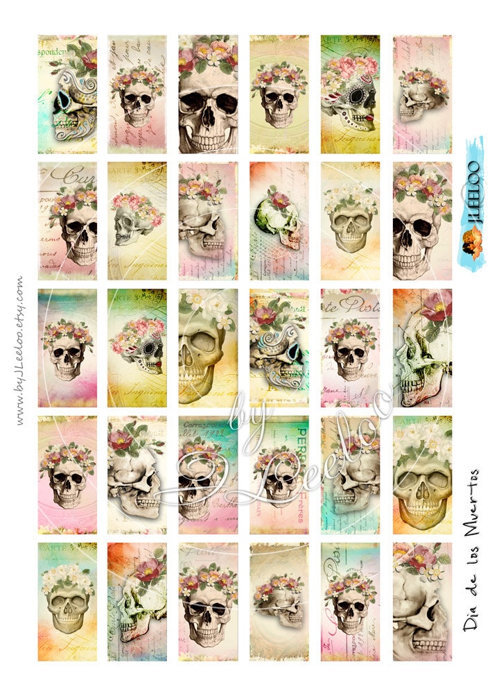 DIA DE LOS MUERTOS - Instant Download - Digital paper printable - Skulls Digital collage sheet domino digital images 2x1 inch for resin pendant, bezel trays, scrapbook, jewelry and your craft and artwork.