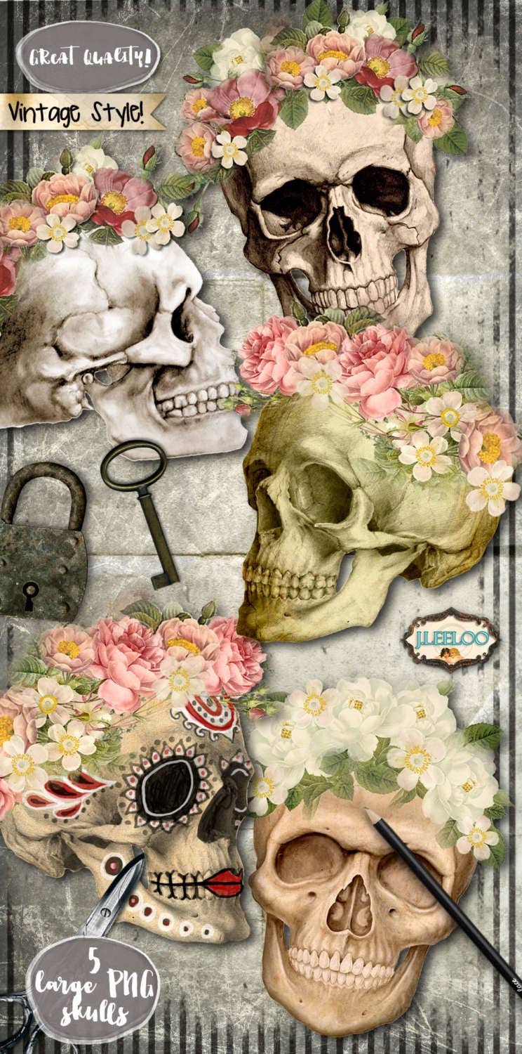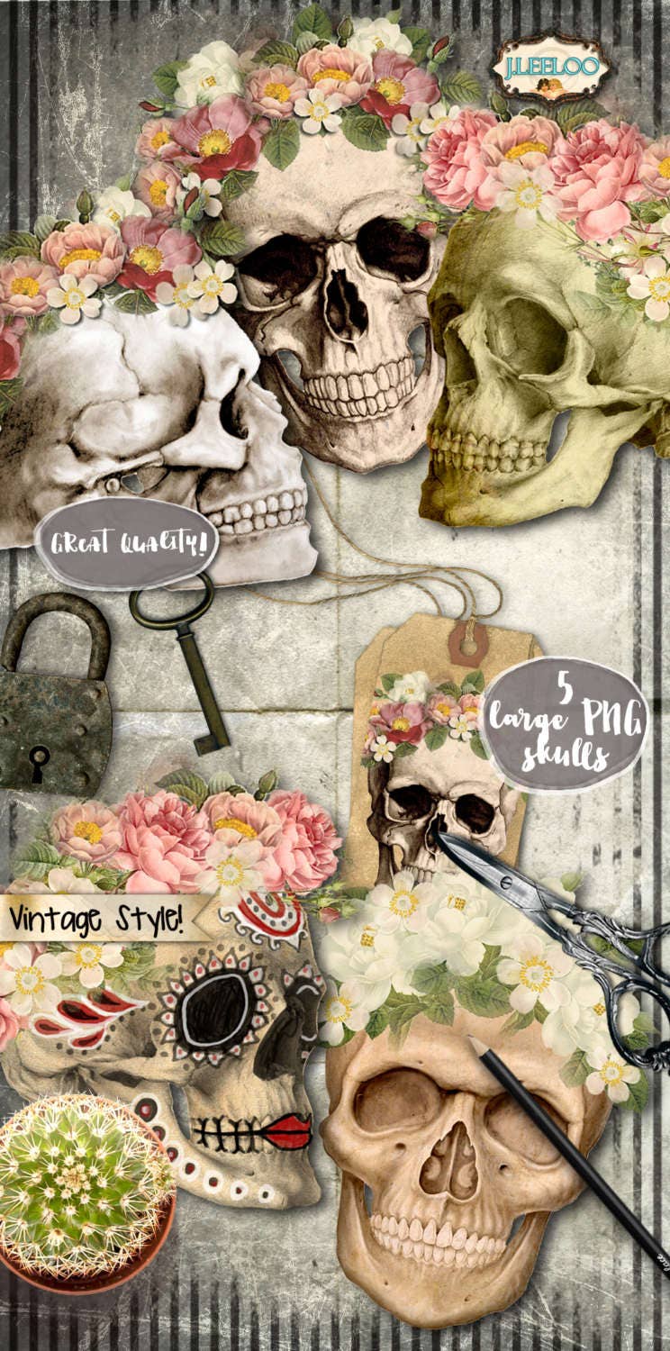 SKULLS dia de los muertos Digital Download - PNG Printable digital collage sheet for your artwork: scrapbook, diary art, hang tags, jewelry holders, invitations or annuncements, greetings cards or backing cards.... for your creativity!