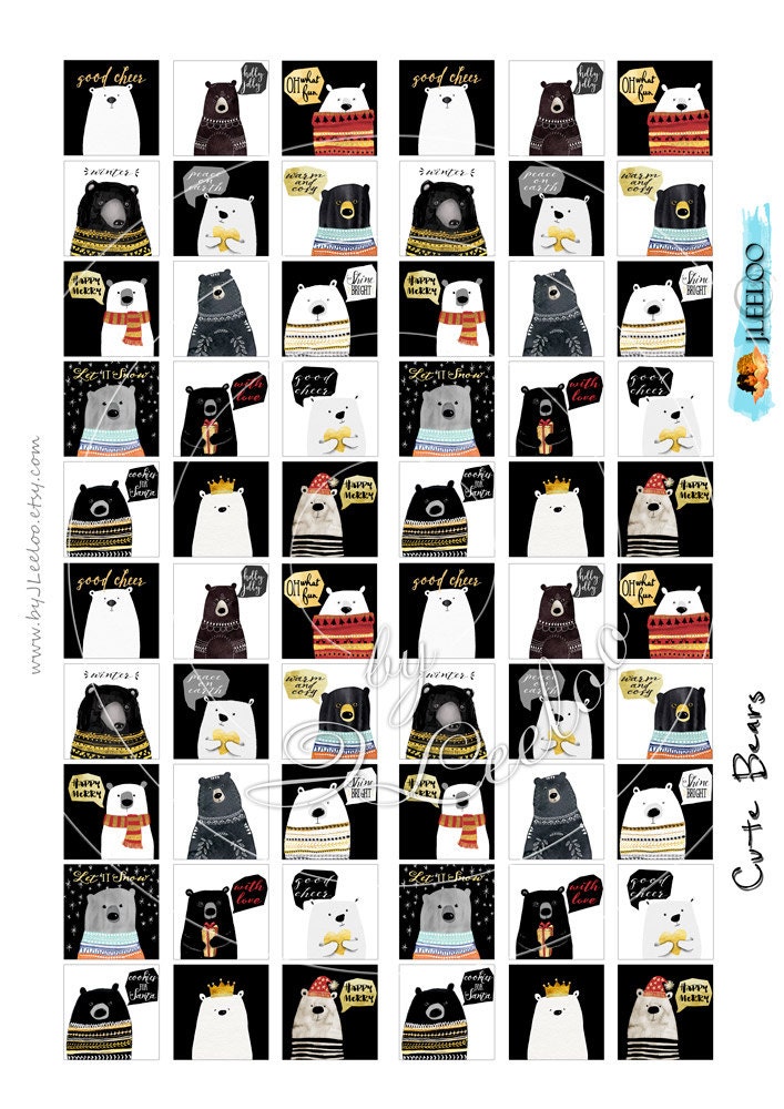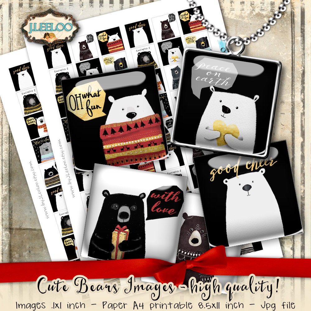 CUTE BEARS hand drawn hand painting Instant Download - Digital collage sheets printable - Square digital images 1 inch for pendants, jewelry and your craft and artwork.