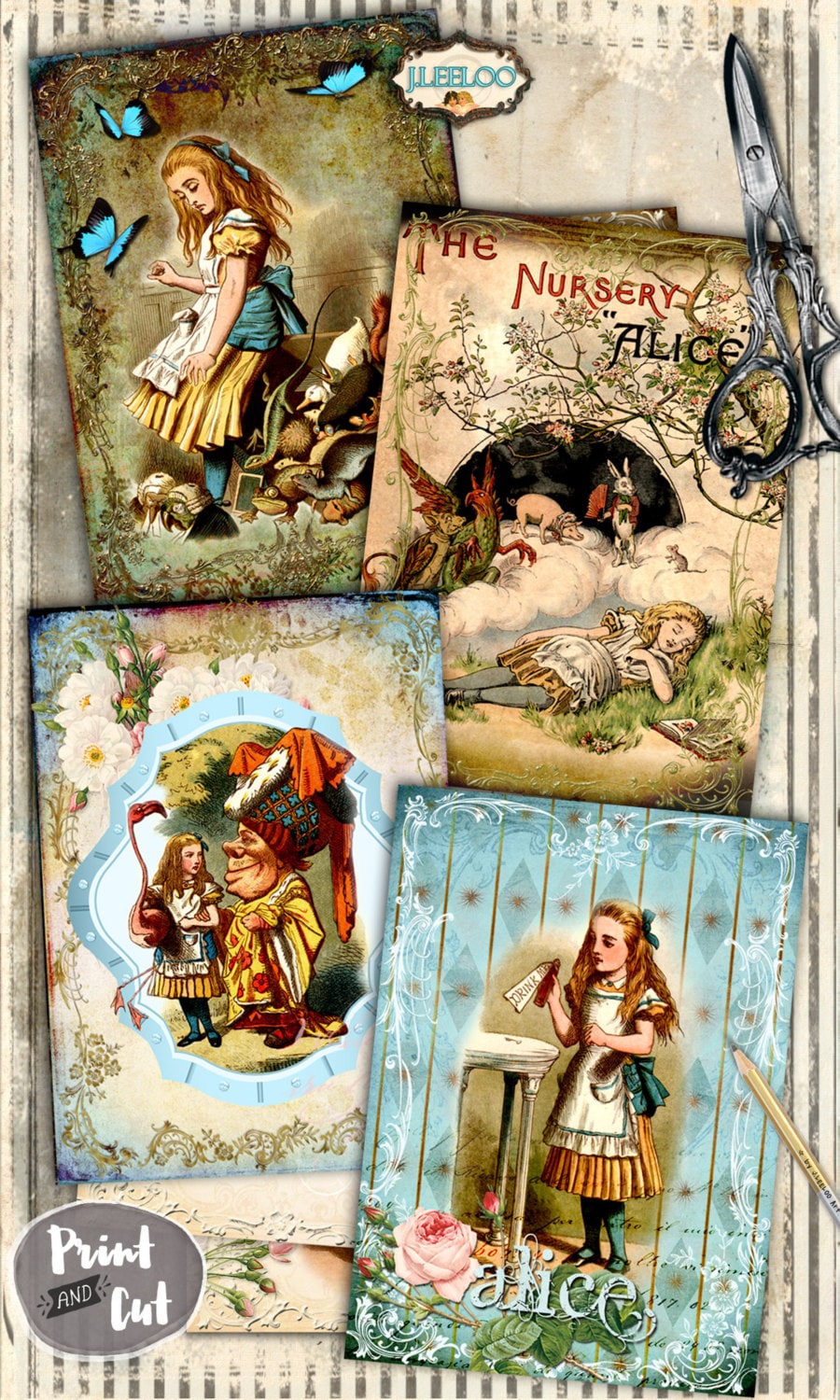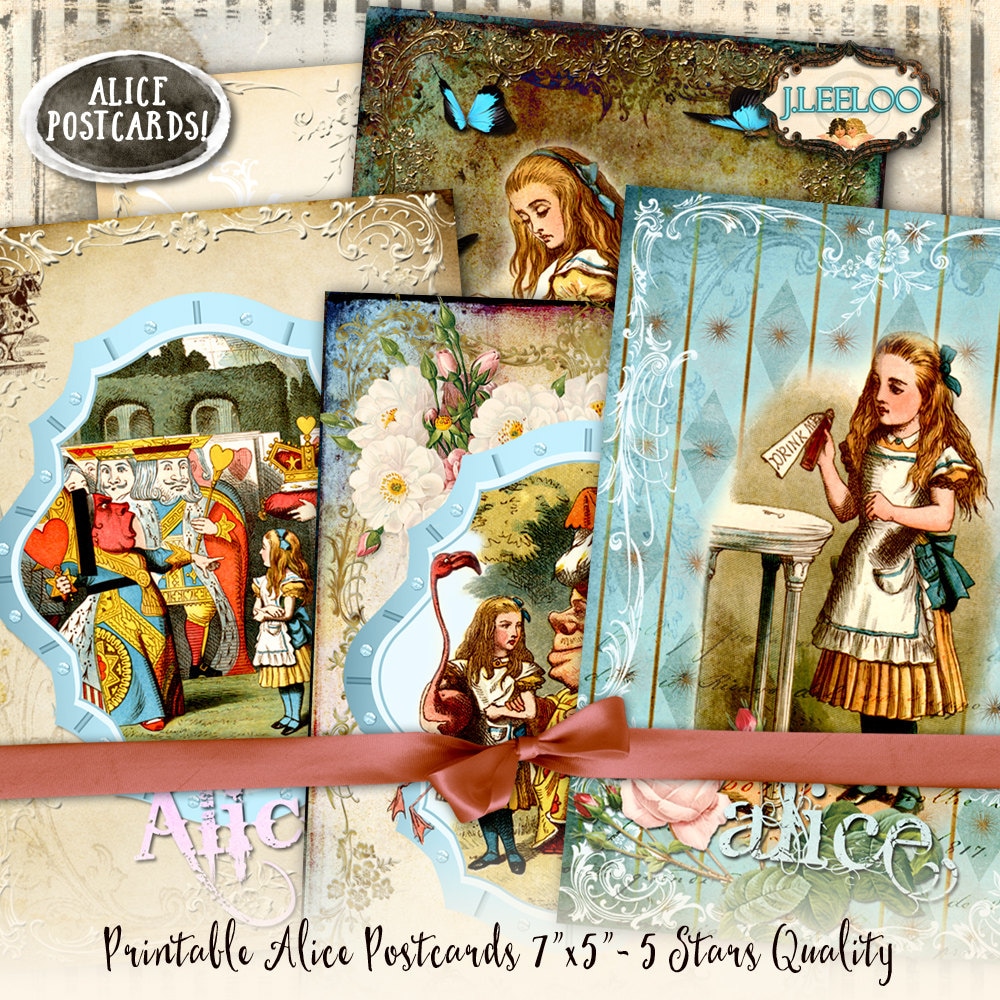 ALICE in WONDERLAND Postcard digital collage sheet - Printable instant download paper for your artwork - scrapbook, diary art, hang tags, jewelry holders, invitations or annuncements, greetings cards or backing cards.... for your creativity!