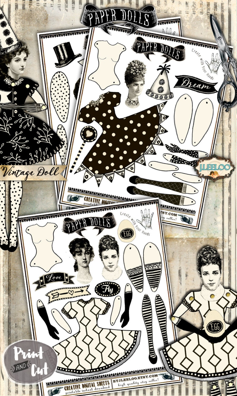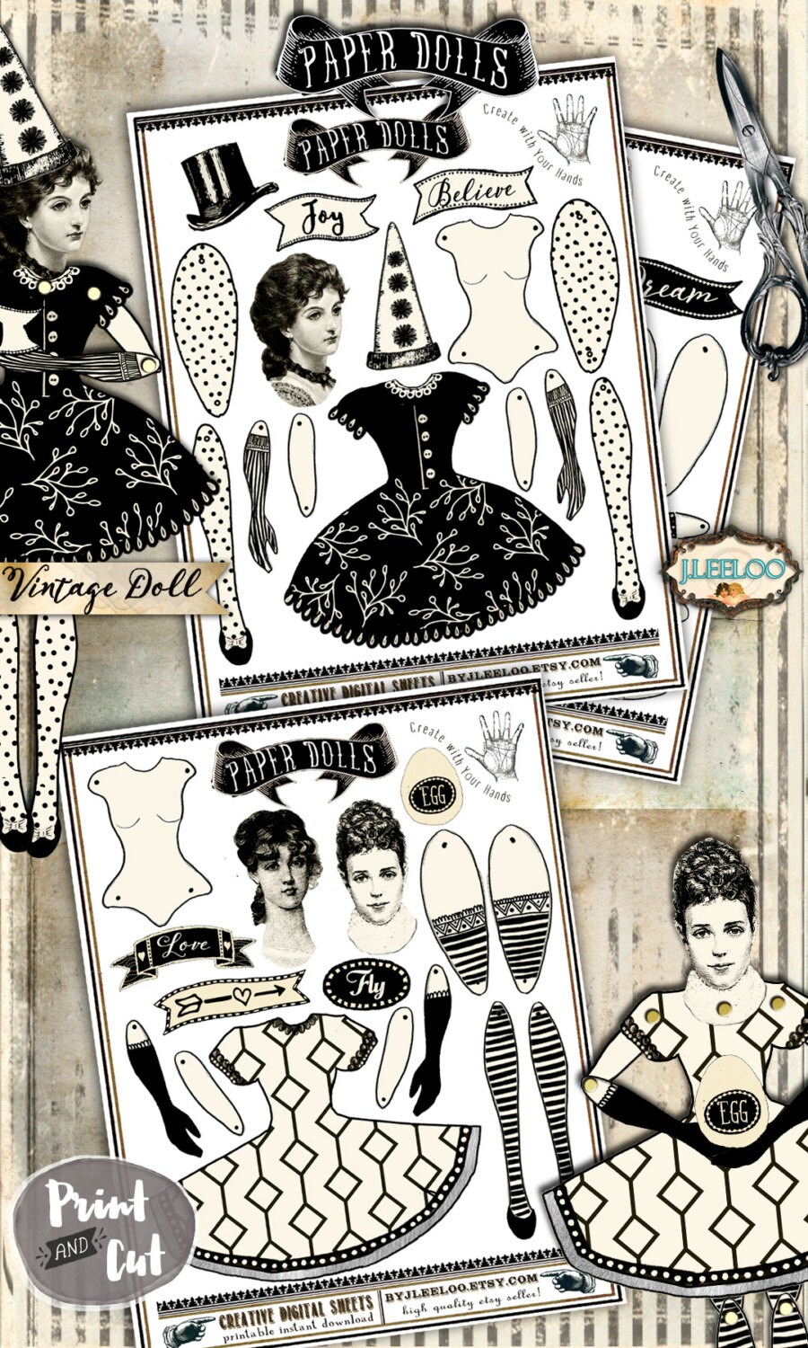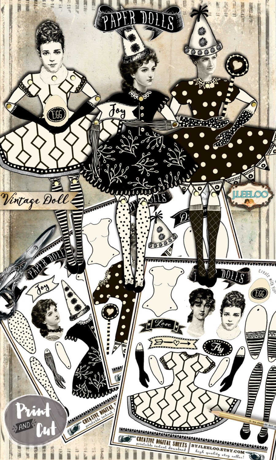 Digital collage sheets dolls - Digital papers hand-drawn printable paper dolls for your artwork and crafting project - Altered art, steampunk, scrapbook, vintage project etc... free your imagination!