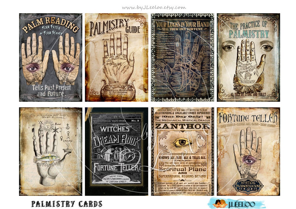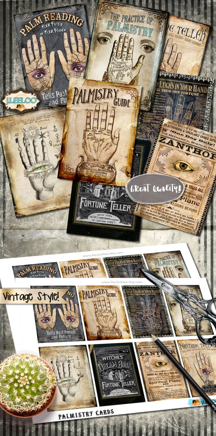 PALMISTRY CARDS Digital collage sheet - Printable halloween instant download paper for your artwork - scrapbook, diary art, hang tags, jewelry holders, invitations or annuncements, greetings cards or backing cards.... for your creativity!
