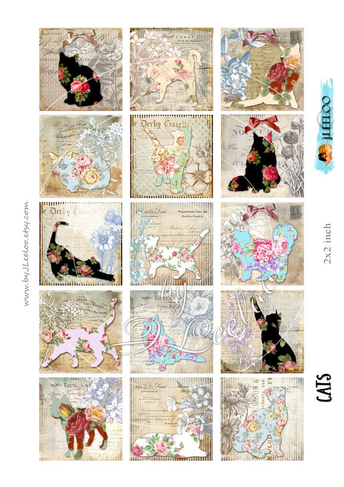 CATS Instant Download - Digital collage sheets - Square printable images for coaster, wood block, jewelry, glass cabochons, greeting cards, stickers, hang tags and all your artwork.