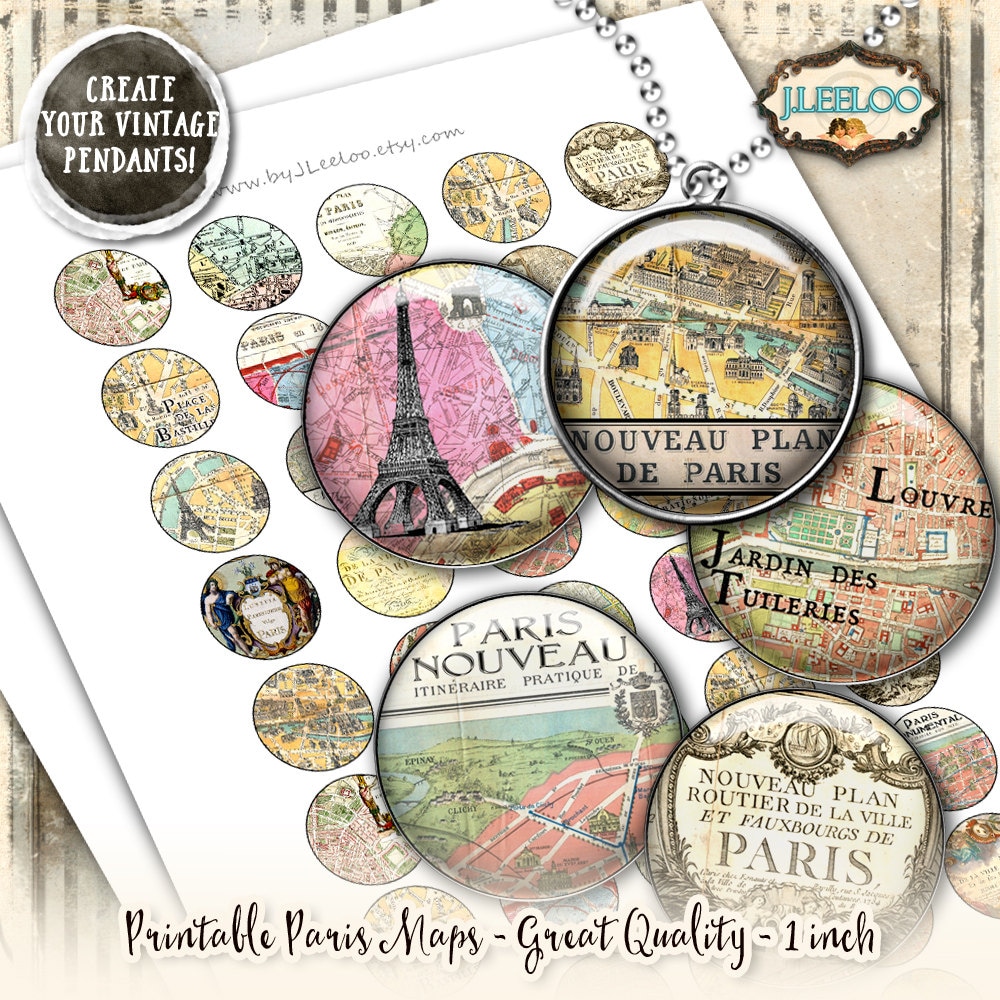 PARIS MAPS Digital collage sheets - Circle images download to print for jewelry, resin pendants, glass cabochon, charms, magnets, stickers, scrap book, hang tags, a great supply for your craft project.
