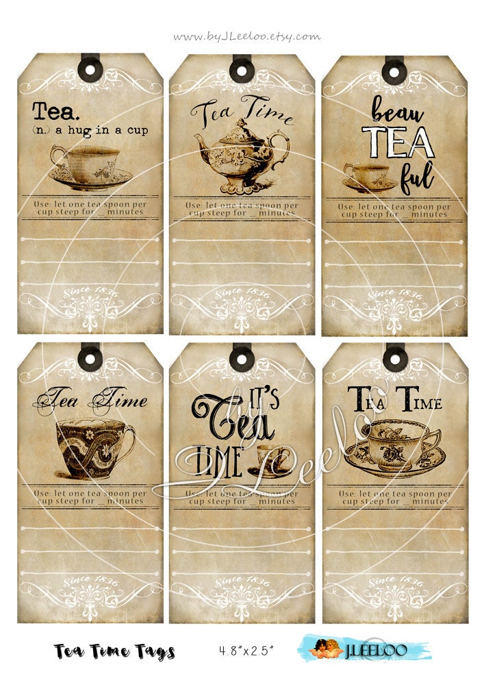 TEA TIME TAGS - Digital collage sheets: printable tags download and print for hang tags, labels, scrapbook, jewelry holders, cards, and your others craft project.