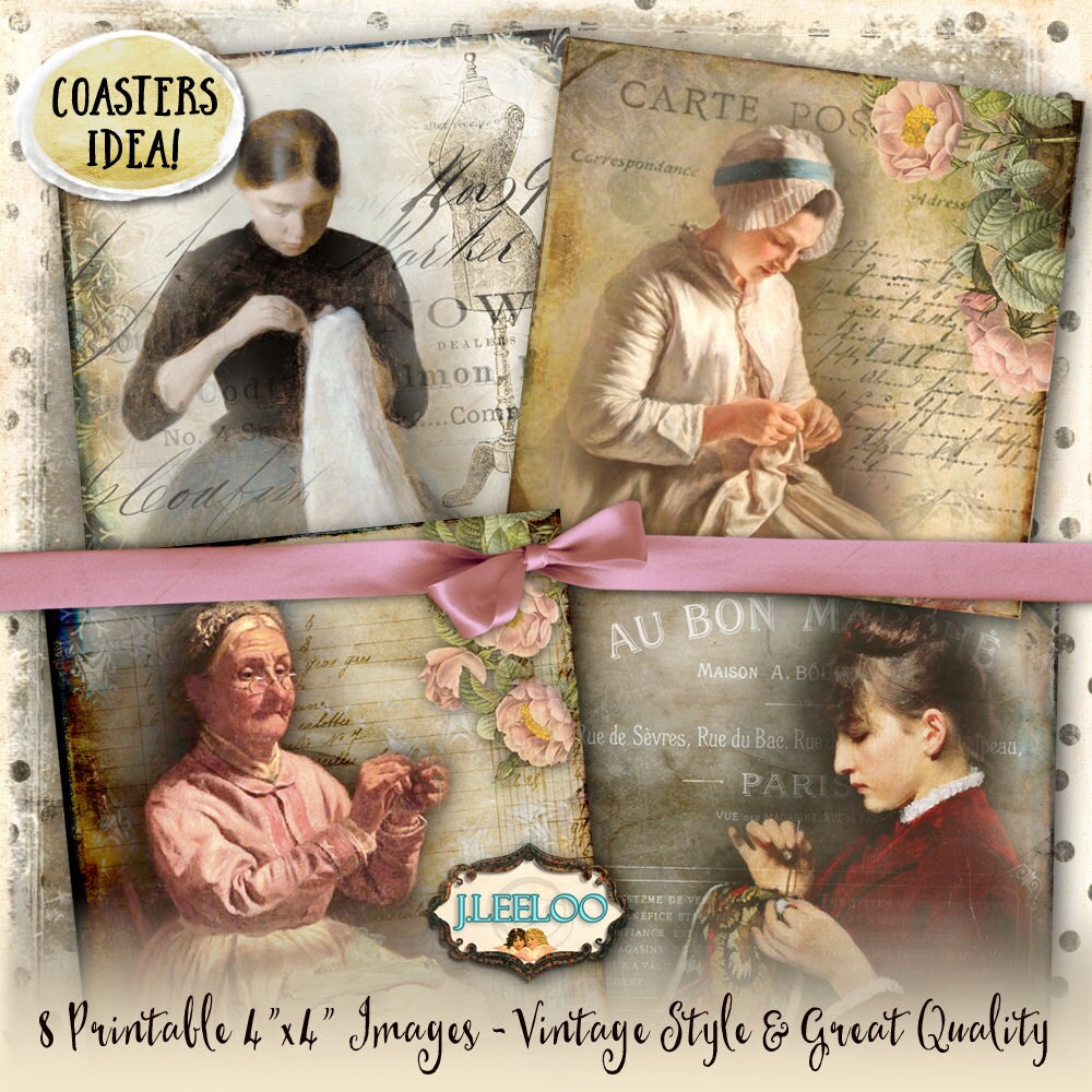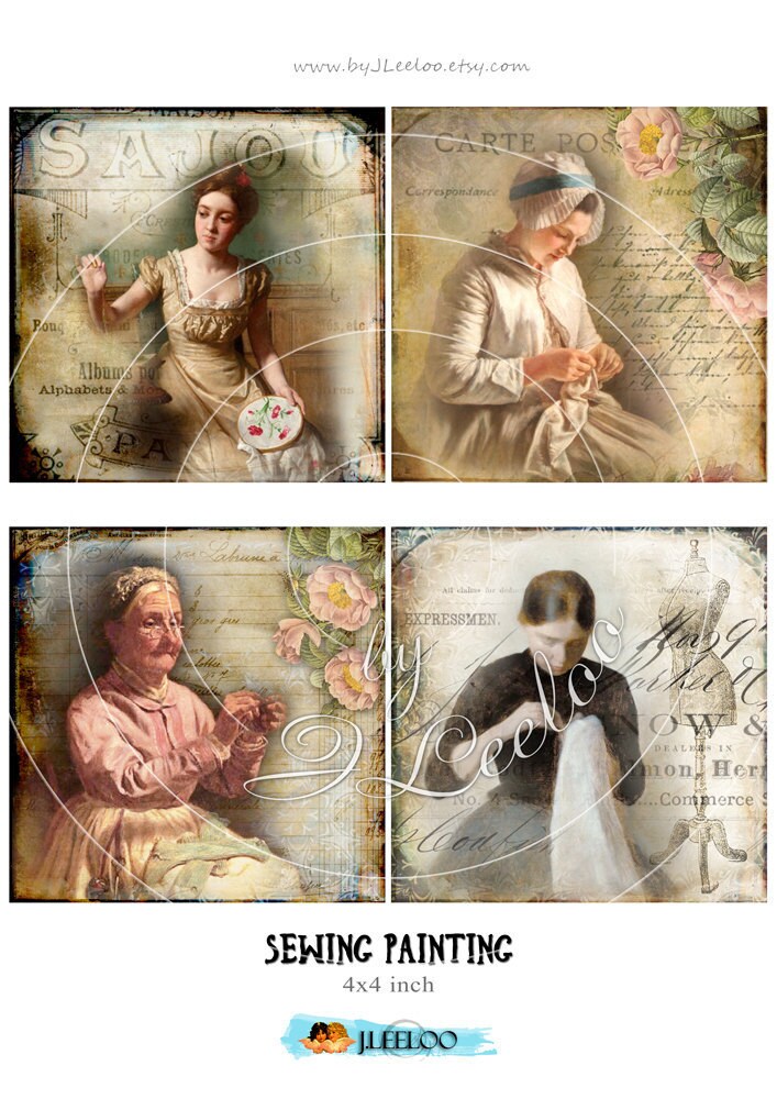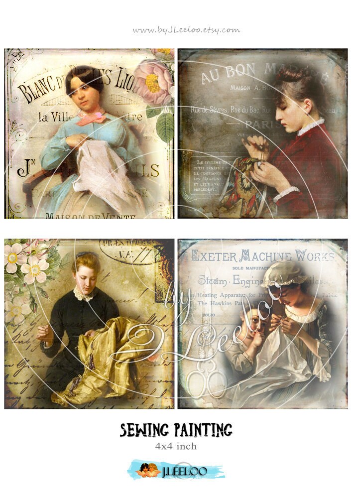 SEWING PAINTING 4x4 inch Instant Download - Digital collage sheets - Square printable images for coaster, jewelry, iron on, glass cabochons, bottle caps, stickers, hang tags and all your artwork.