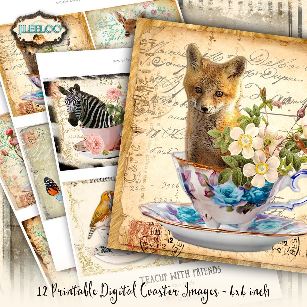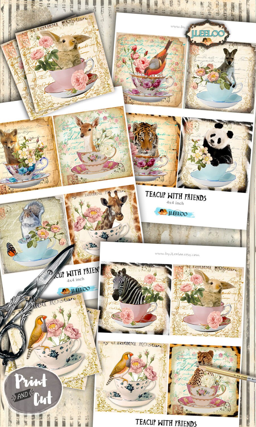 TEACUP WITH FRIENDS Digital collage sheets - Square images instant download ready to print for coaster, thank you cards or hang tags, your jewelry making, resin pendants, rings, earrings and button, for magnets, stickers, scrapbook and your others craft project.