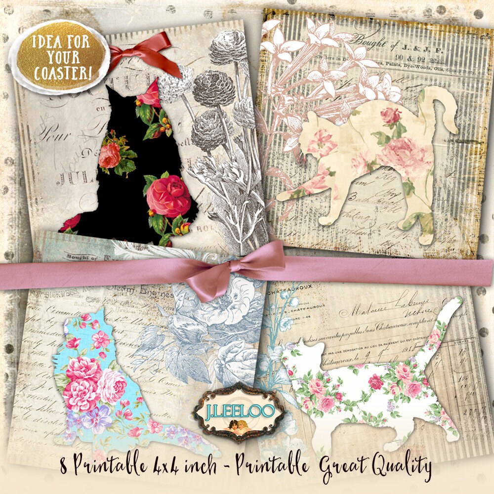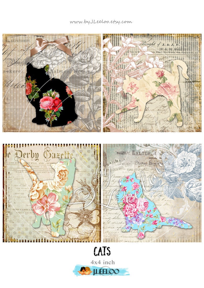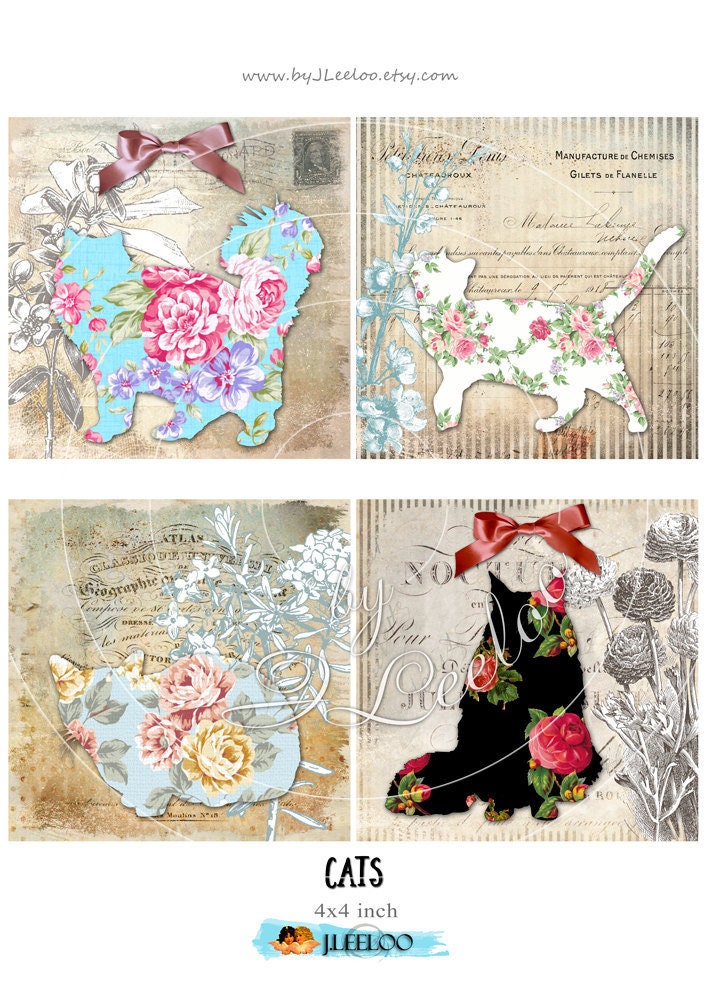 CATS Instant Download - Digital collage sheets - Square printable images for coaster, wood block, jewelry, glass cabochons, greeting cards, stickers, hang tags and all your artwork.