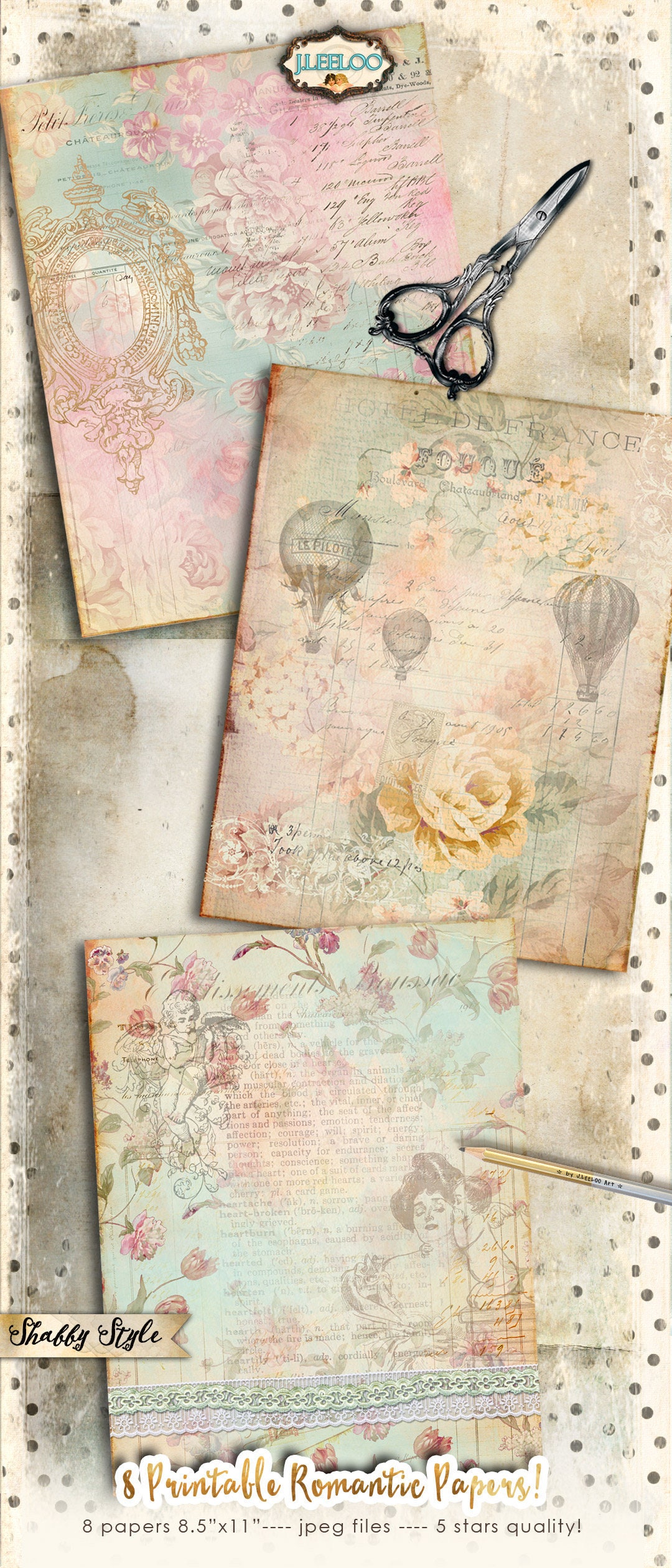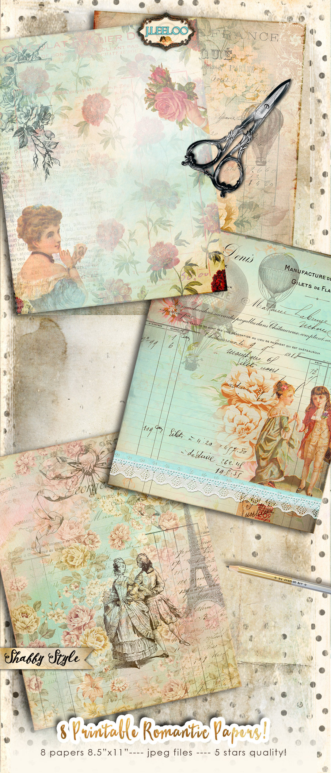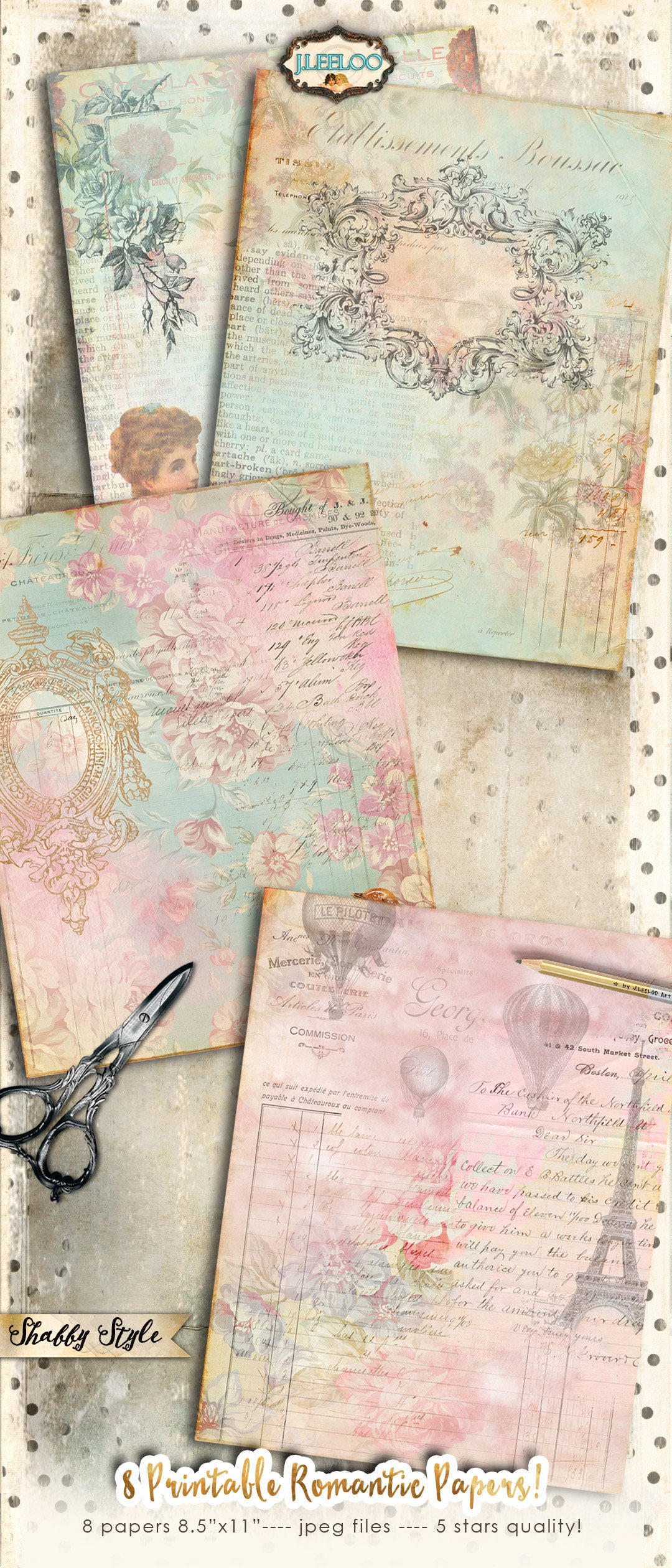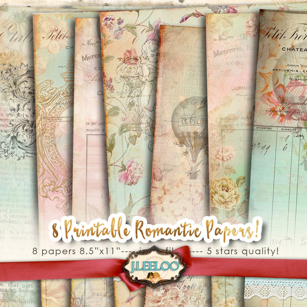 ROMANTIC Instant Download - Large Digital French Papers - Victorian digital papers for your crafting projects: scrapbook, background, diary, iron-on transfer, card making.... print it as many time as you want.