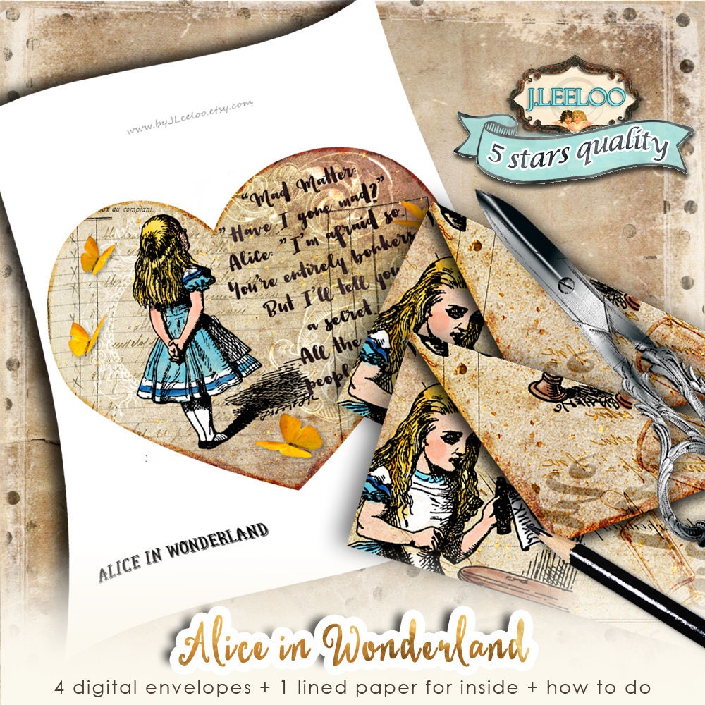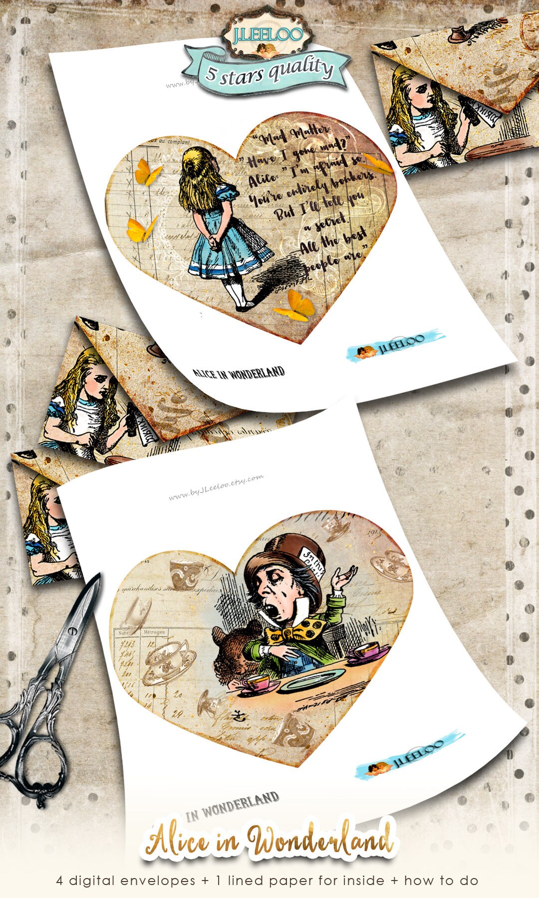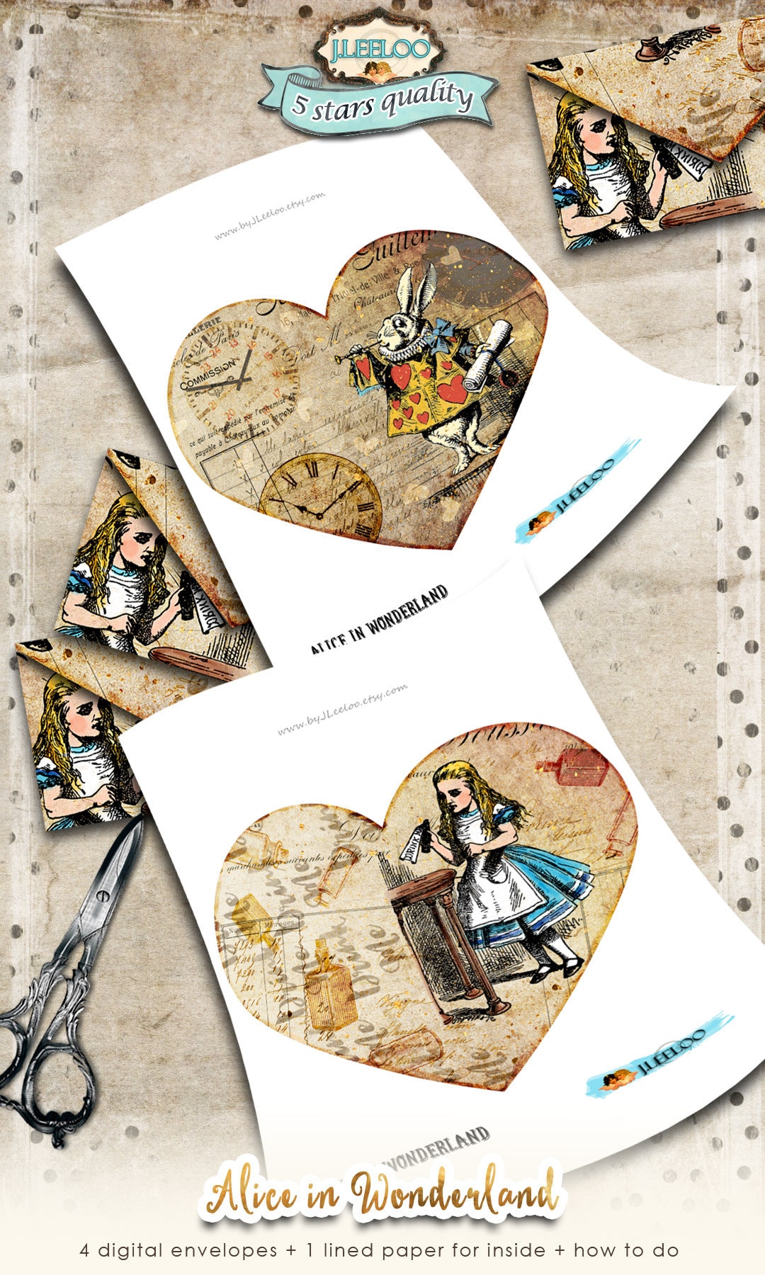 ALICE in WONDERLAND envelopes heart gift for her download and print for scrapbook, journal art, diary, invitation party, labels, scrapbook, jewelry holders and your others craft projects.