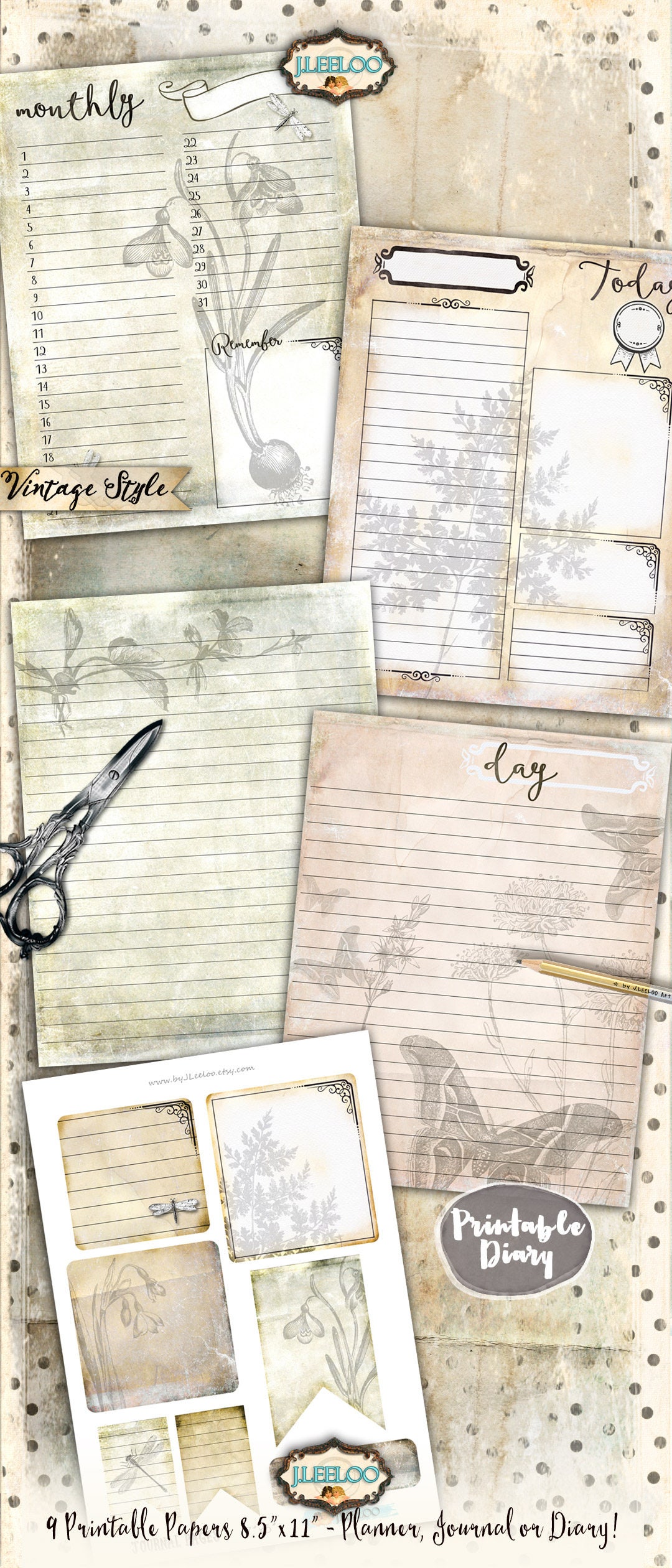 JOURNAL PAGES Instant Download - Digital collage sheets pack - Editable week monthly printable organizer vintage documents digital paper - Large images for scrapbook, background, artwork.