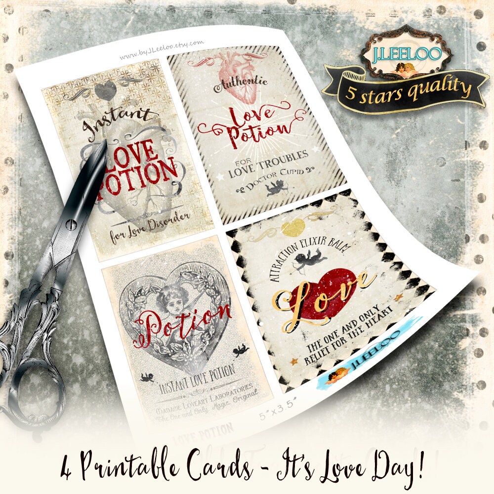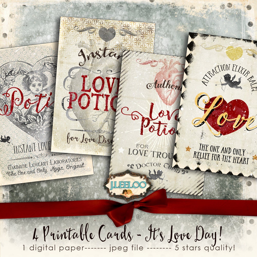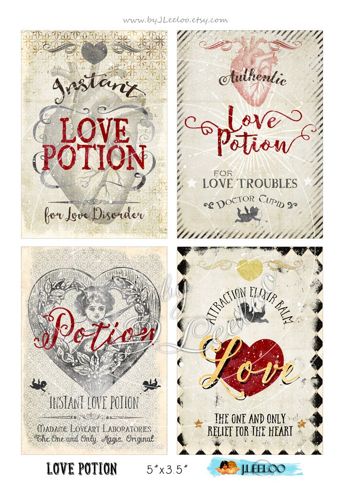 LOVE POTION vintage background Printable digital collage sheet - Valentine's cards for your artwork: postcards, scrapbook, diary art, hang tags, jewelry holders, invitations or annuncements, greetings cards or backing cards.... for your creativity!