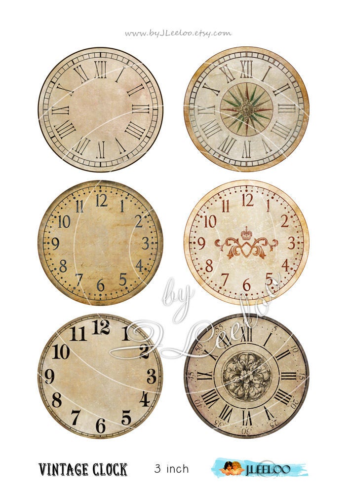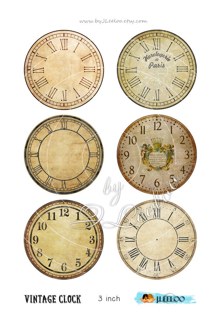 VINTAGE CLOCK Instant download printable clock faces - vintage digital collage sheets - circle images for your crafting project - jewelry, resin pendants, glass cabochons, hang tags, rings, earrings and all your need for your art.