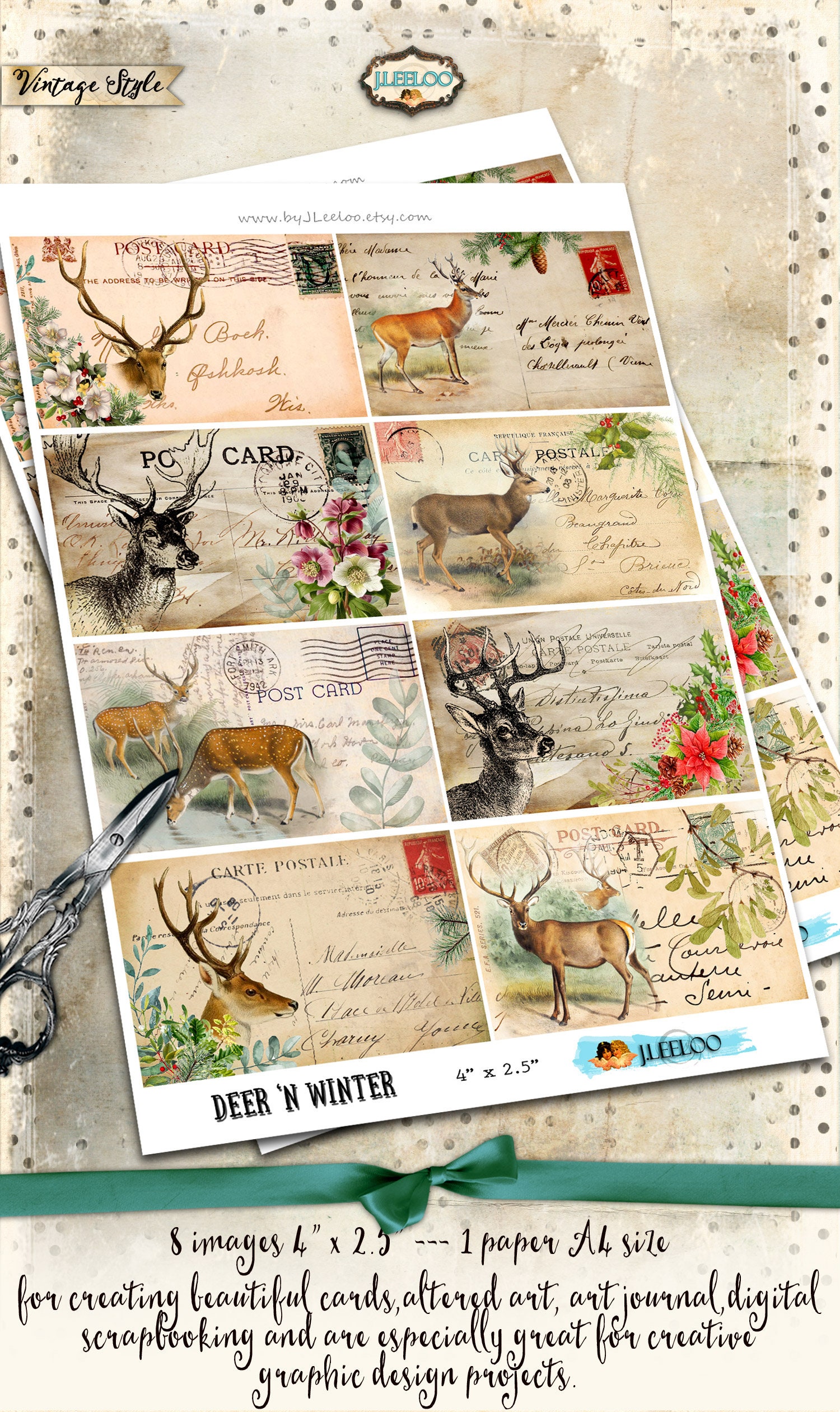 DEER N WINTER - Digital collage sheets: download labels and print for paper craft gift tags vintage ephemera scrapbook downloadable graphic