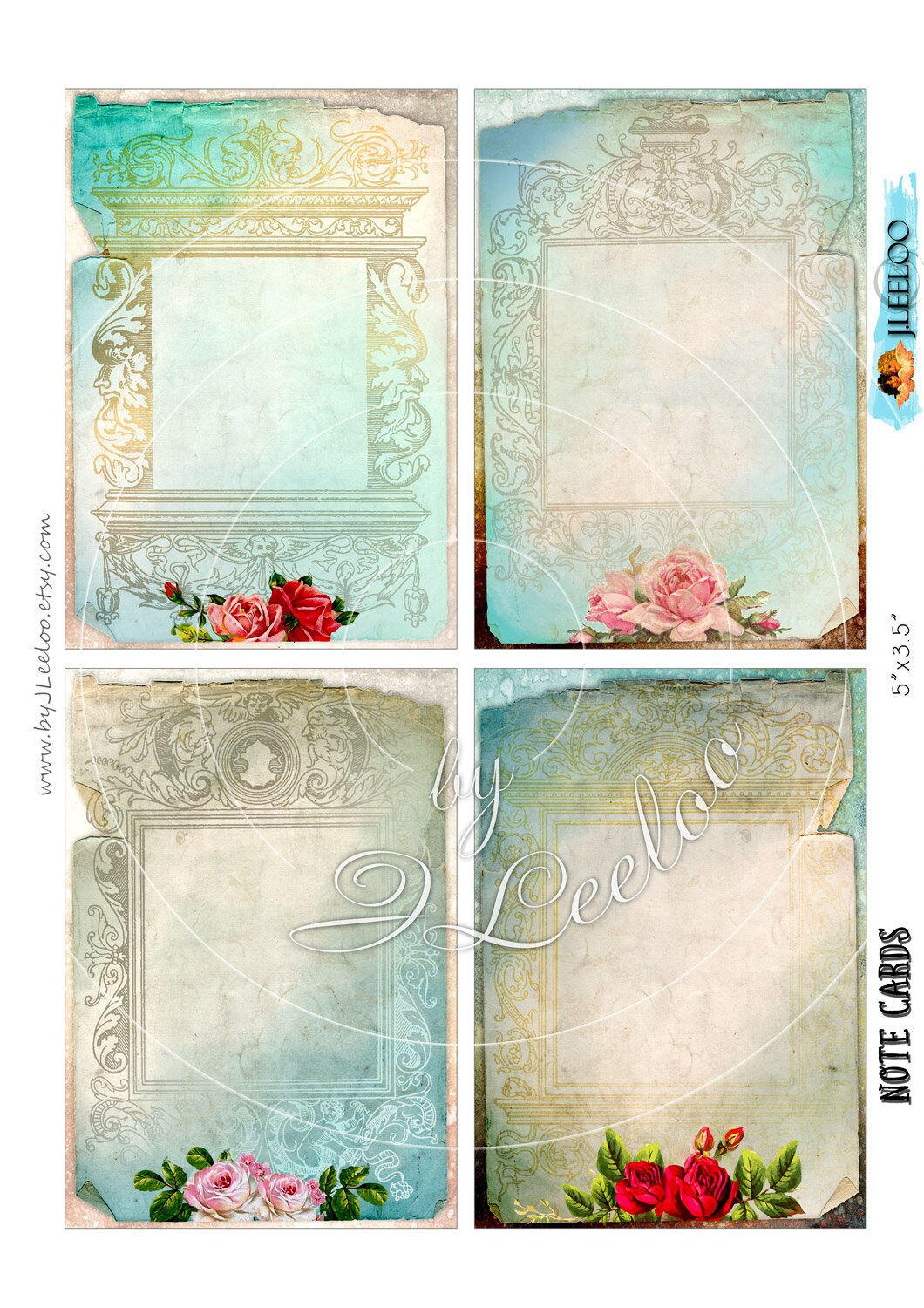 NOTE CARDS Digital collage sheet - Editable shabby chic vintage digital papers ledger : images for your diary, artwork, postcards, hang tags, invitations, greeting cards, announcements, scrapbook, backing cards.... all for your crafting project!