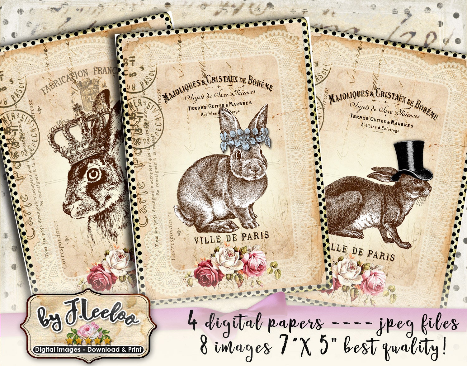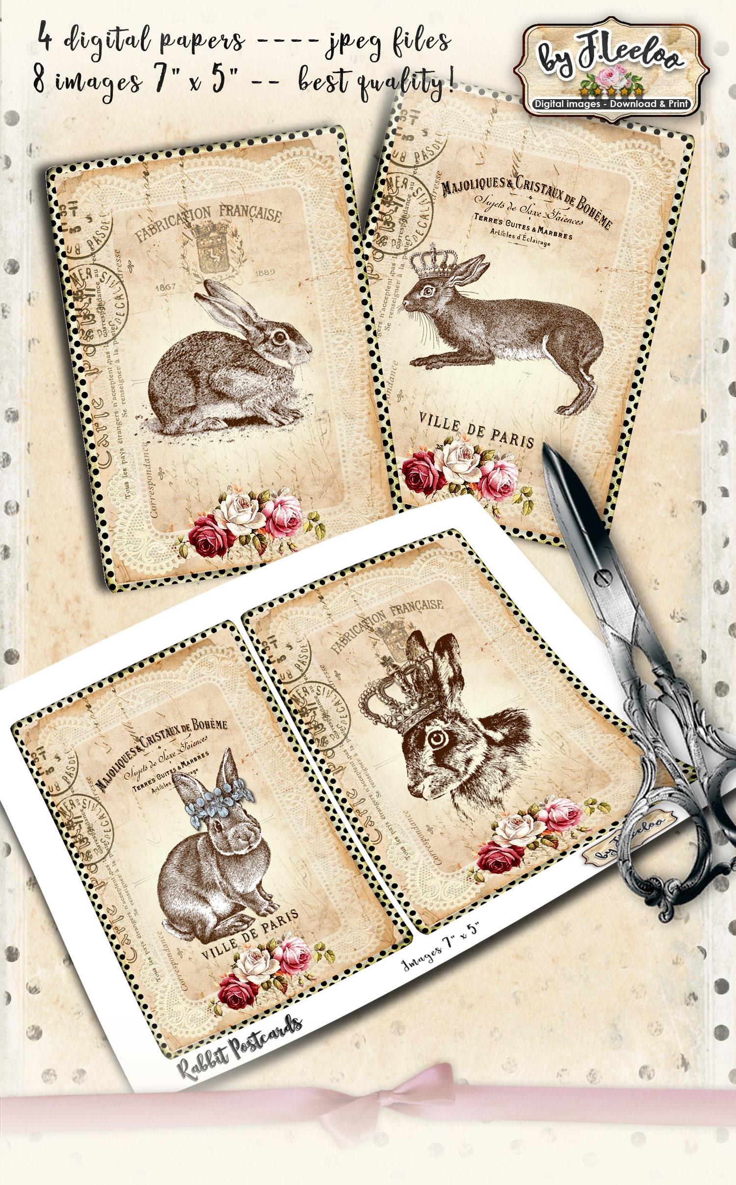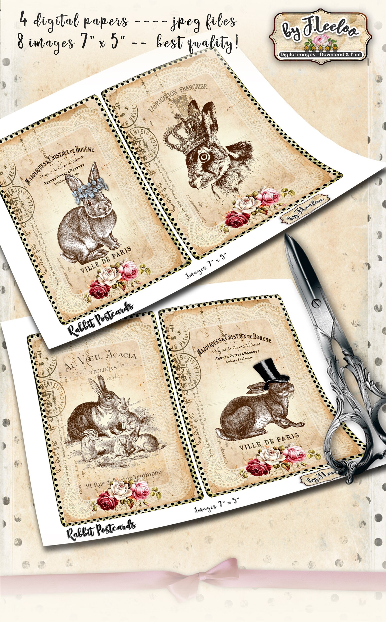 RABBIT POSTCARD printable Easter bunny 5x7 inch digital sheet ephemera vintage scrapbook instant download