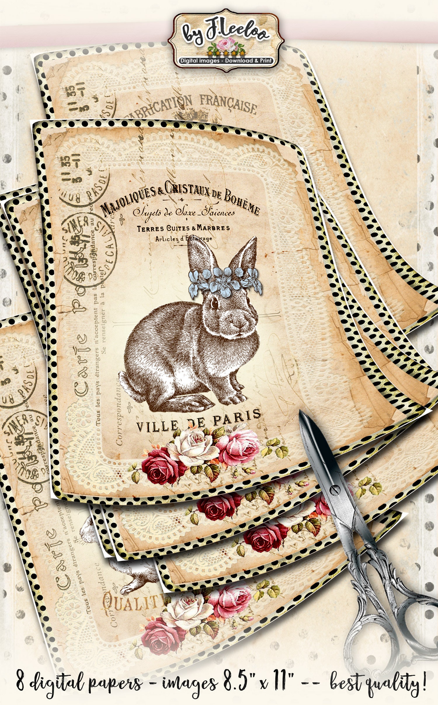 RABBIT POSTER 8 large 8.5 x 11 inch papers journal art crafting tattered backgrounds scrapbooK instant download printable diary.