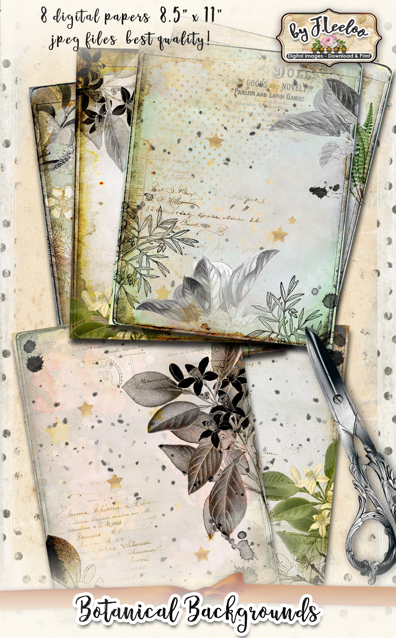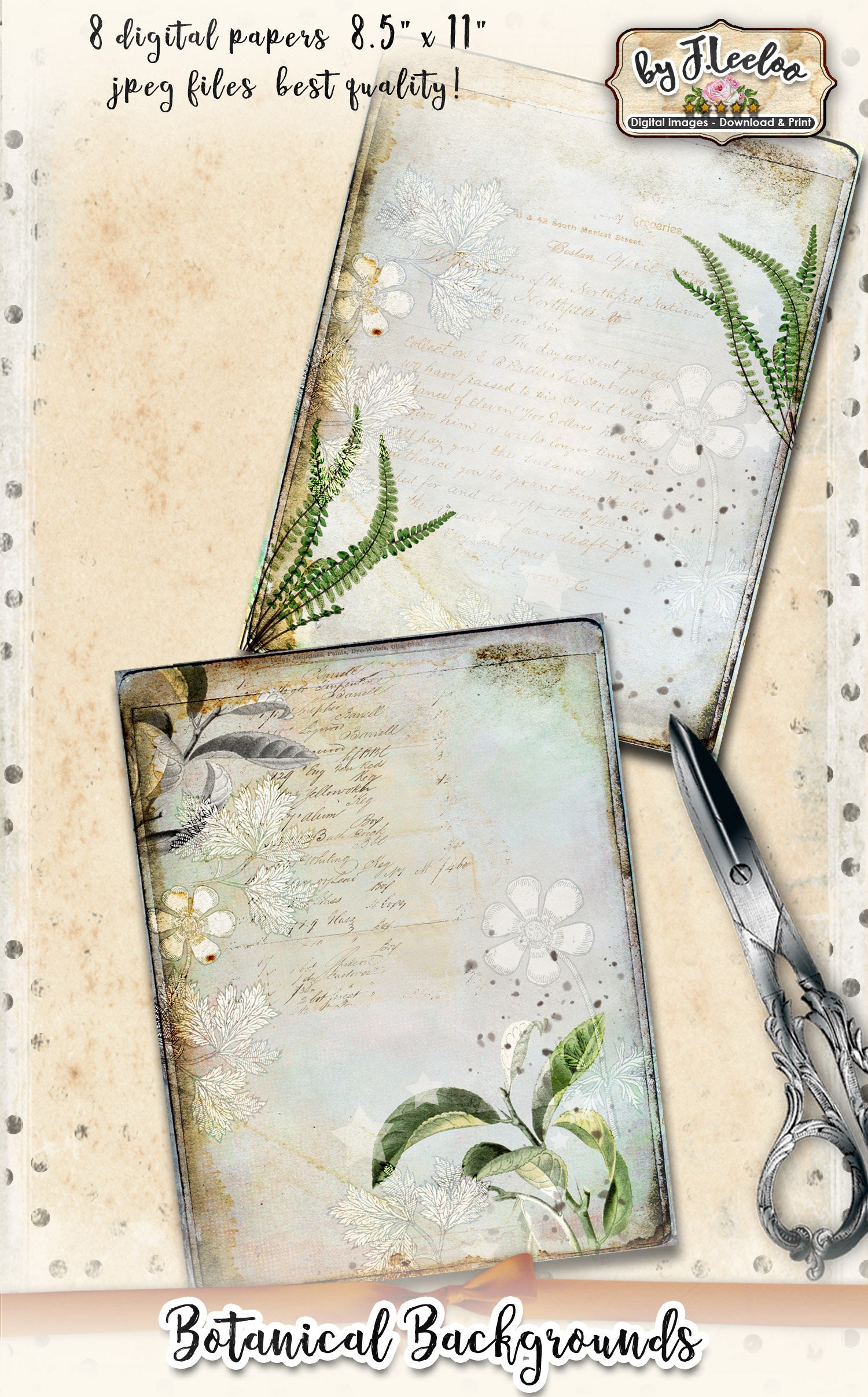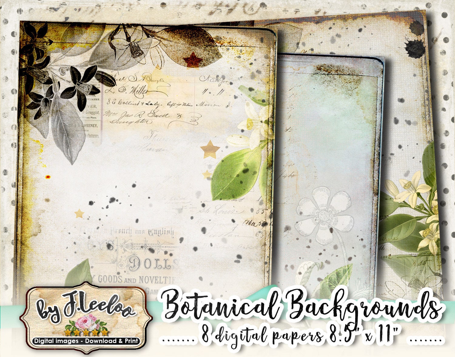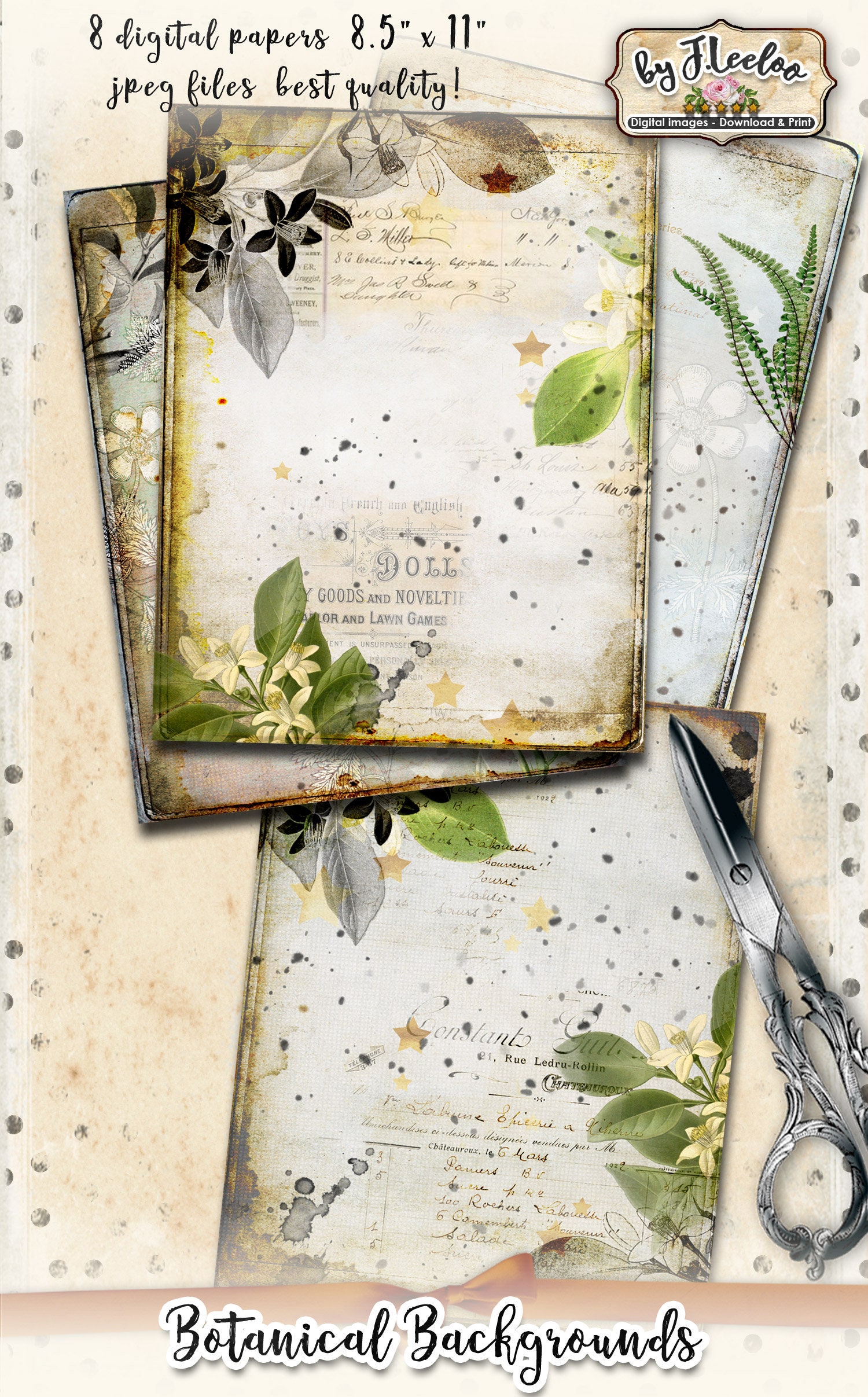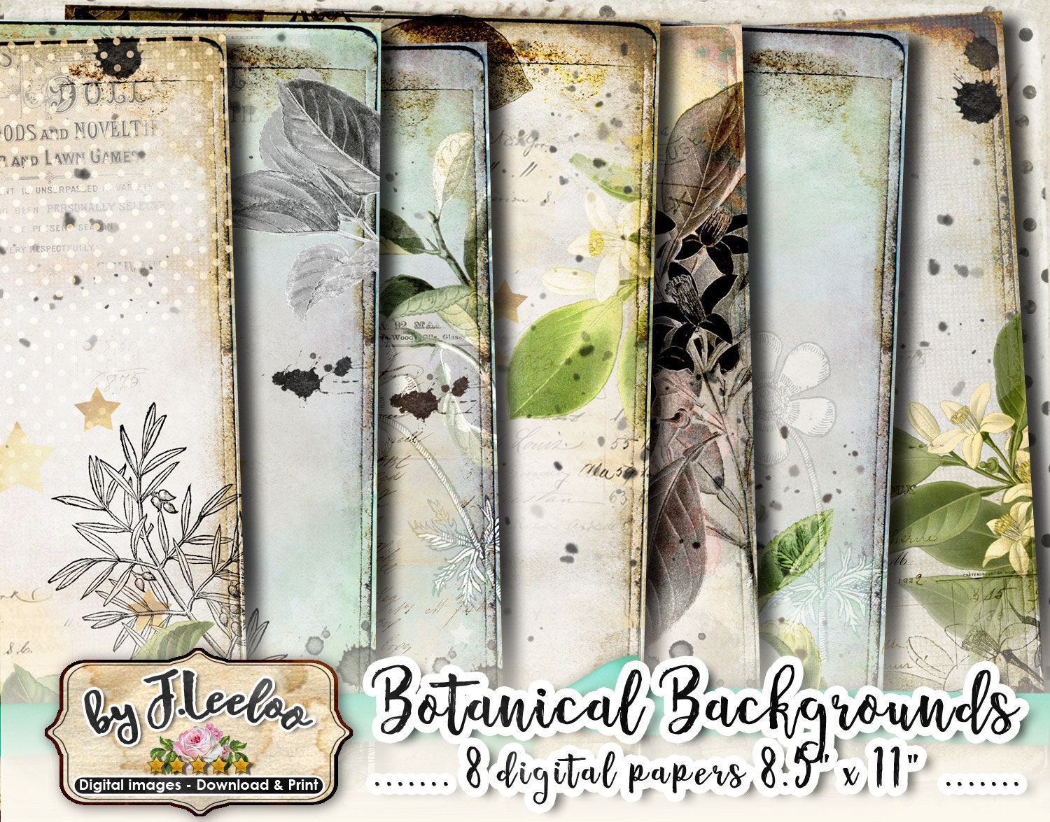 BOTANICAL Instant Download - Large Digital Distressed Papers - Dirty digital papers for your crafting projects: scrapbook, background, diary, iron-on transfer, card making.... print it as many time as you want.