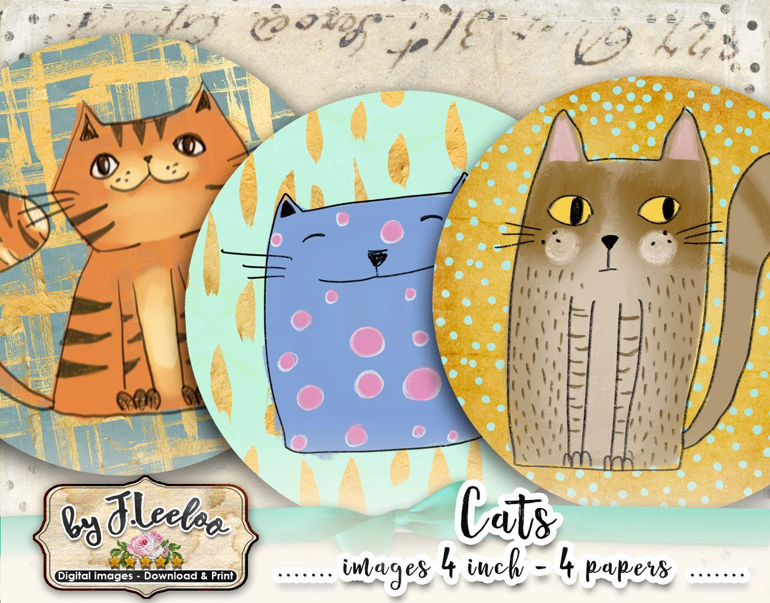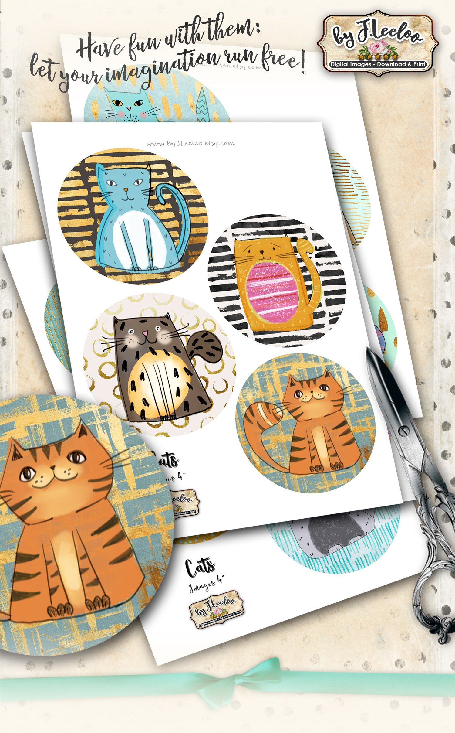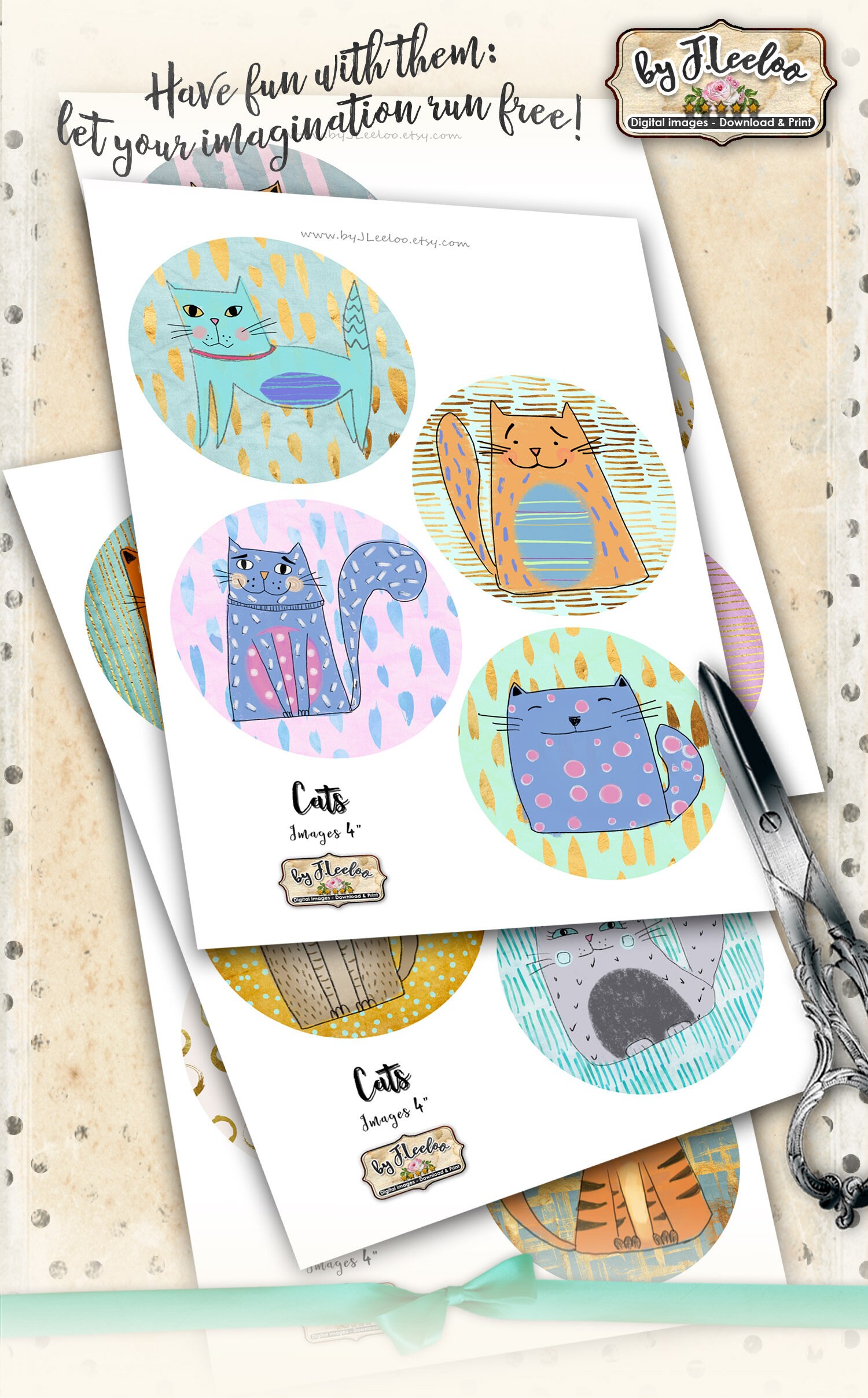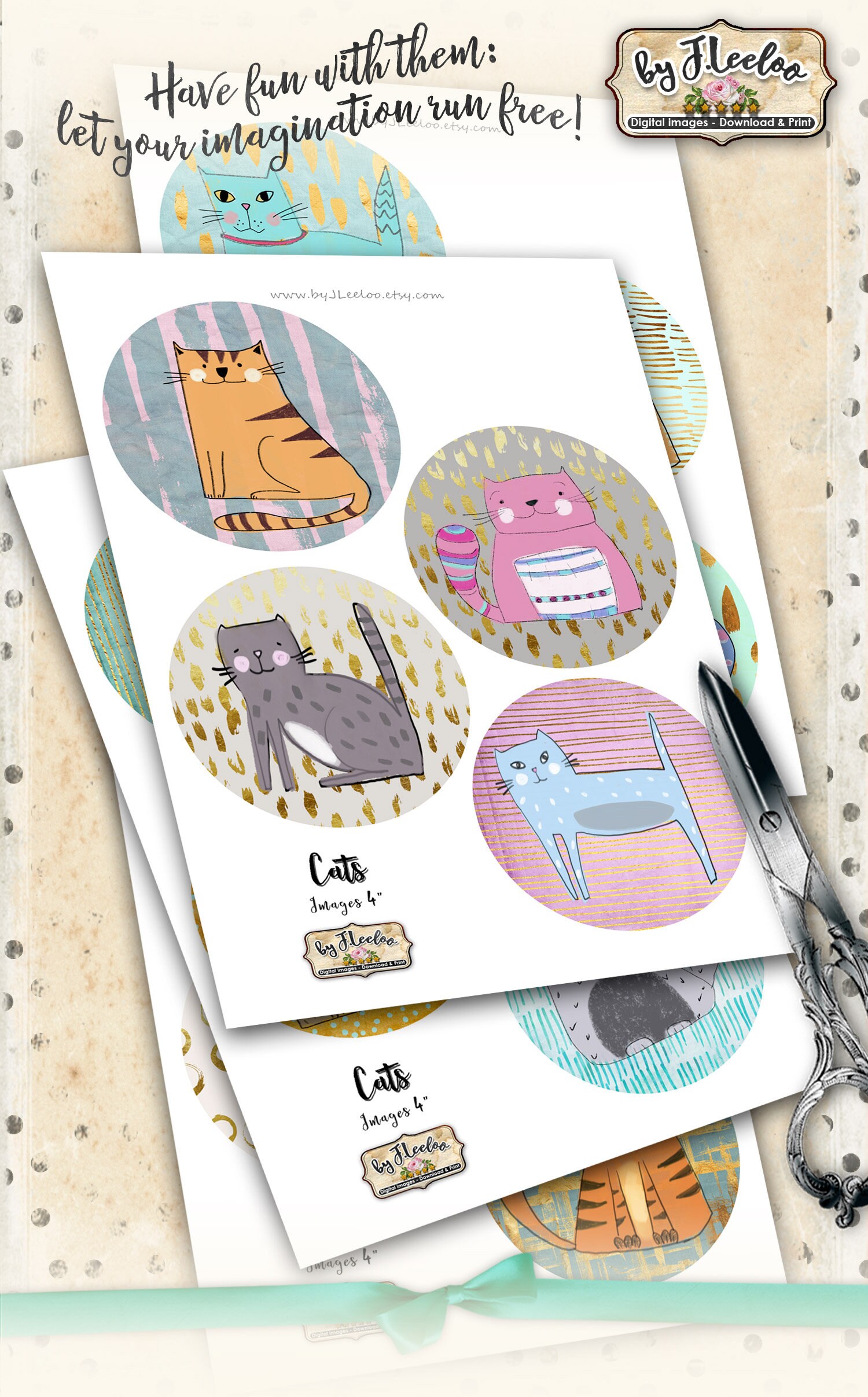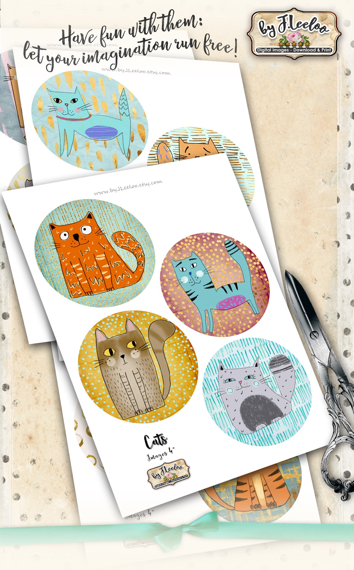 CATS Hand drawn Digital collage sheets - Circles images instant download ready to print for coaster, thank you cards or hang tags, your jewellery making, for magnets, stickers, scrapbook and your others craft project.