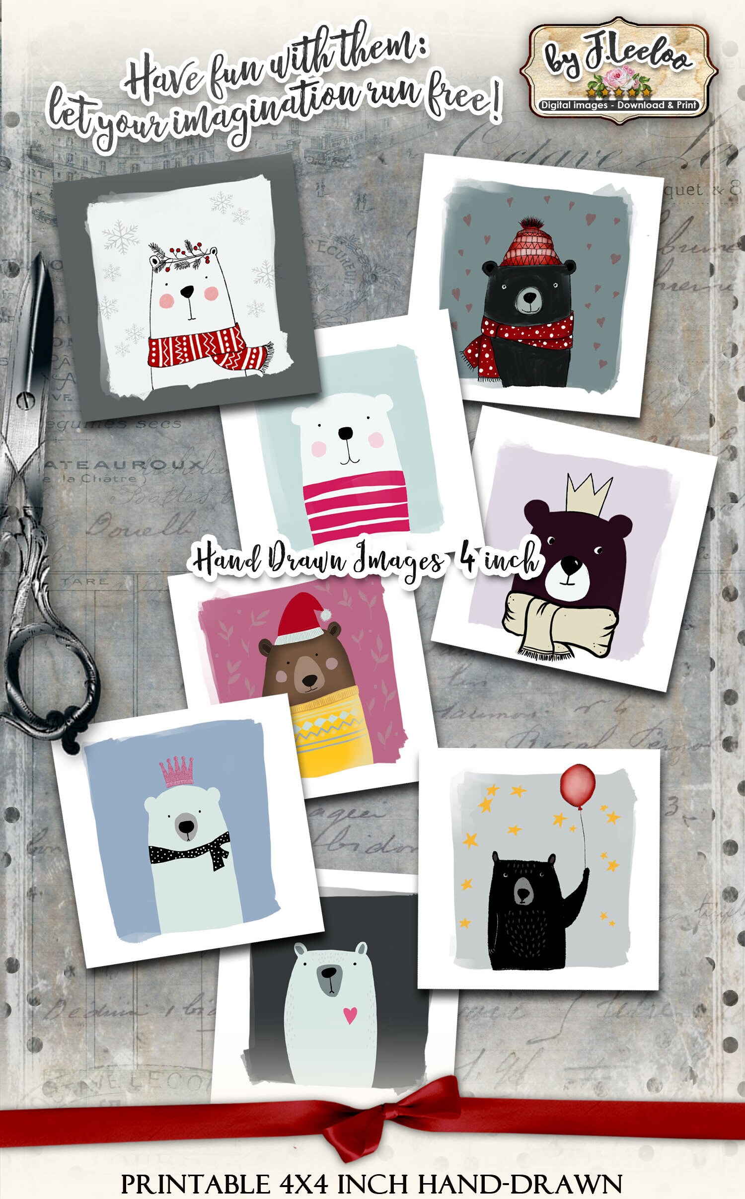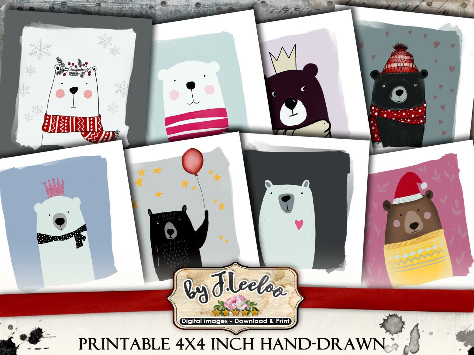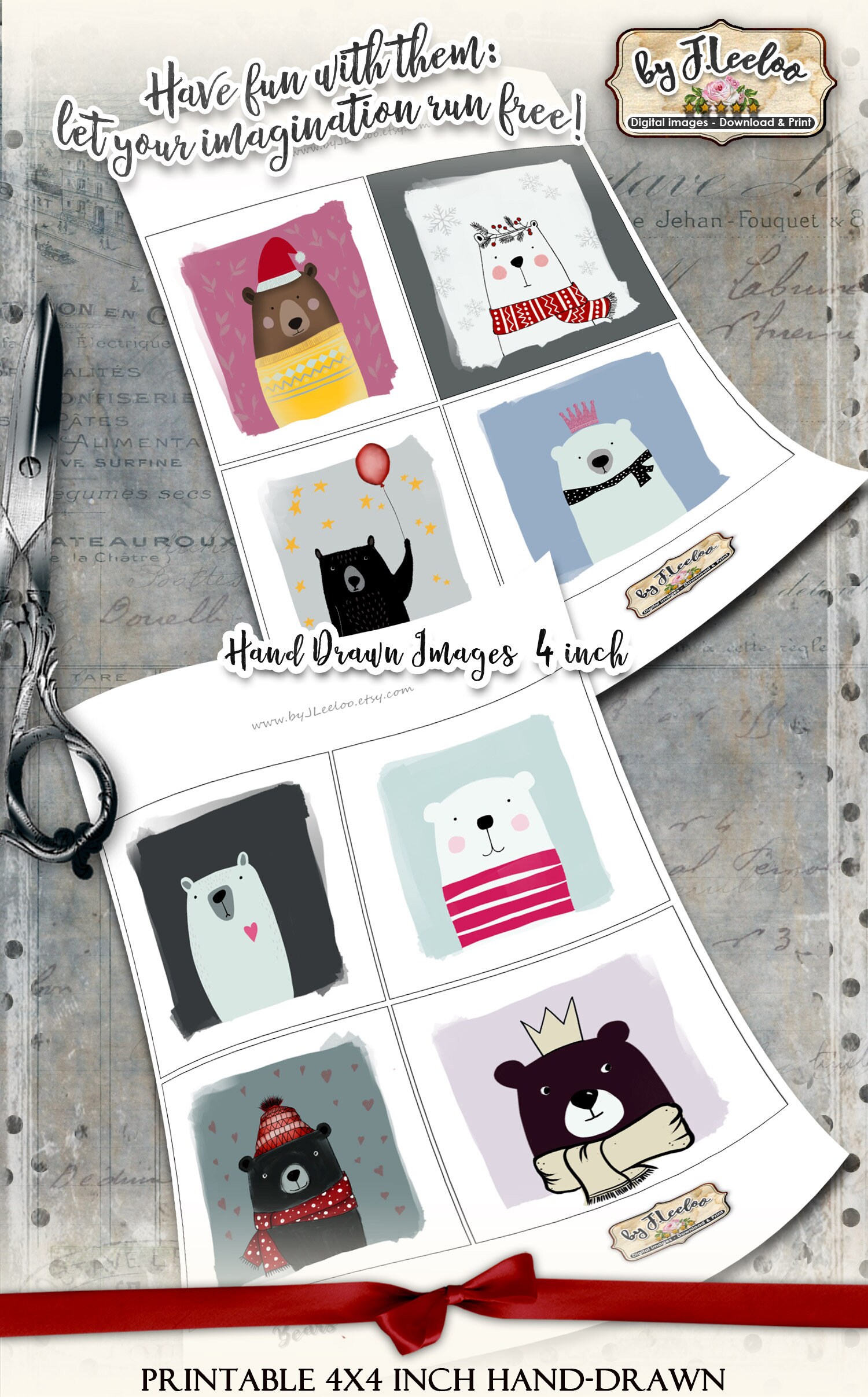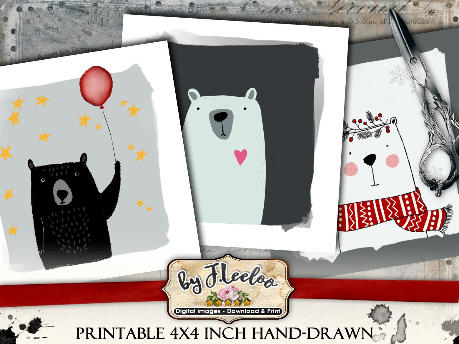 BEARS ILLUSTRATION hand-drawn Instant Download - Digital collage sheets - Square printable images for coaster, jewelry, glass cabochons, bottle caps, stickers, hang tags and all your artwork.