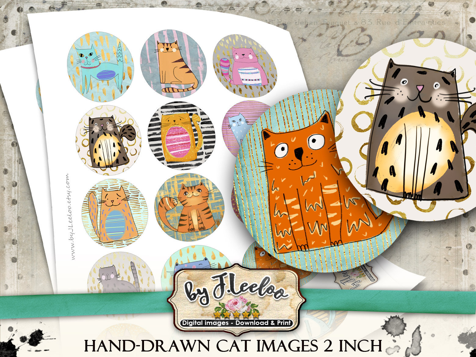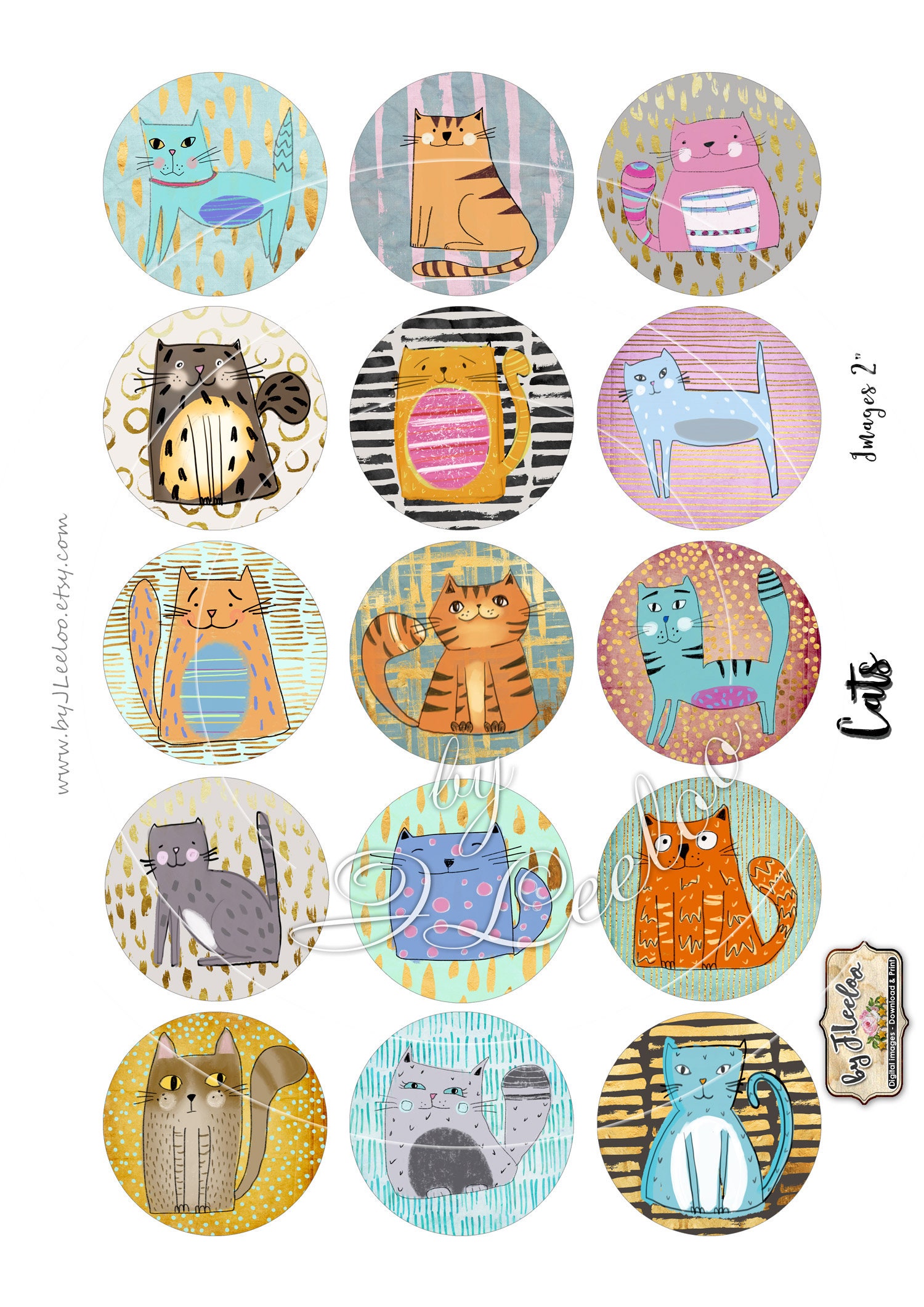CATS Hand drawn Digital collage sheets - Circles images instant download ready to print for coaster, thank you cards or hang tags, your jewellery making, for magnets, stickers, scrapbook and your others craft project.