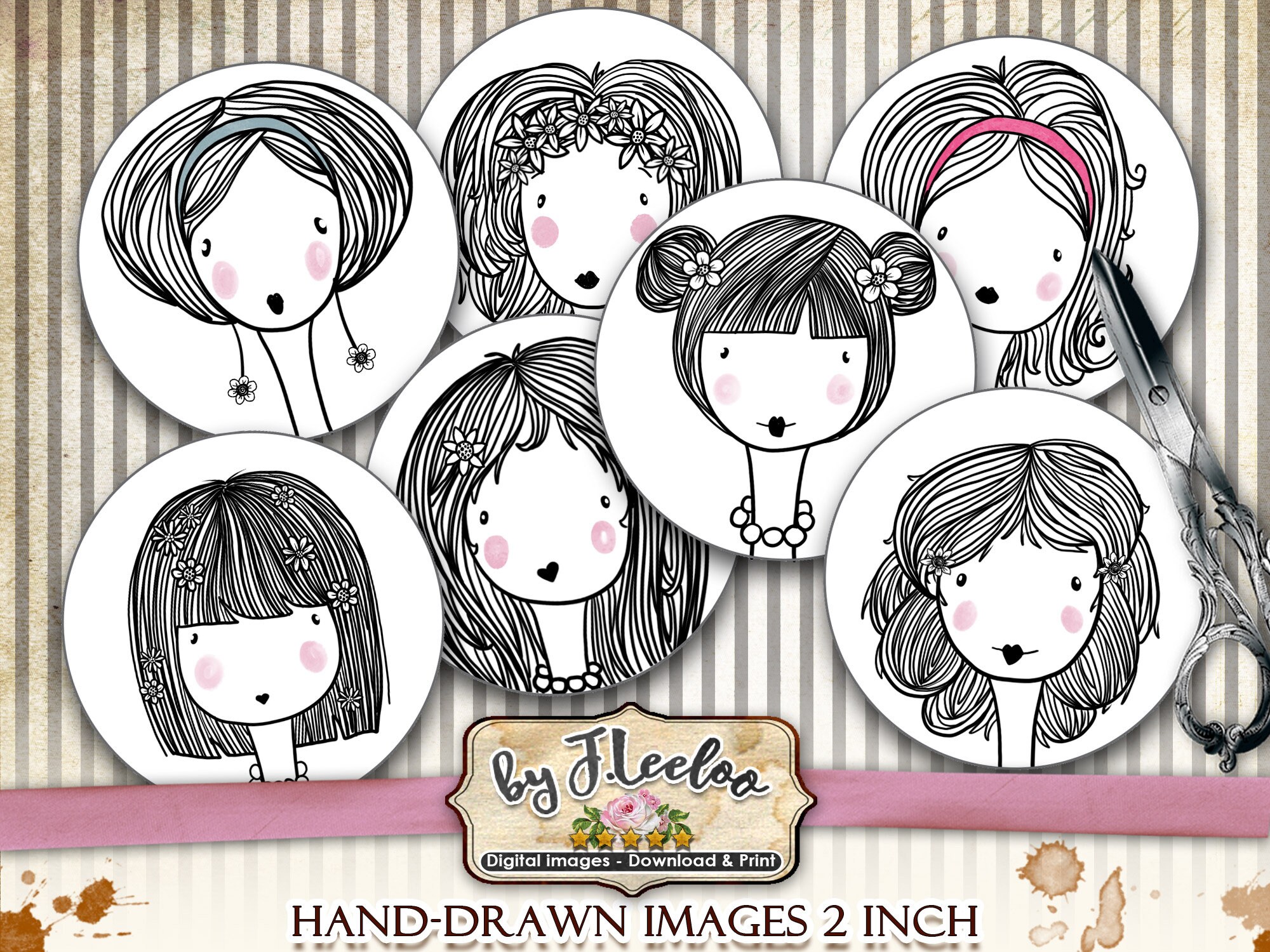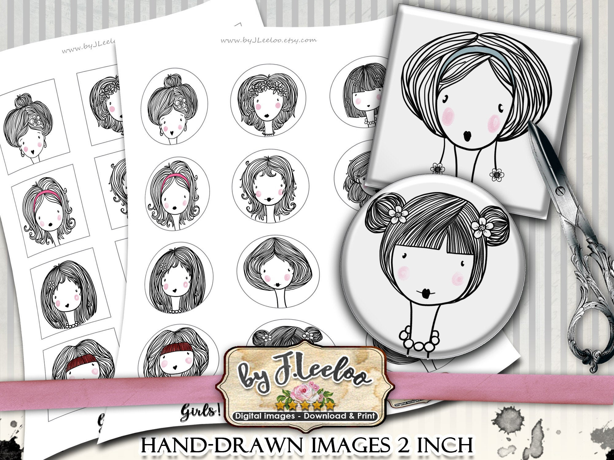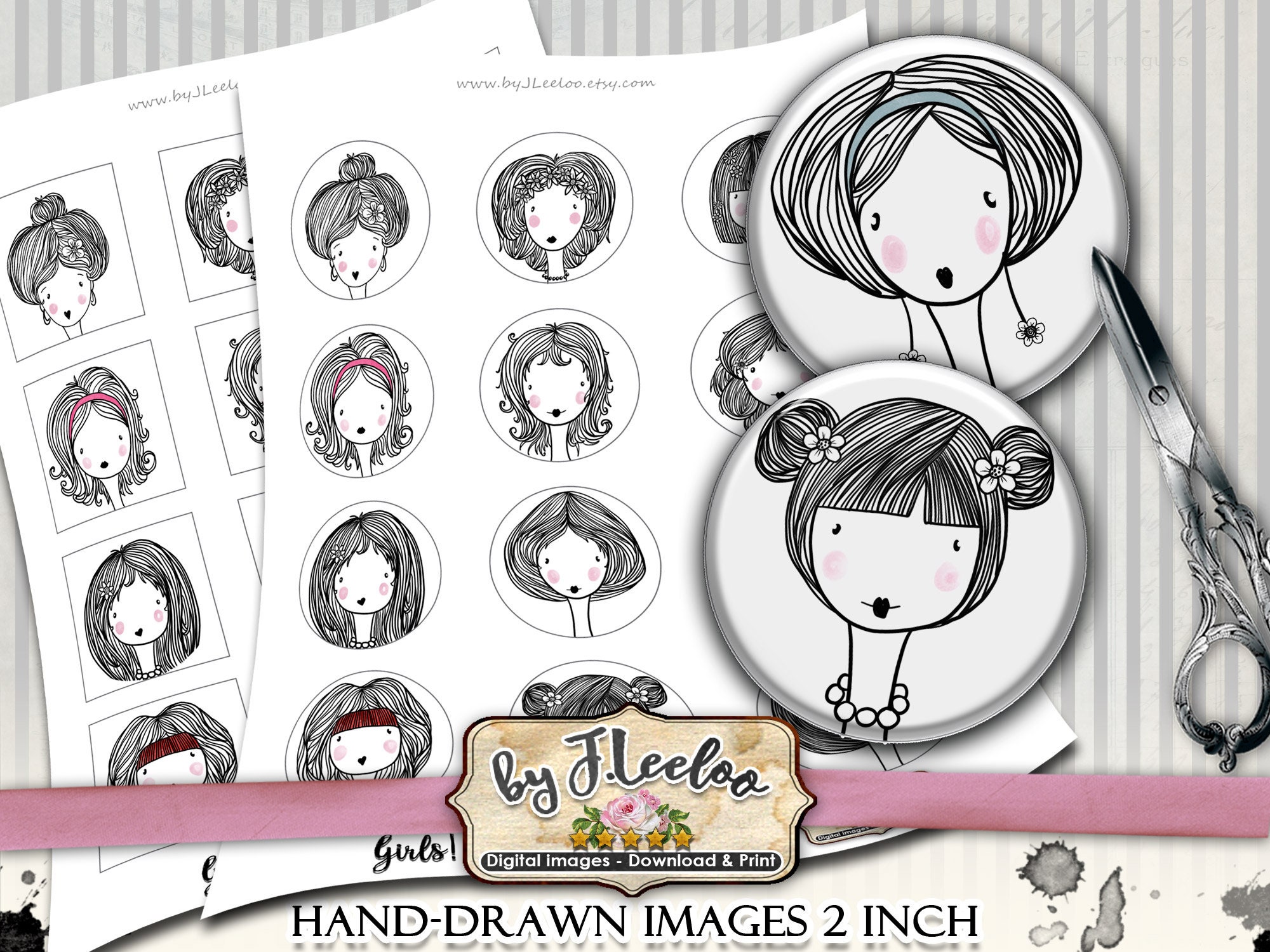 GIRLS - Hand-drawn Instant Download Digital collage sheets printable - Digital paper circle digital images 2 inch for pendants, jewelry and your craft and artwork.