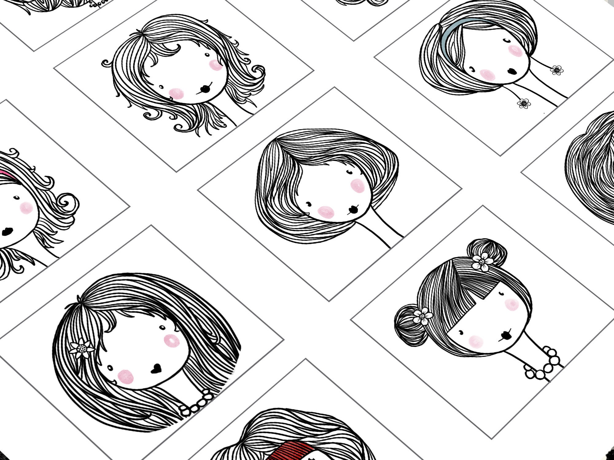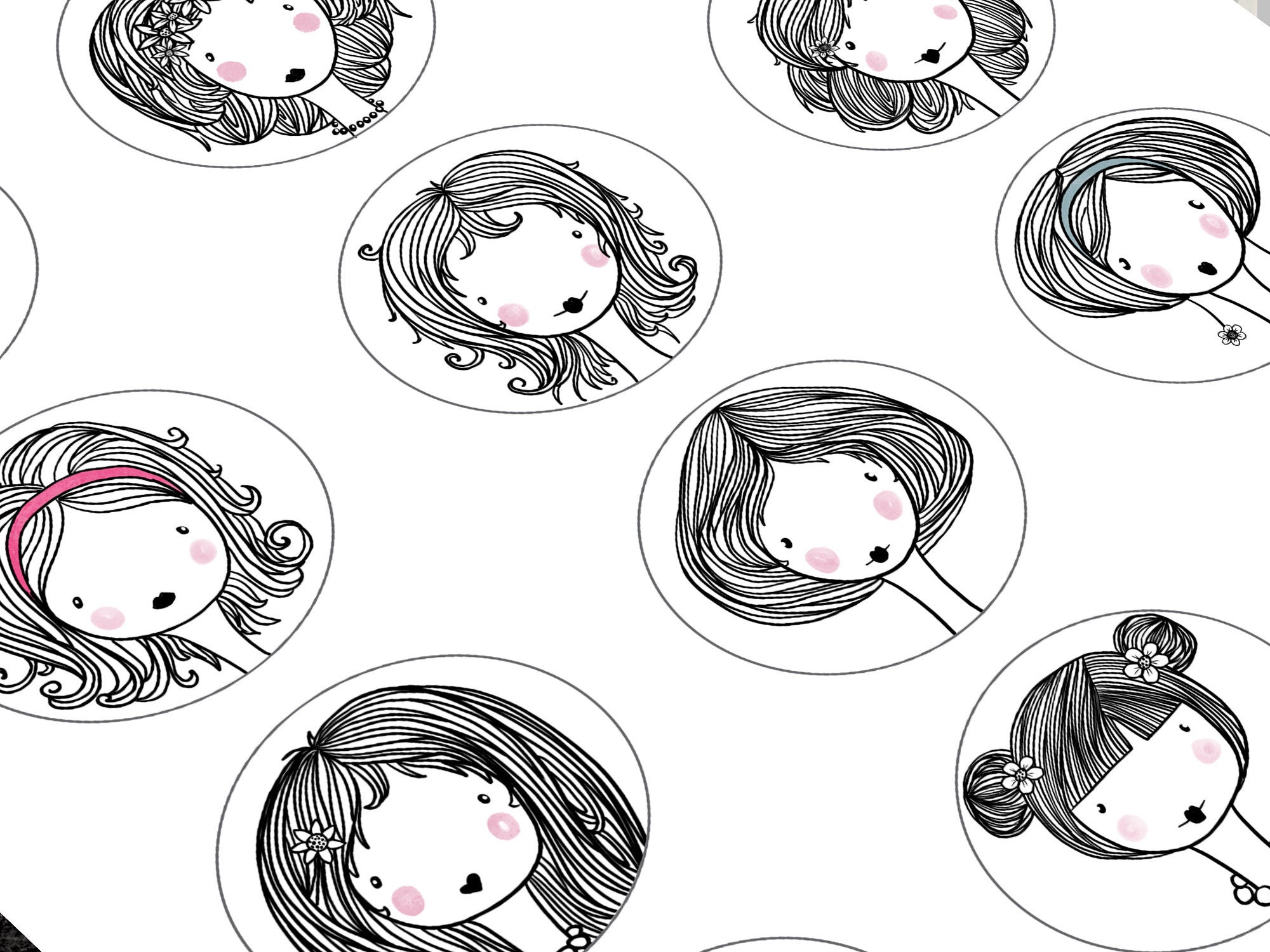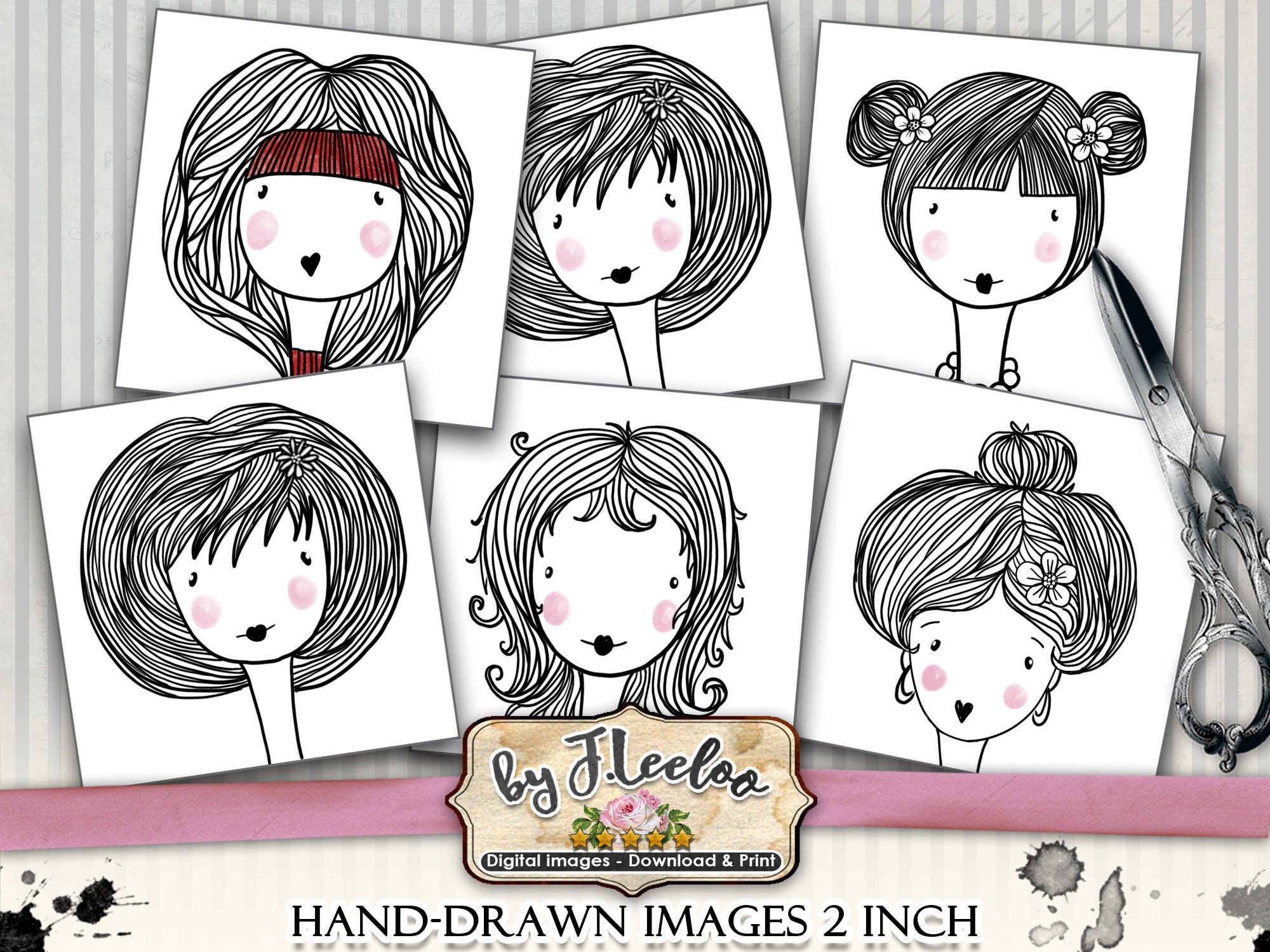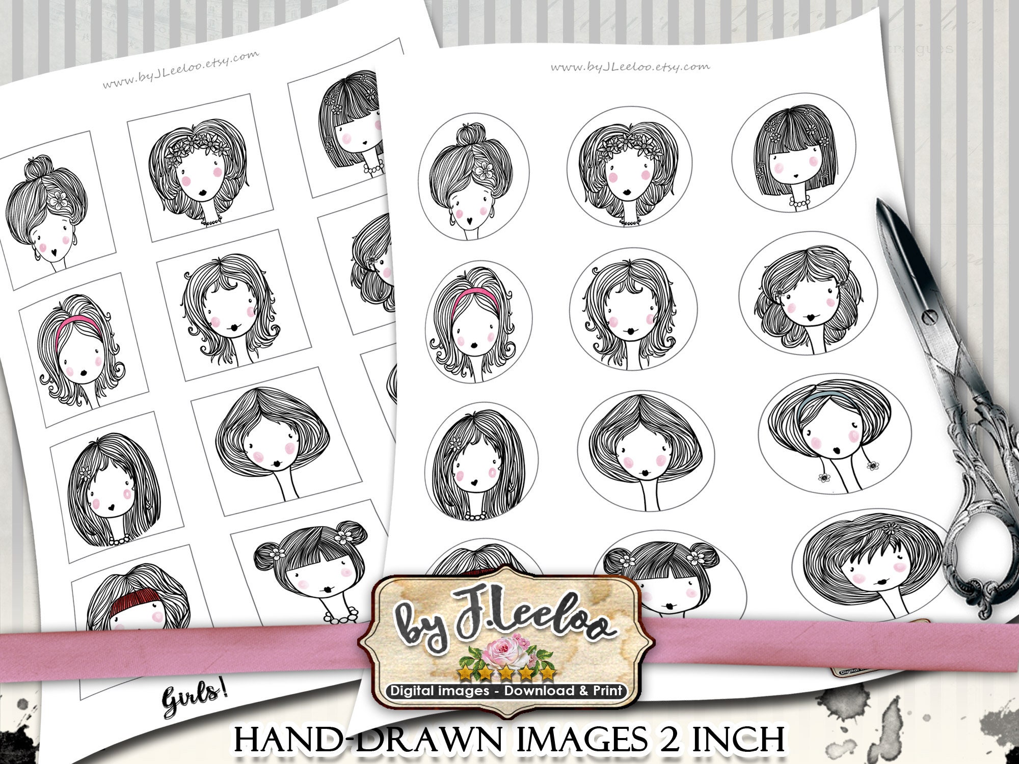 GIRLS - Hand-drawn Instant Download Digital collage sheets printable - Digital paper circle digital images 2 inch for pendants, jewelry and your craft and artwork.