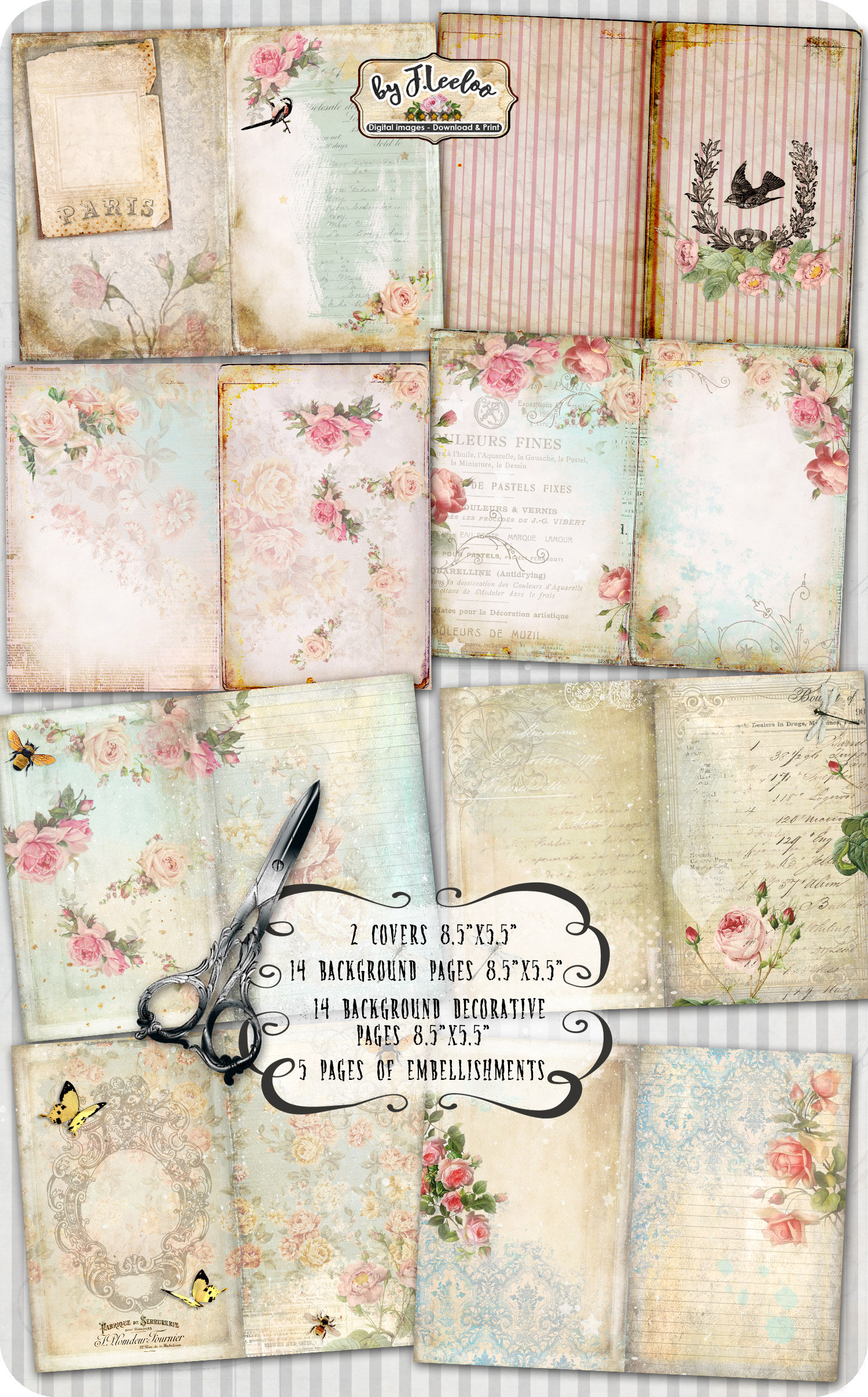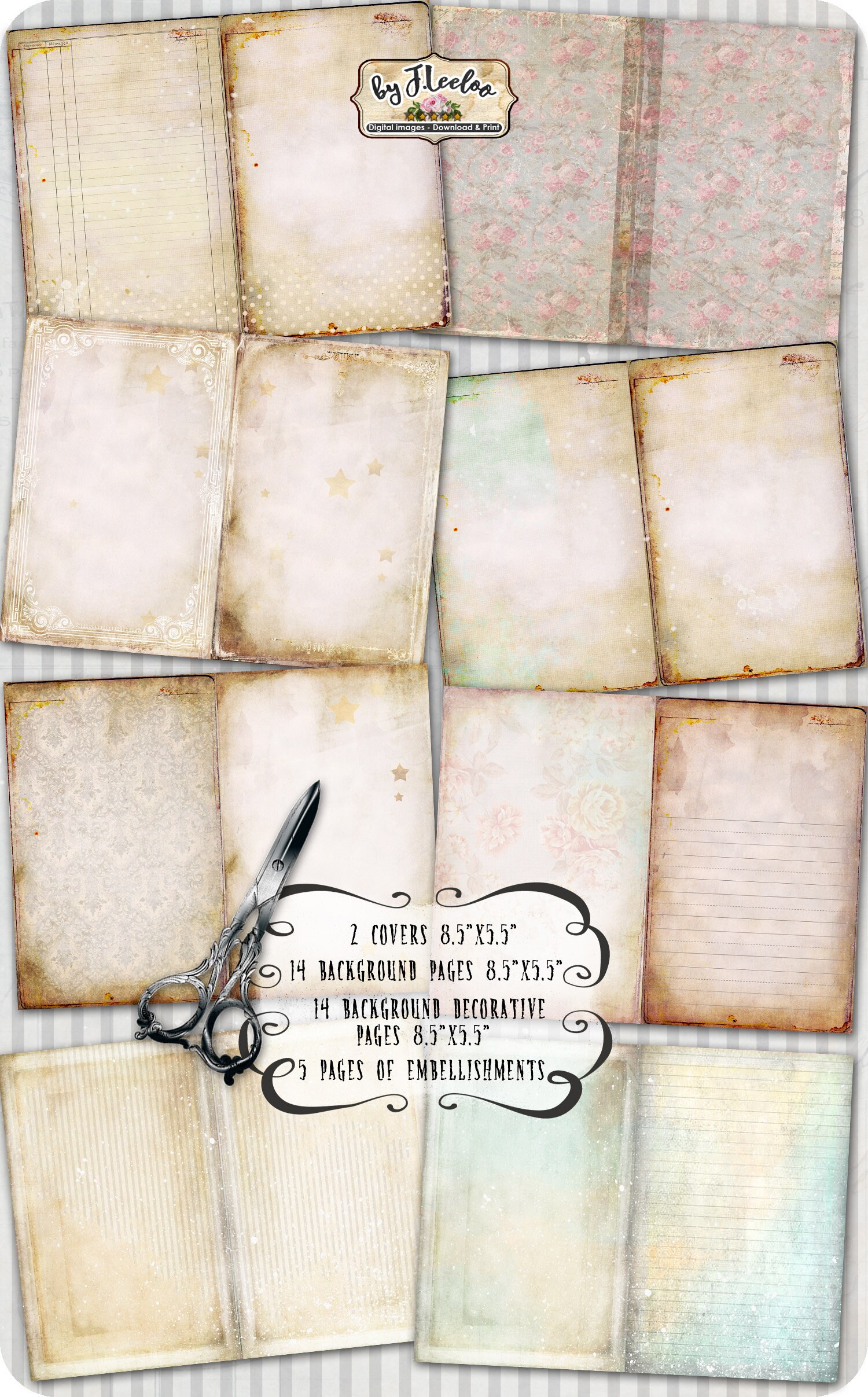 21 fogli stampabili da 8,5 x 11 pollici in JPG, progettati per creare un diario da 5,5 x 8,5.