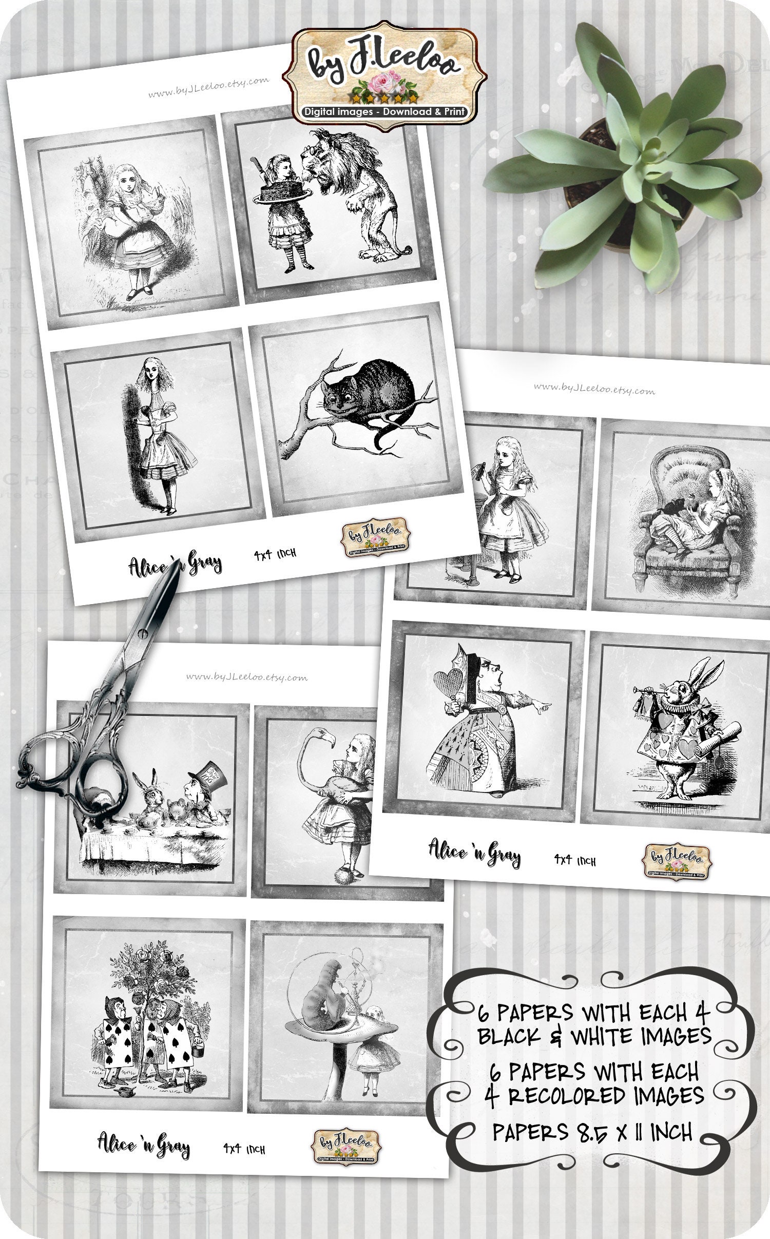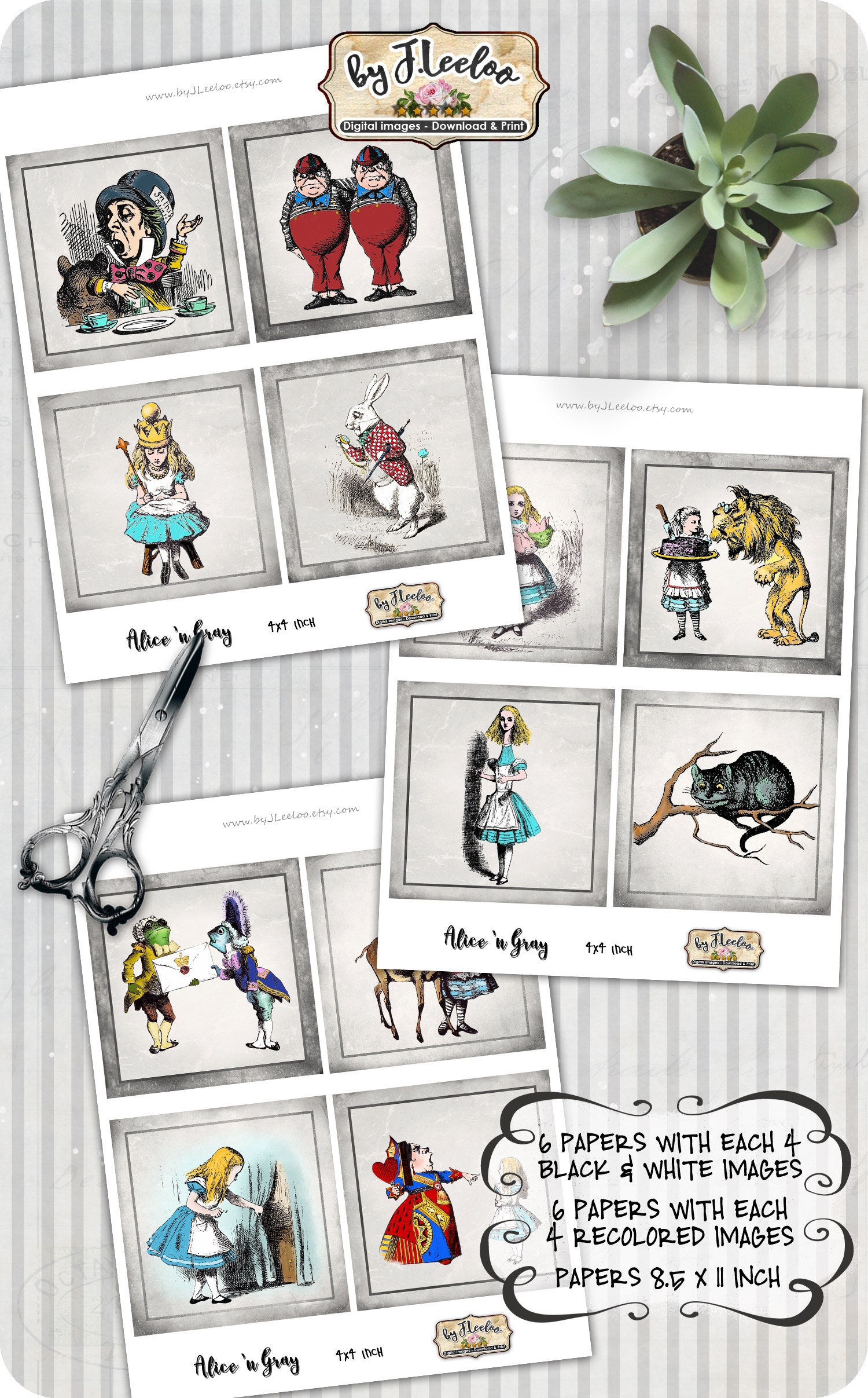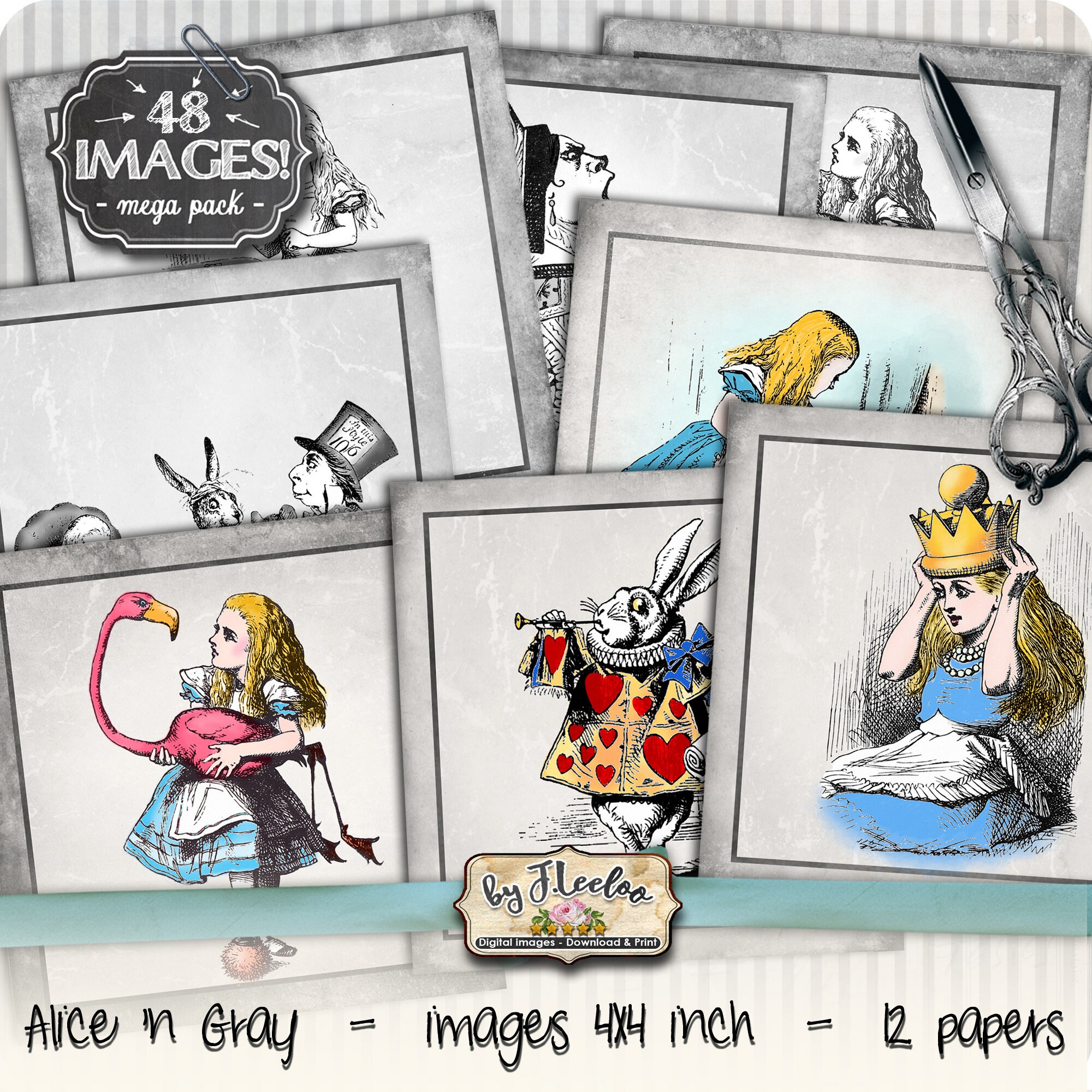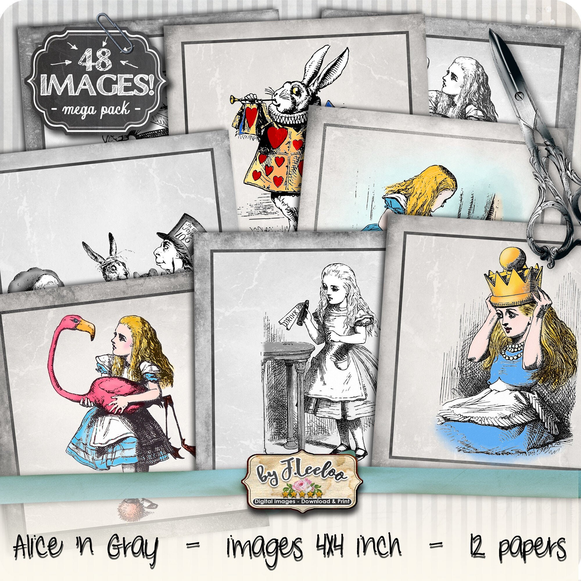 ALICE n GRAY Instant Download - Digital collage sheets - Squares printable images for coaster, jewelry holder, hang tags, stickers and all your craft project.