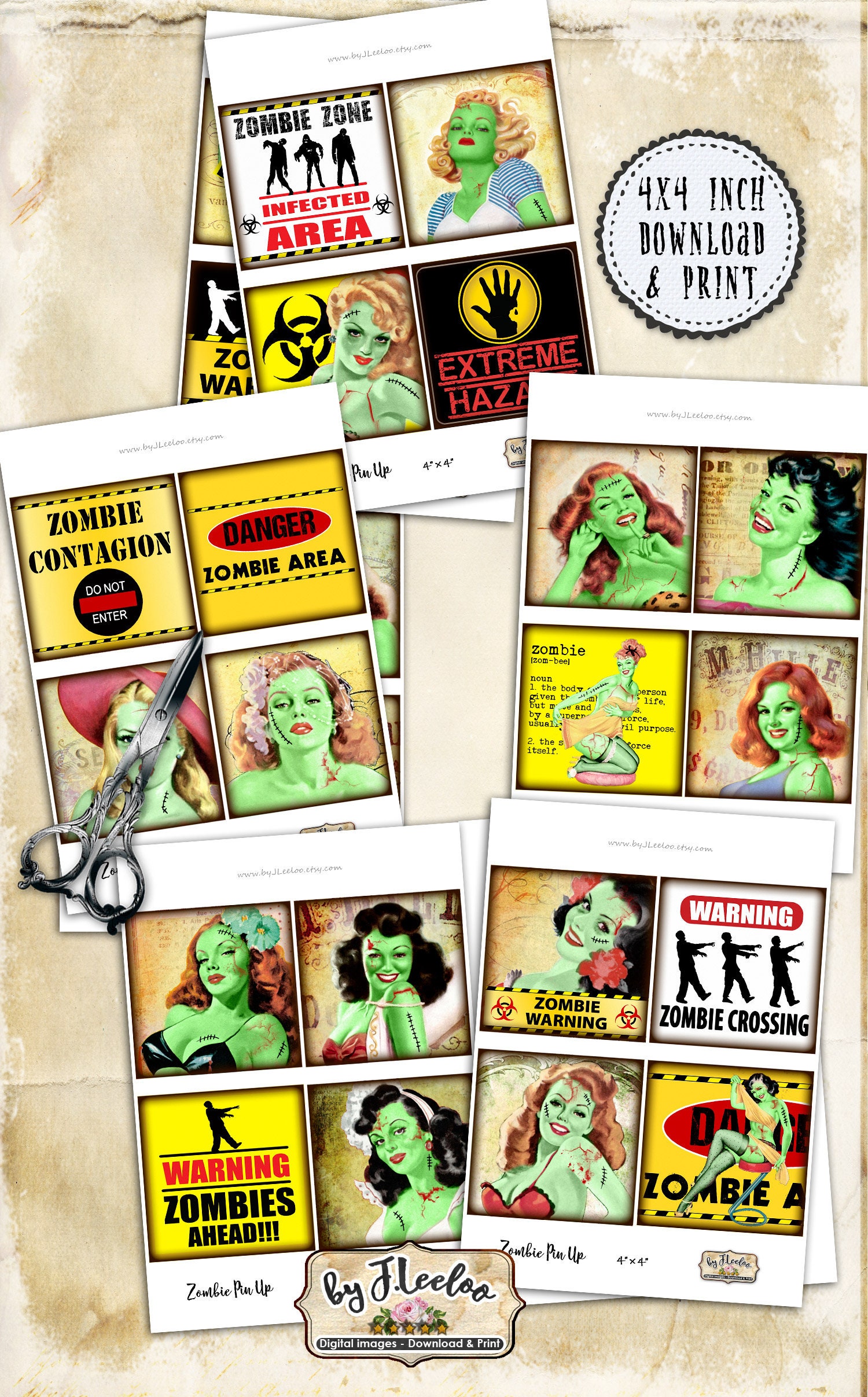 ZOMBIE Instant Download - Digital collage sheets - Square printable images for coaster, jewelry holder, hang tags, glass cabochons, bottle caps, stickers and all your artwork.