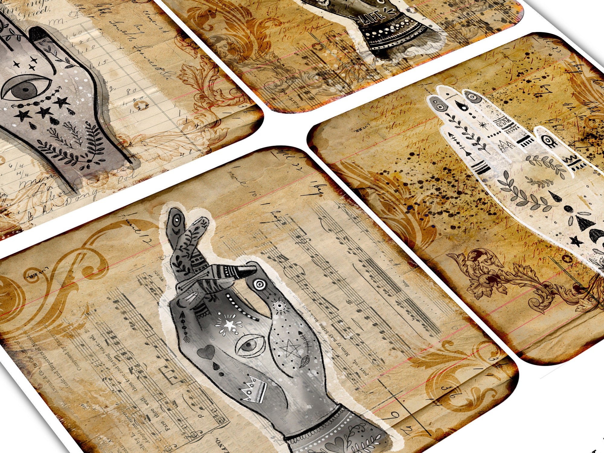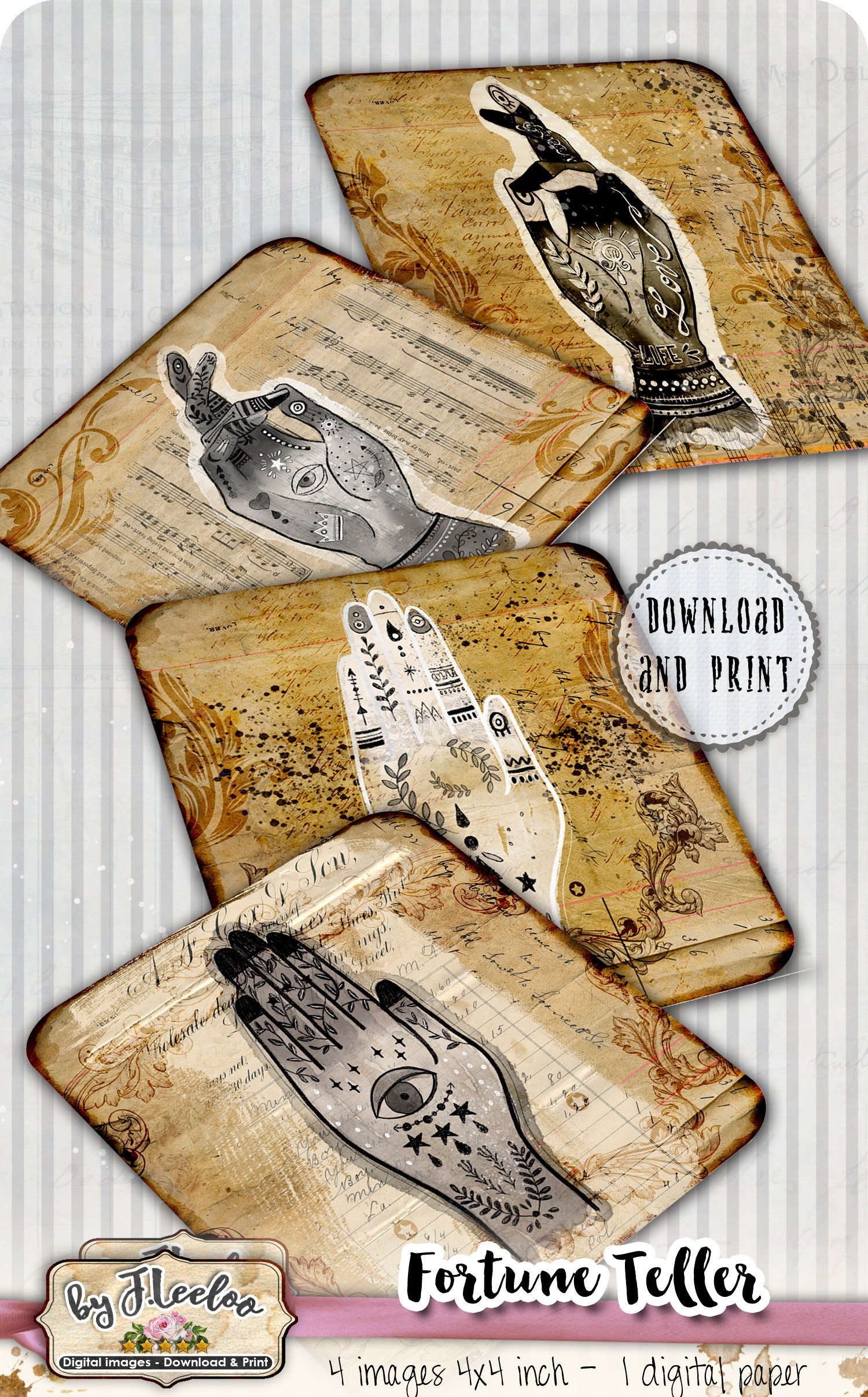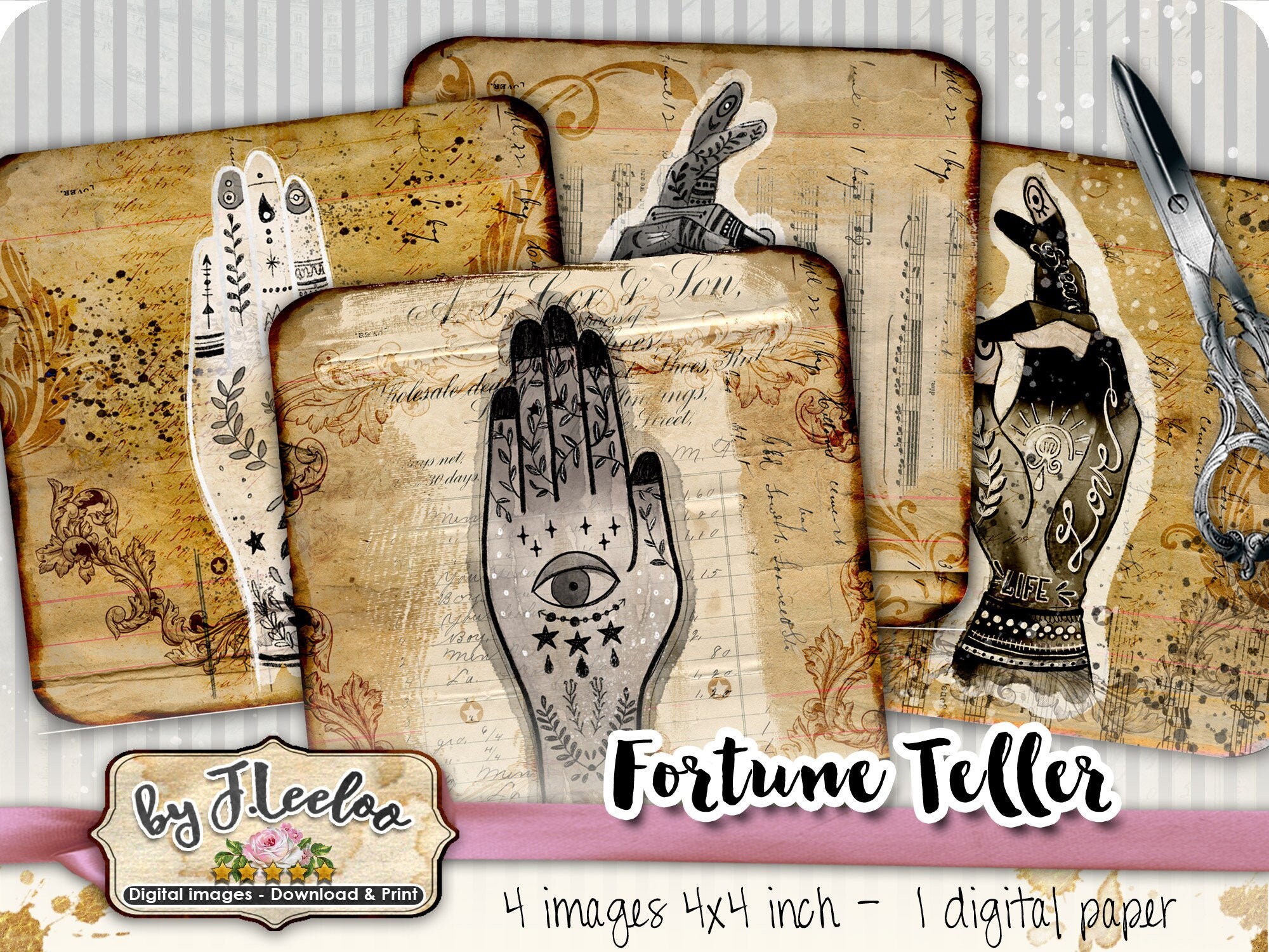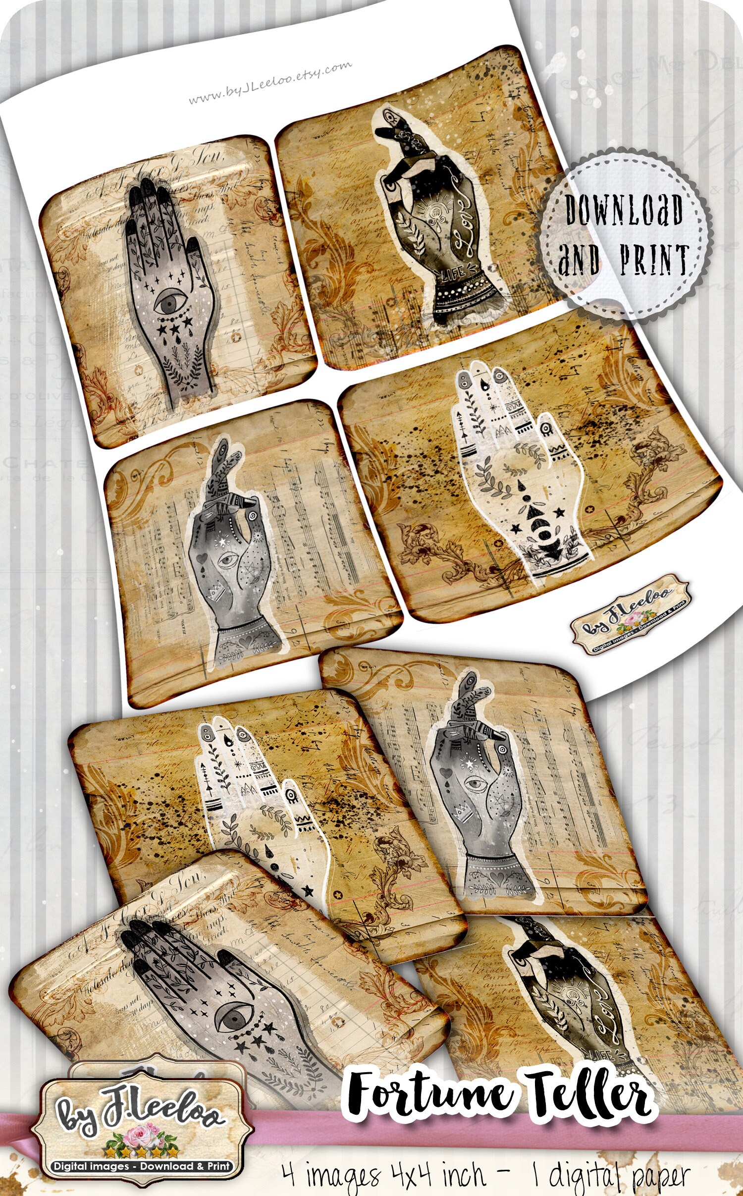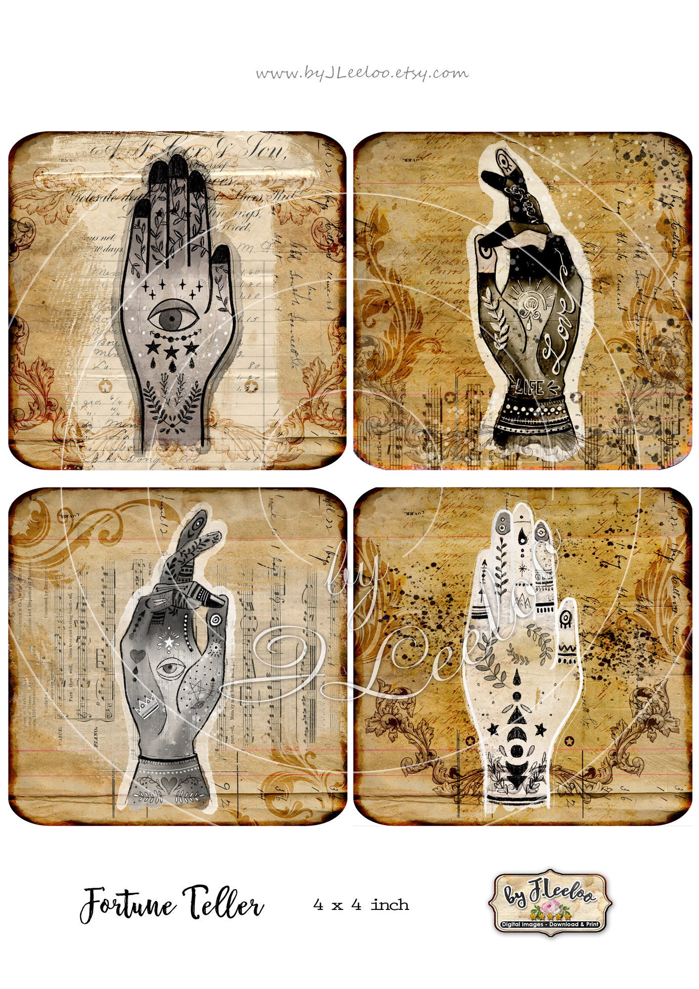 FORTUNE TELLER Instant Download - Palmistry Digital collage sheets - Square printable images for coaster, jewelry, glass cabochons, bottle caps, stickers, hang tags and all your artwork.