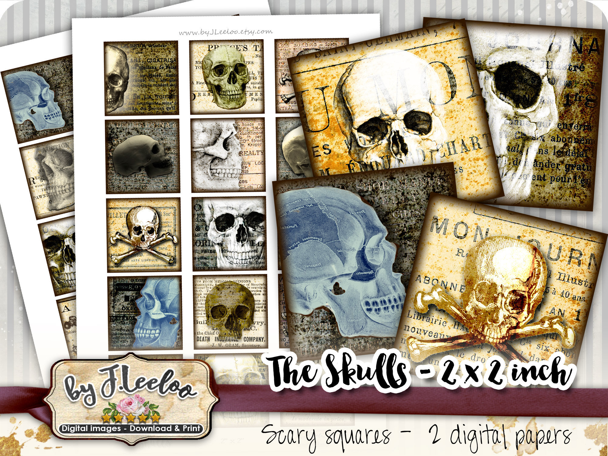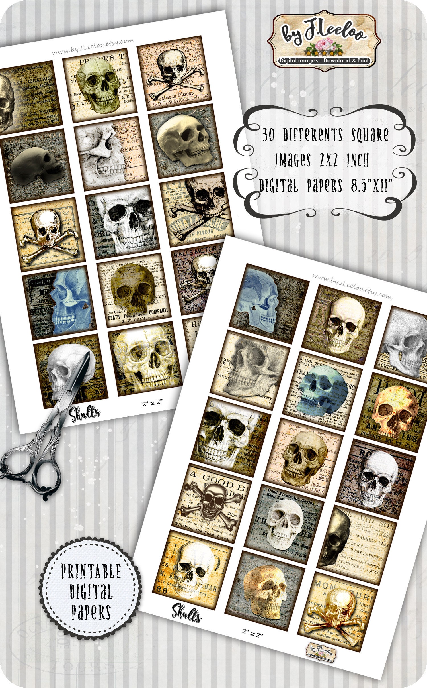SKULLS Instant Download - Digital collage sheets - Square printable images 4x4 inch for coaster, jewelry holder, hang tags, invitations party, stickers and all your artwork.