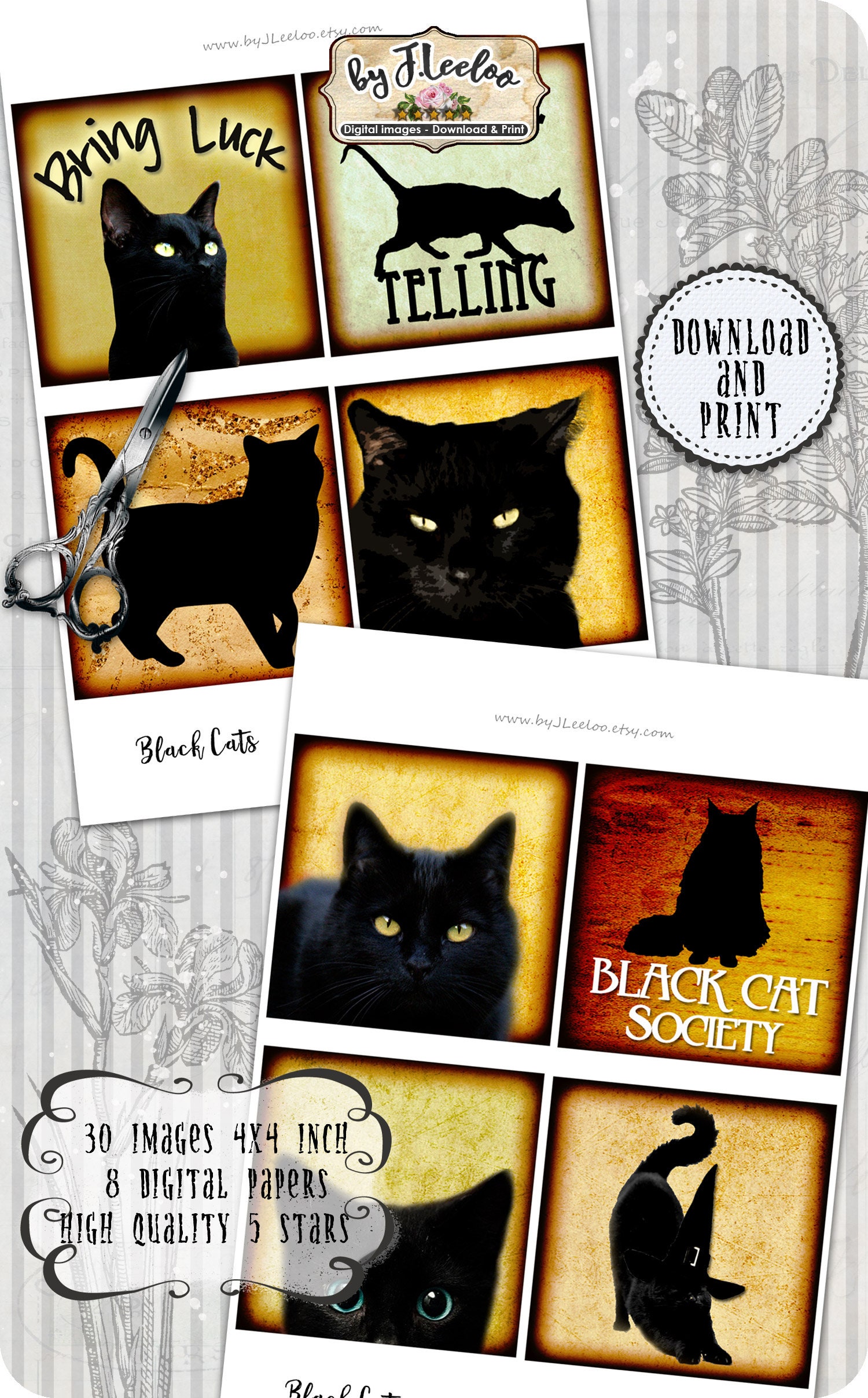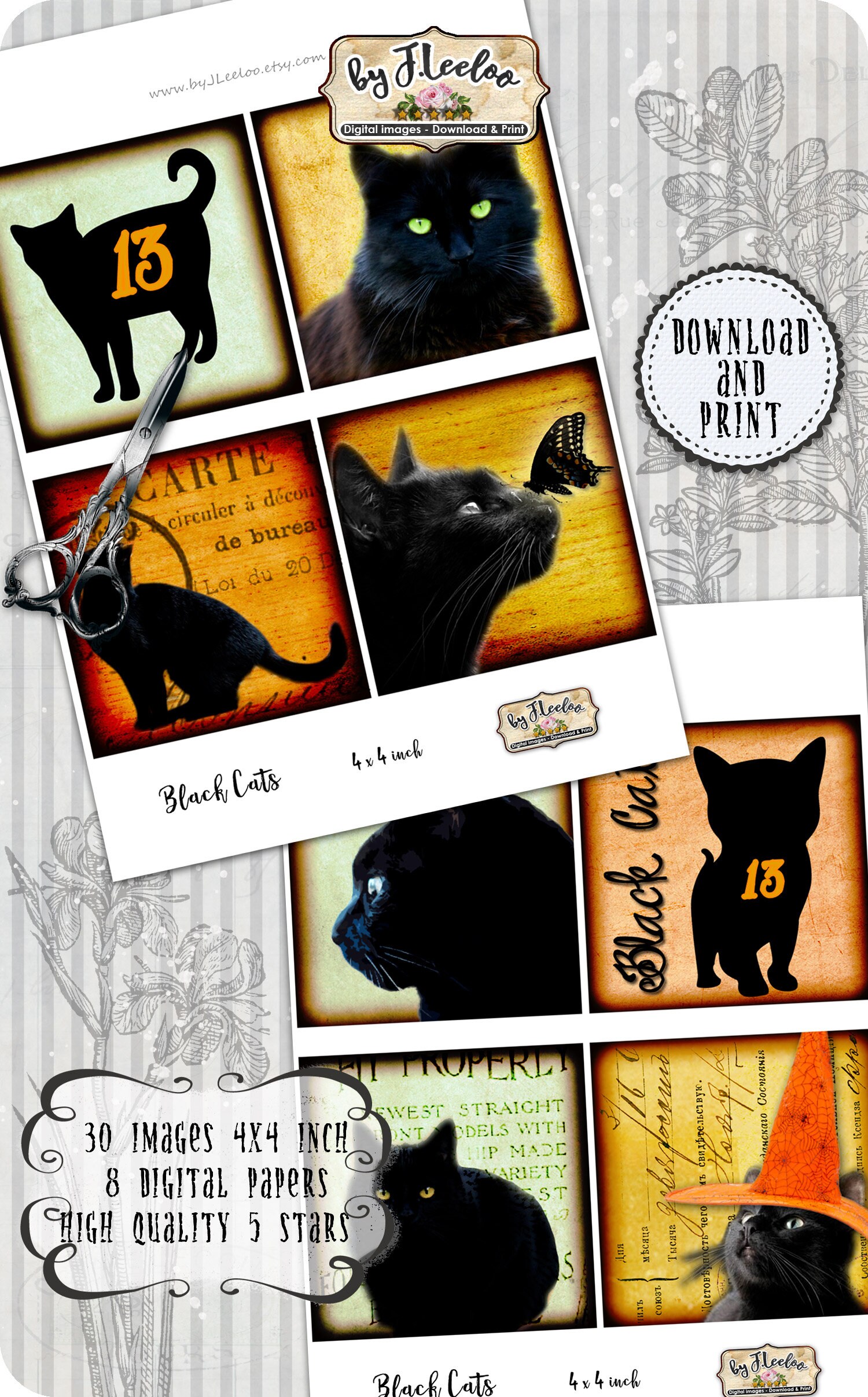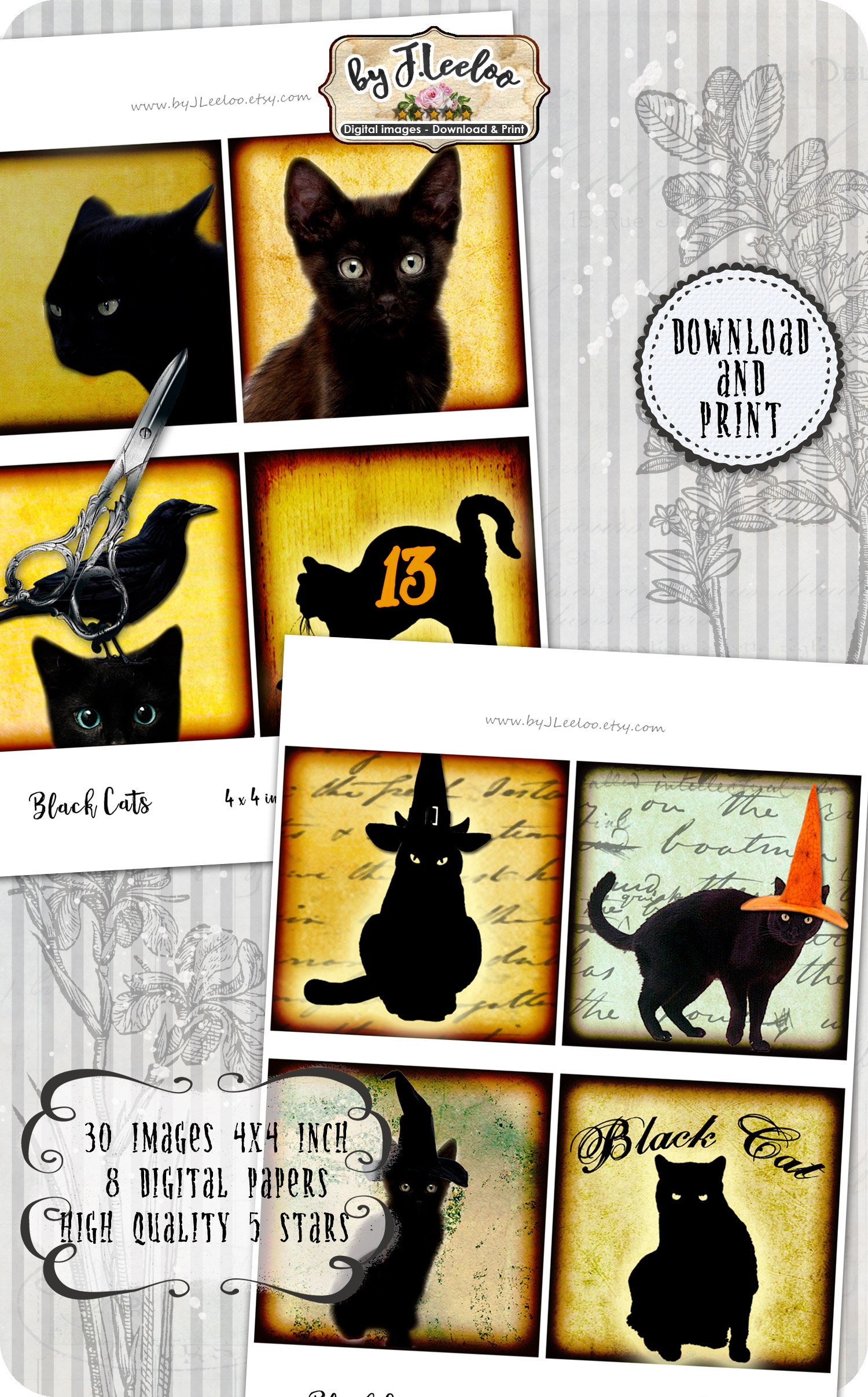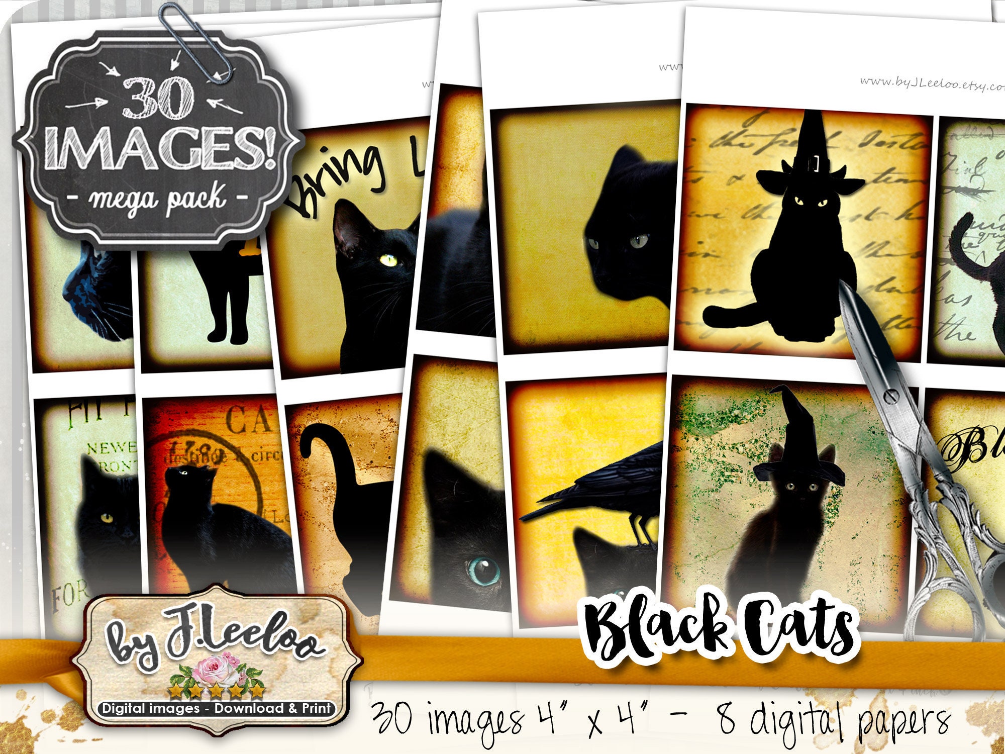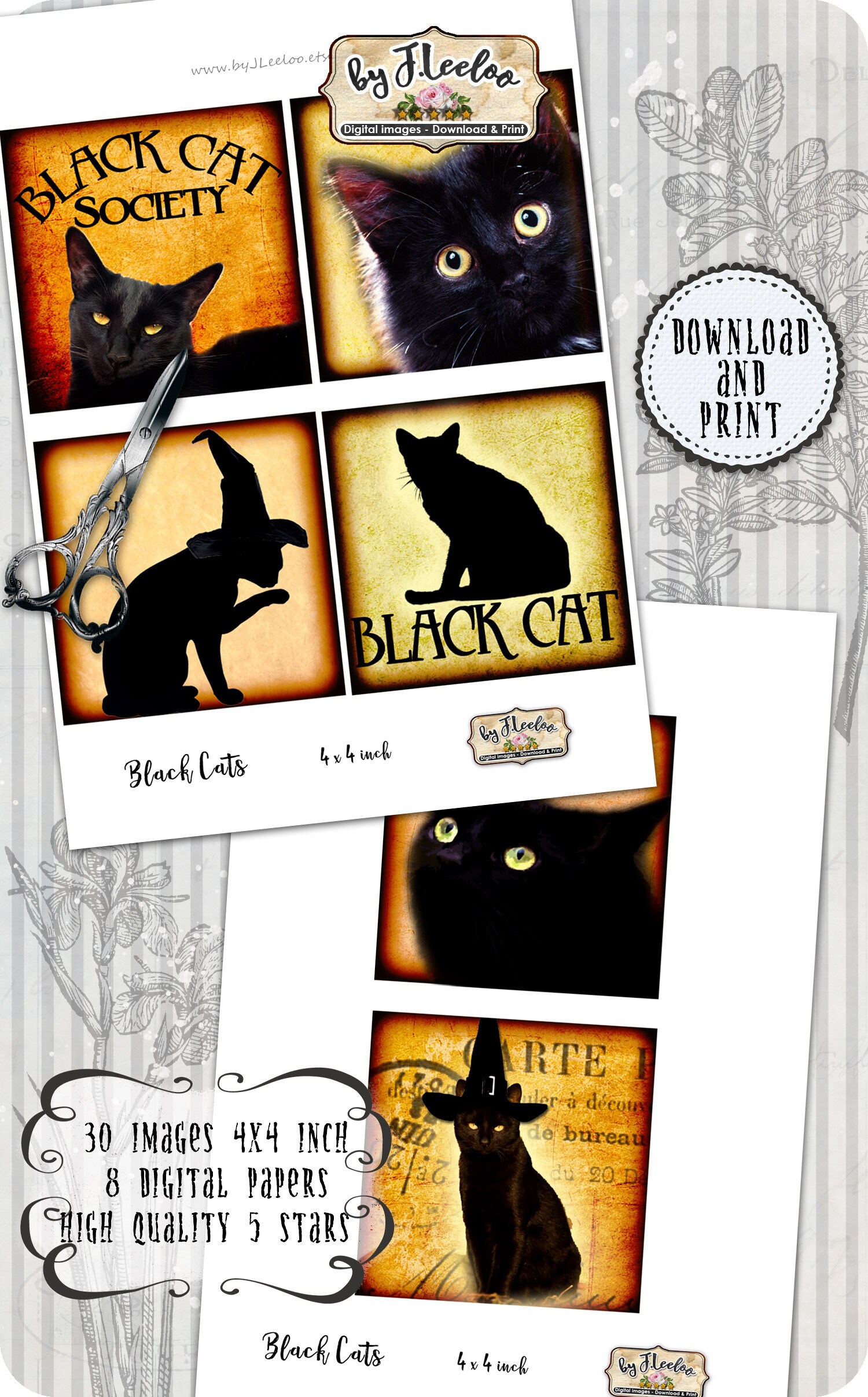 BLACK CATS Instant Download - Digital collage sheets - Square printable images 4x4 inch for coaster, jewelry holder, hang tags, invitations party, stickers and all your artwork.