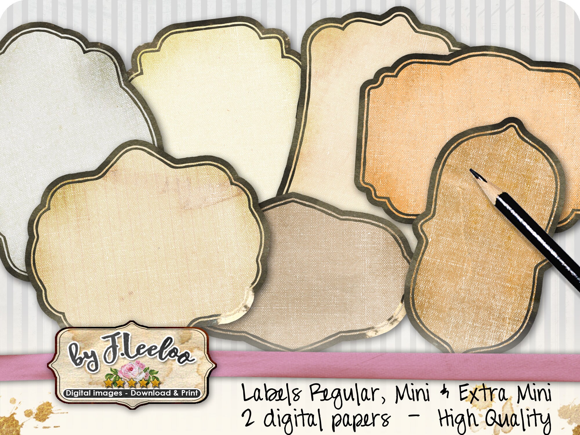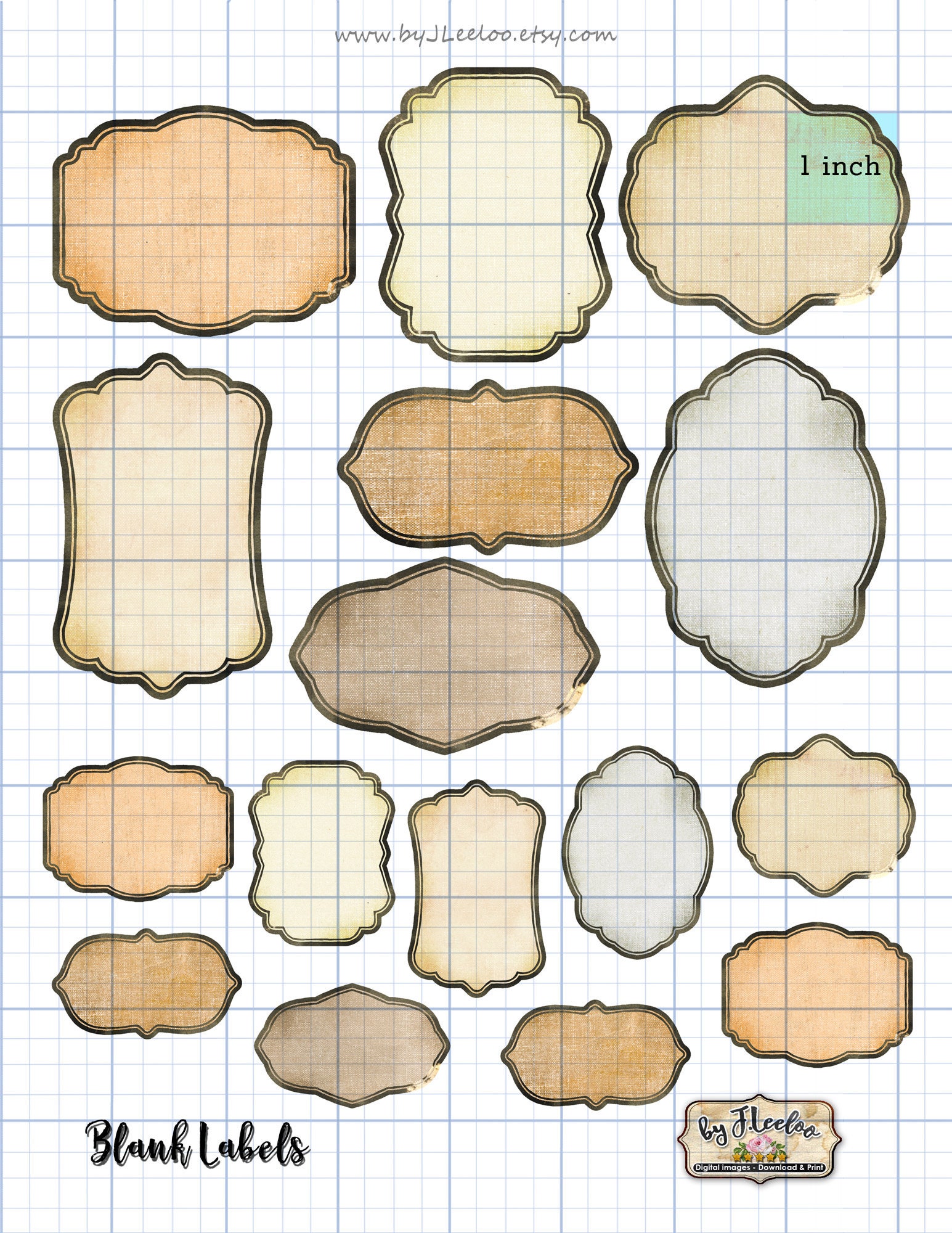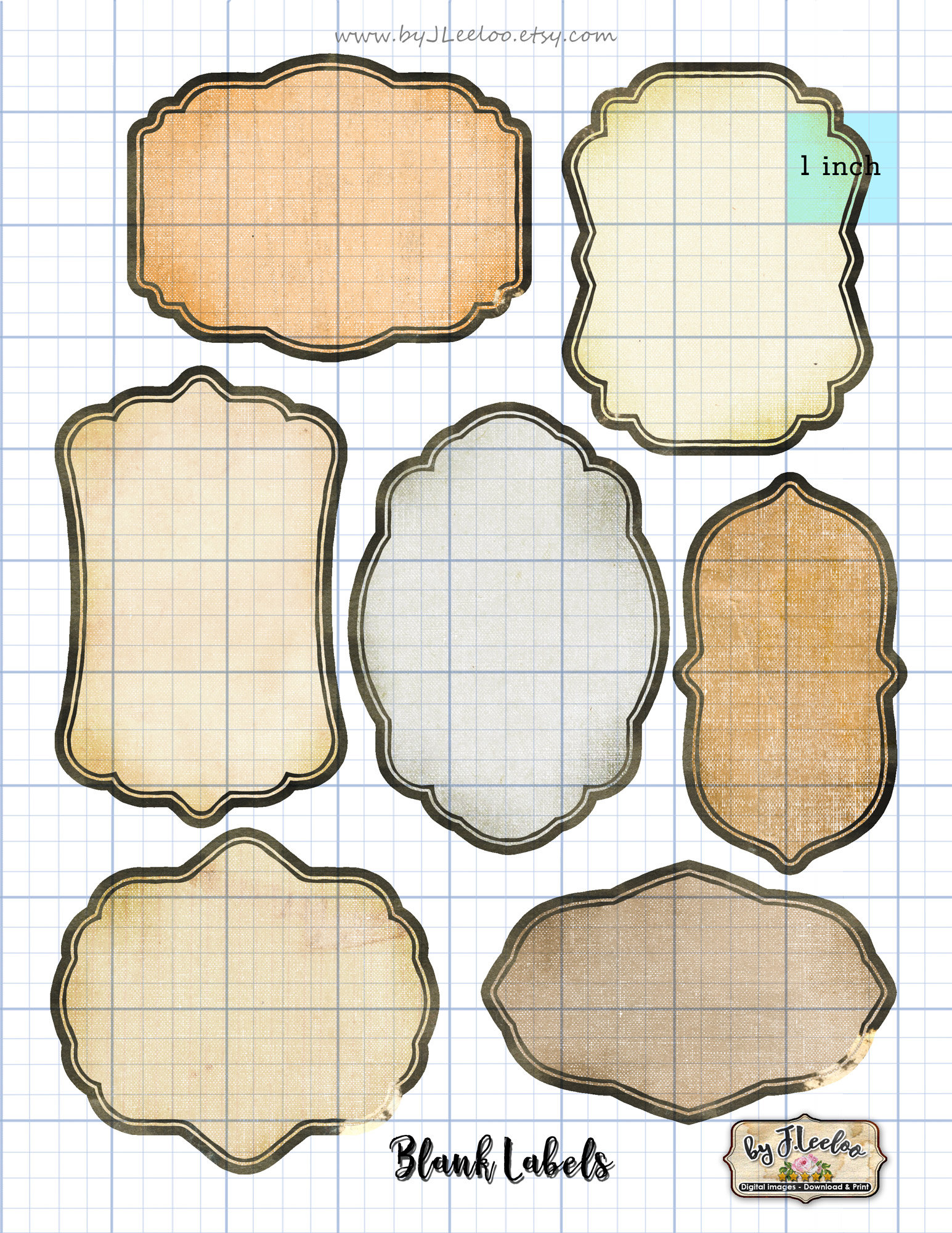 Set of 7 vintage style label designs in various shapes & sizes.