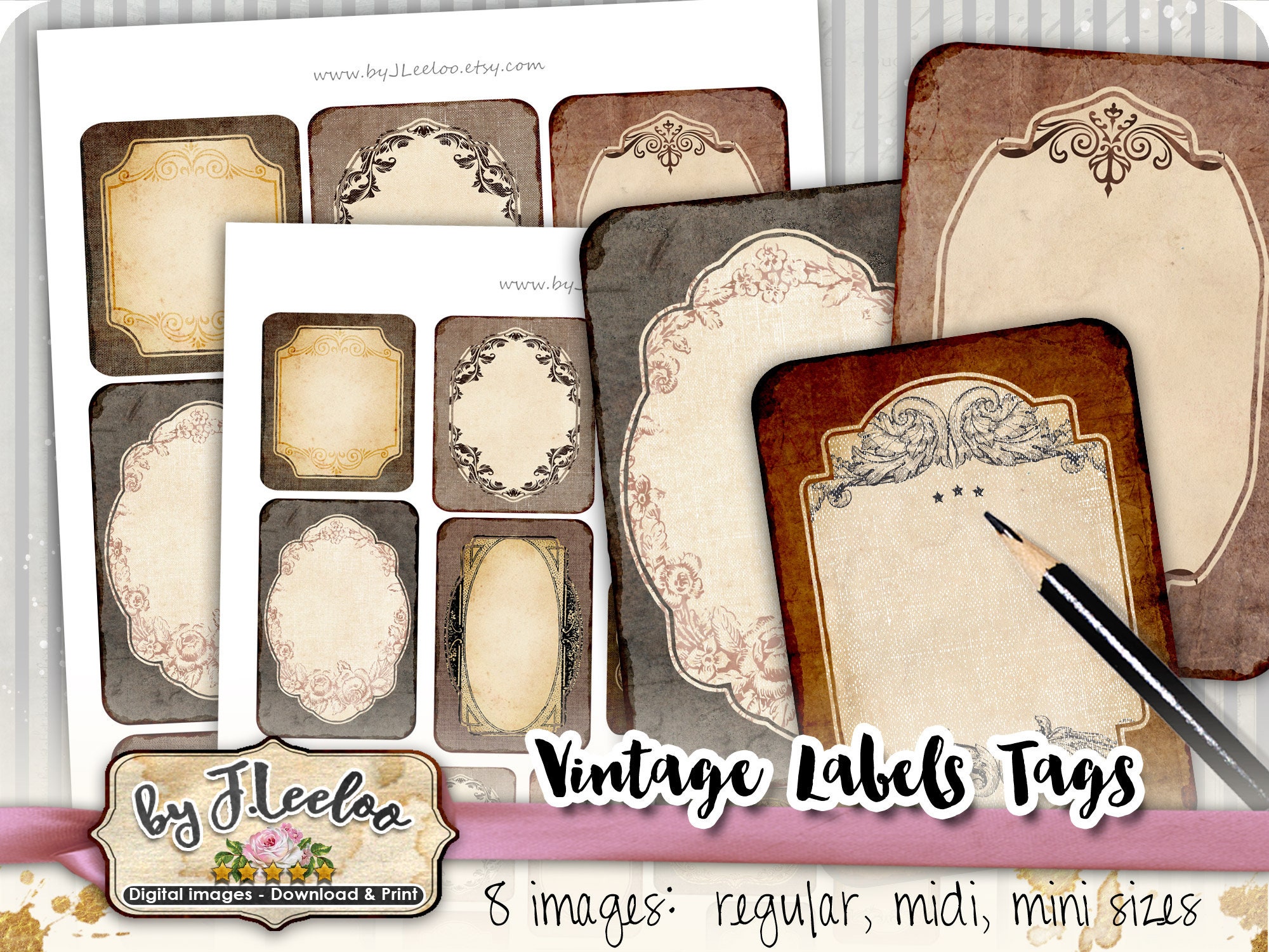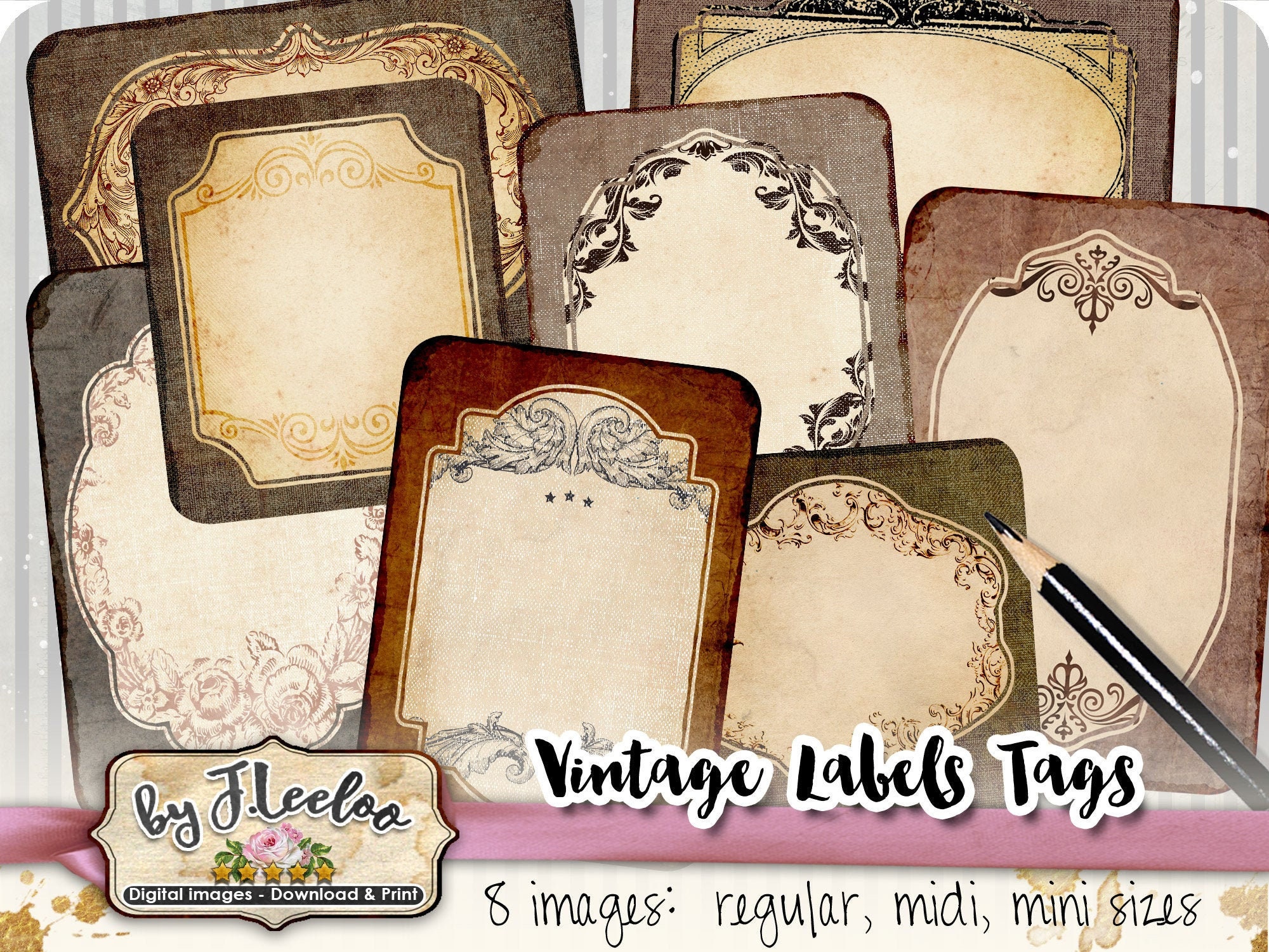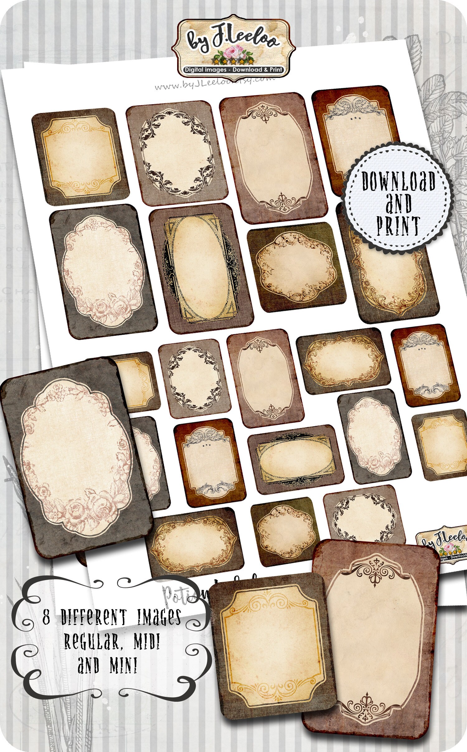 Set of 8 vintage style label designs in various shapes & sizes.
