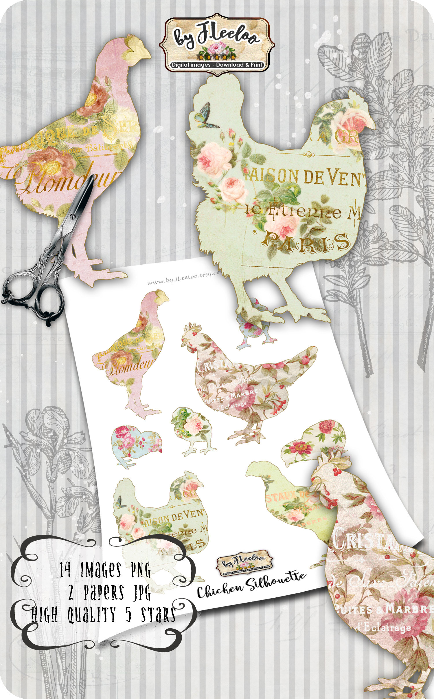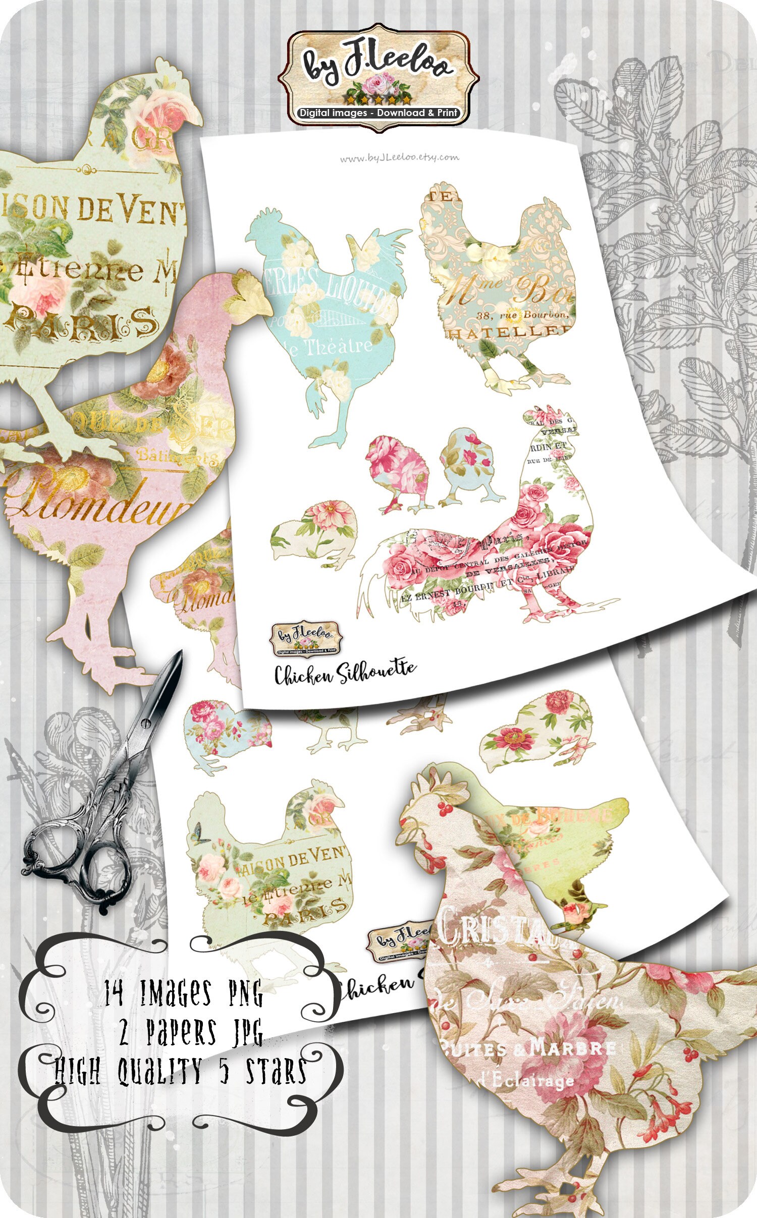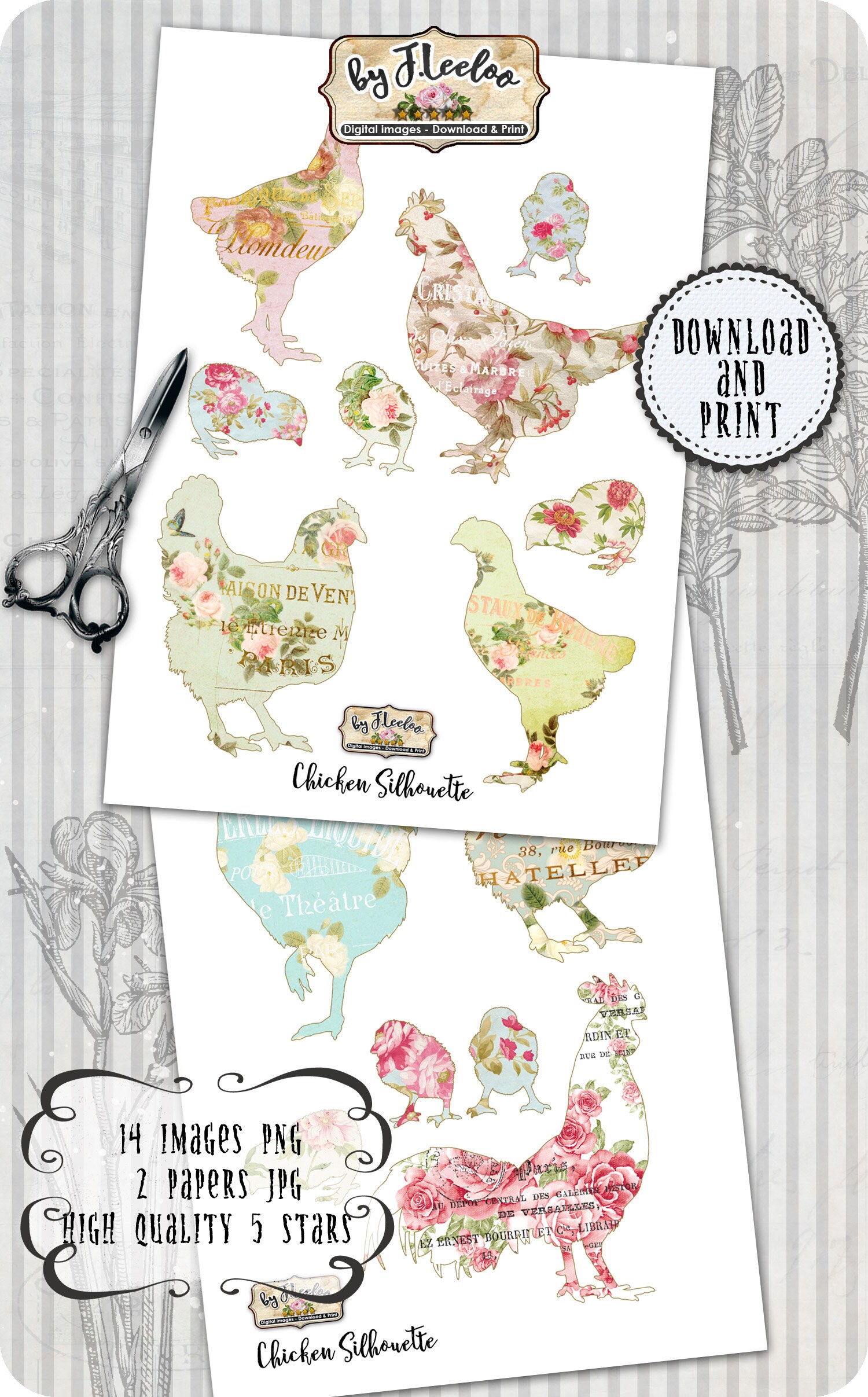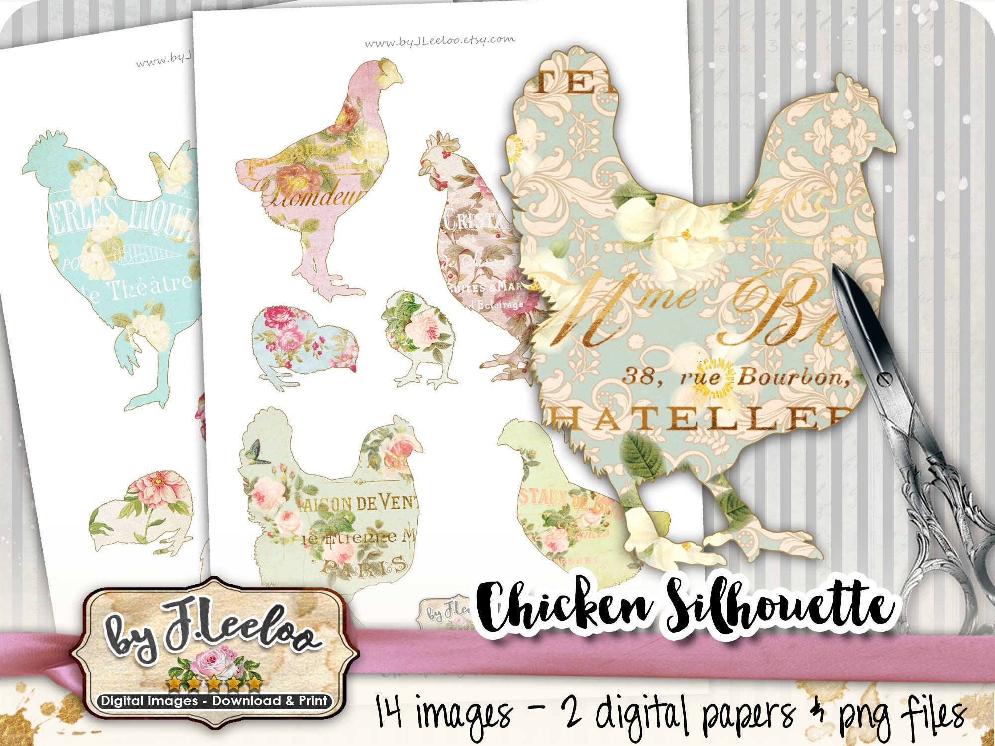 CHICKEN SILHOUETTE png jpg files clipart Digital collage sheet farm roses for scrapbooking altered art instant download printable: Download to print for scrapbooks, invitations, journaling, hang tags, card making, collages... a great supply for your artwork.