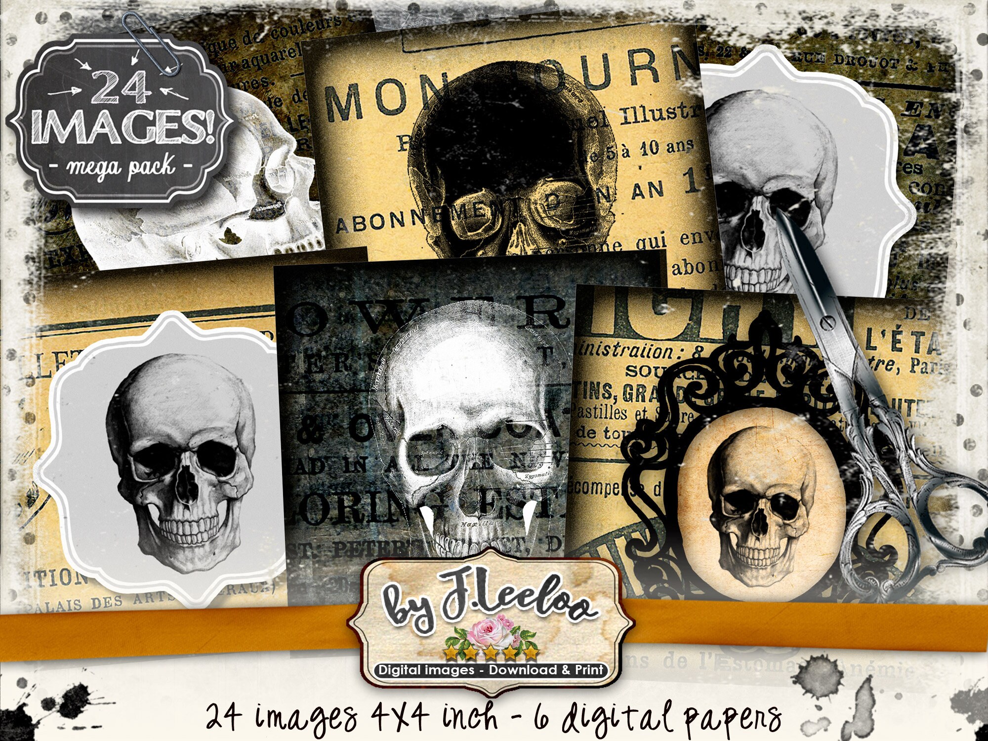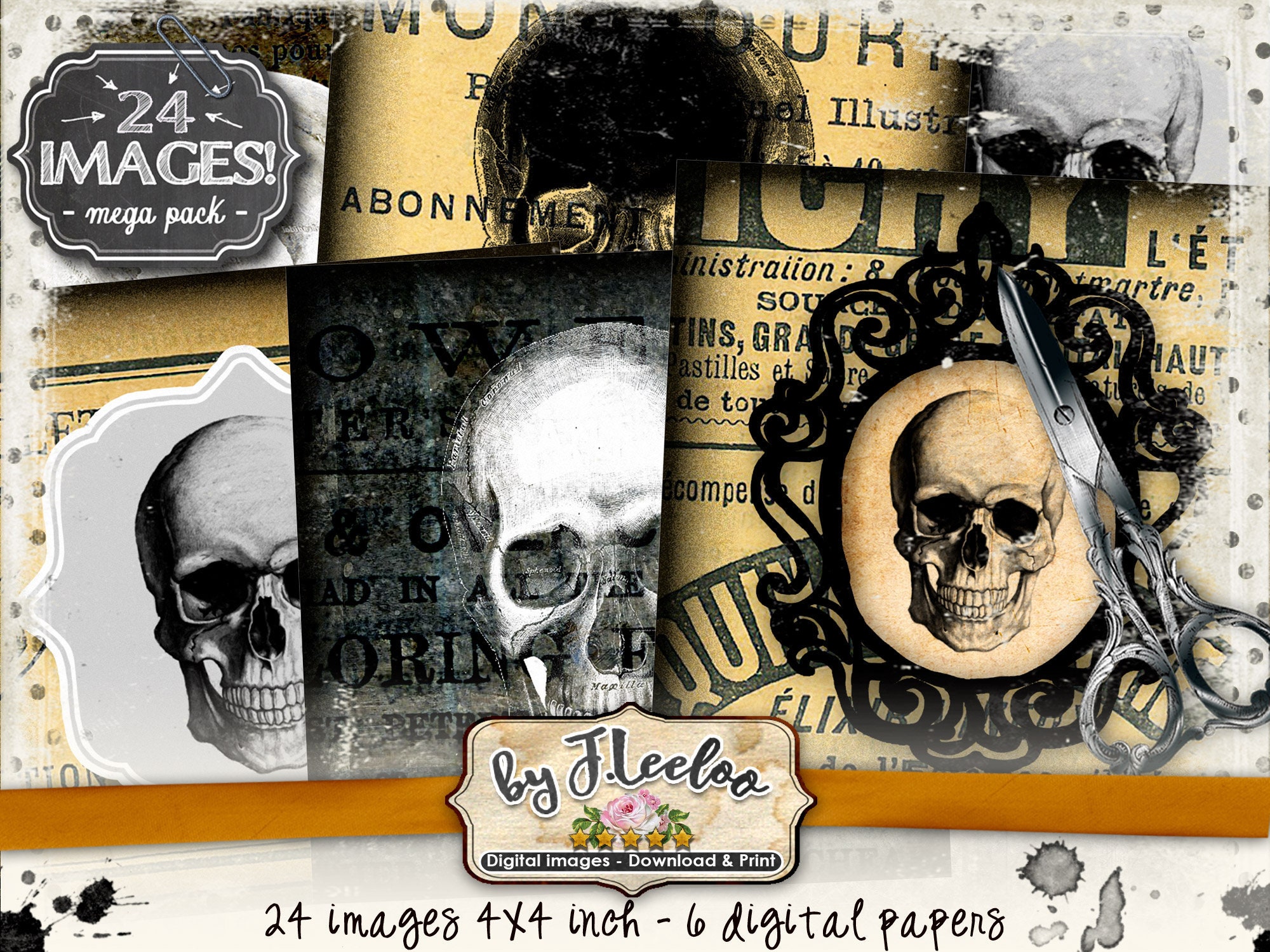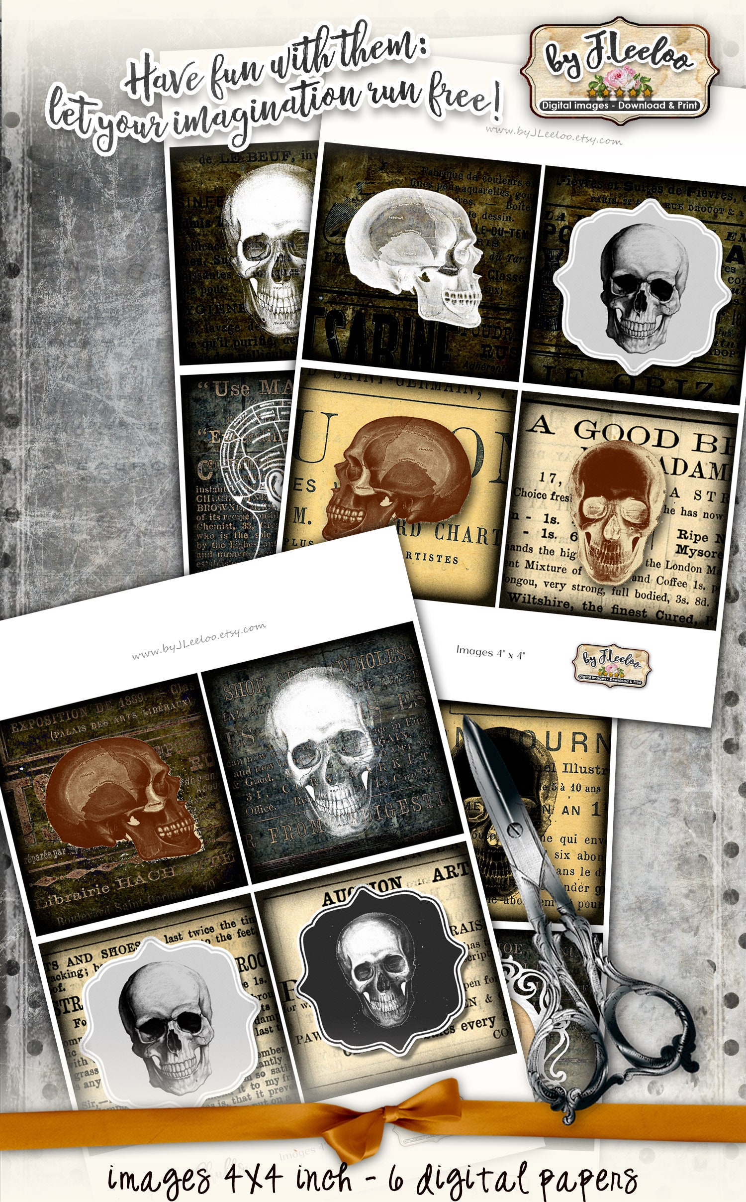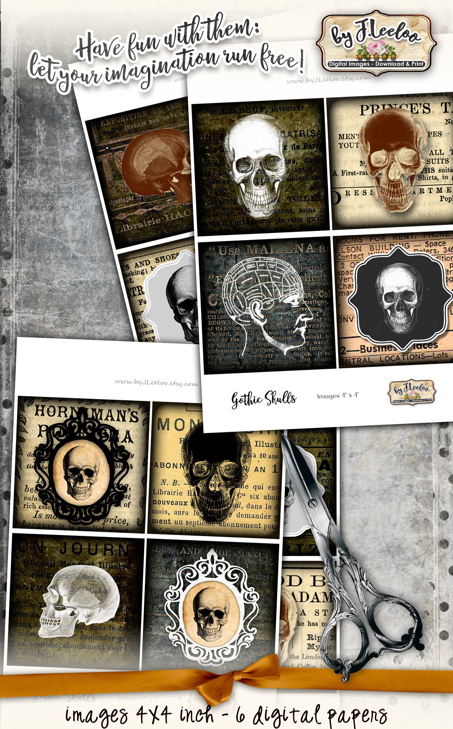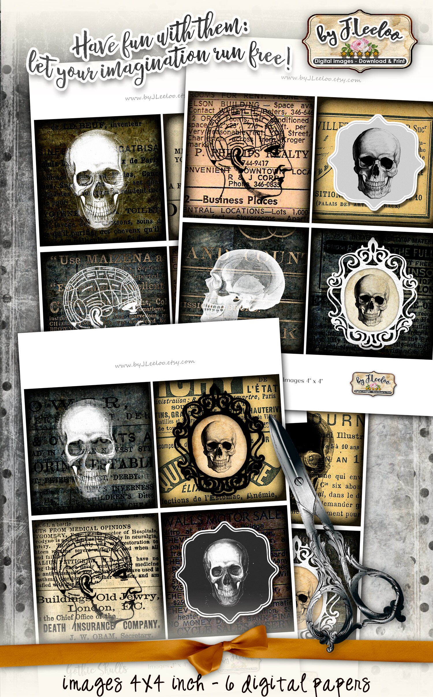 GOTHIC SKULLS Instant Download - Digital collage sheets - Square printable images 4x4 inch for coaster, jewelry holder, hang tags, invitations party, stickers and all your artwork.