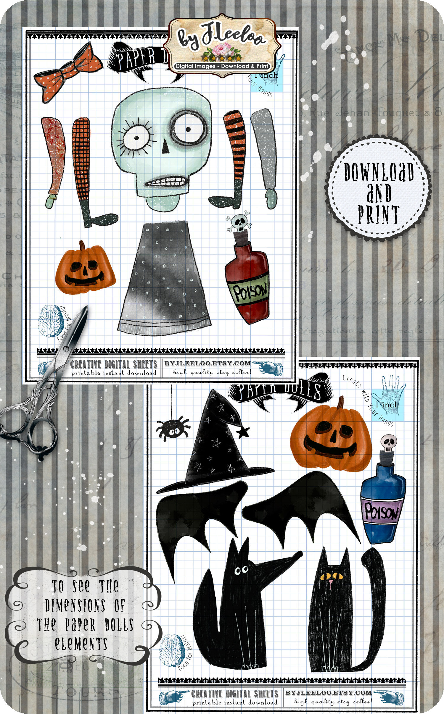 Create a moveable spooky paper dolls for your Halloween with these digital sheets! Create cool festooned with them or decorates them with your sweet or your invitations!