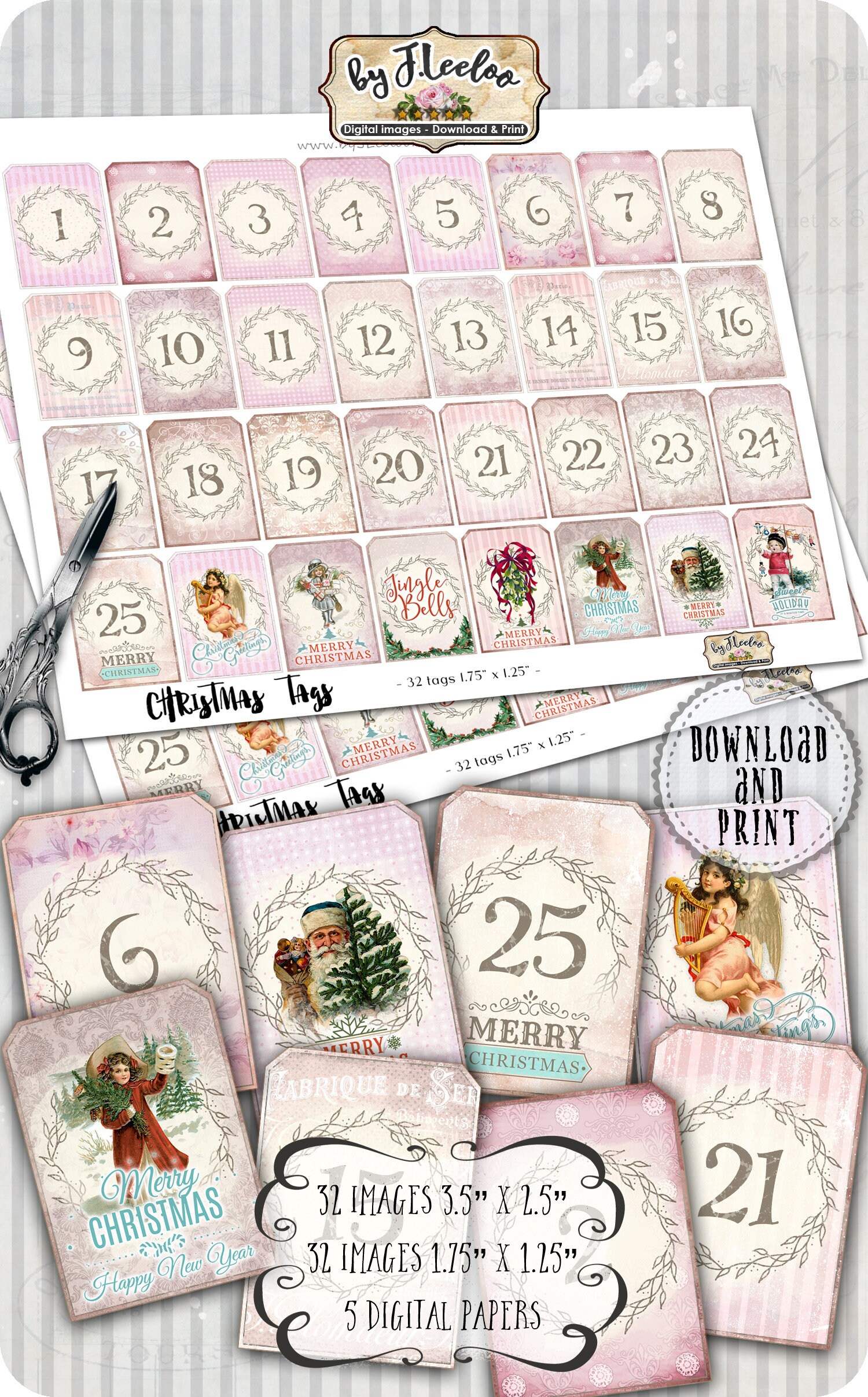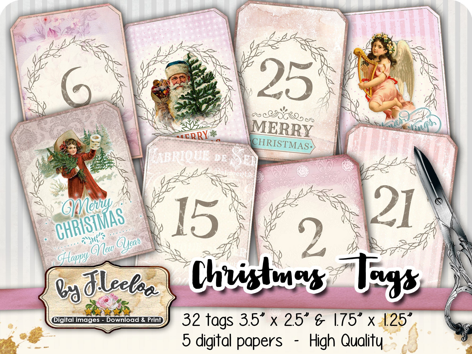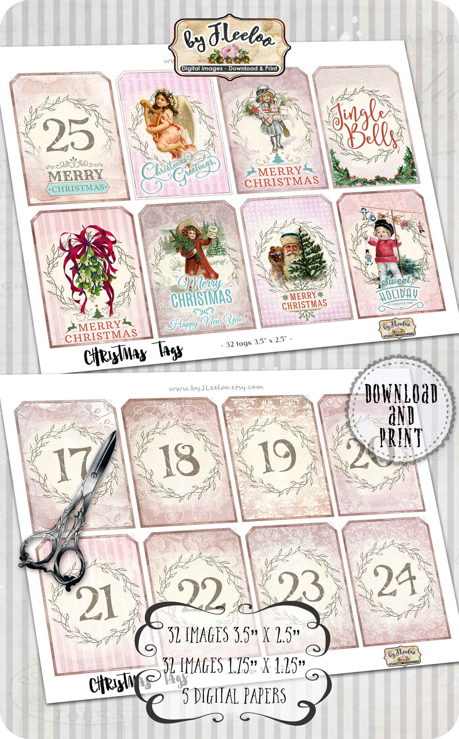 CHRISTMAS - Digital collage sheets: daily calendar daily planner countdowndownload labels and print for paper craft gift tags vintage ephemera scrapbooking downloadable graphic