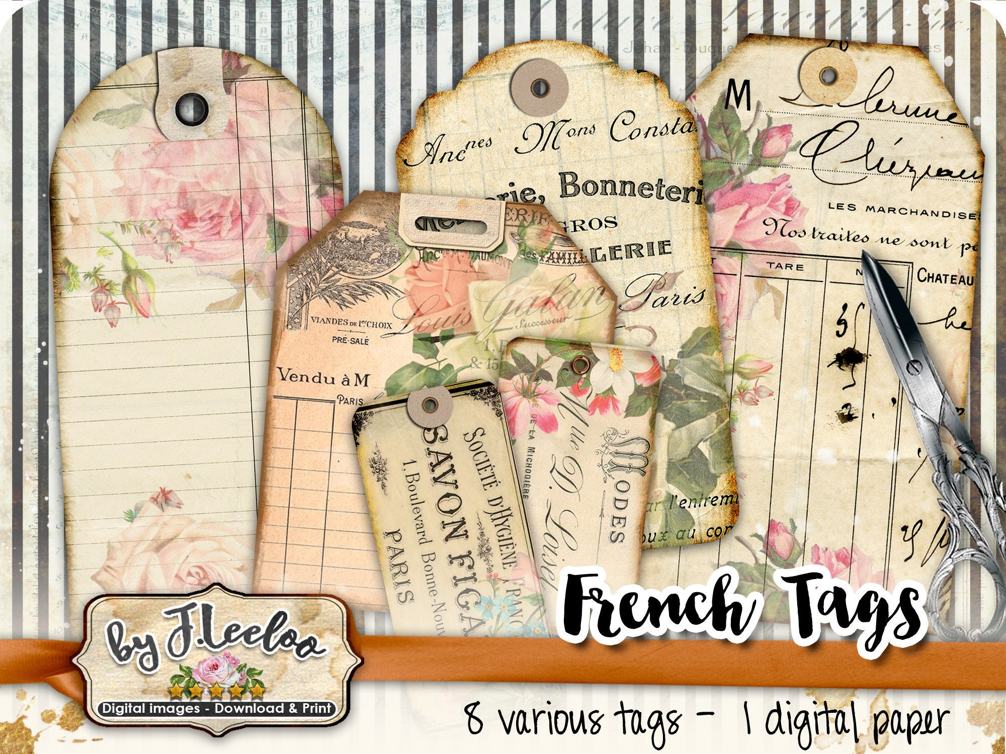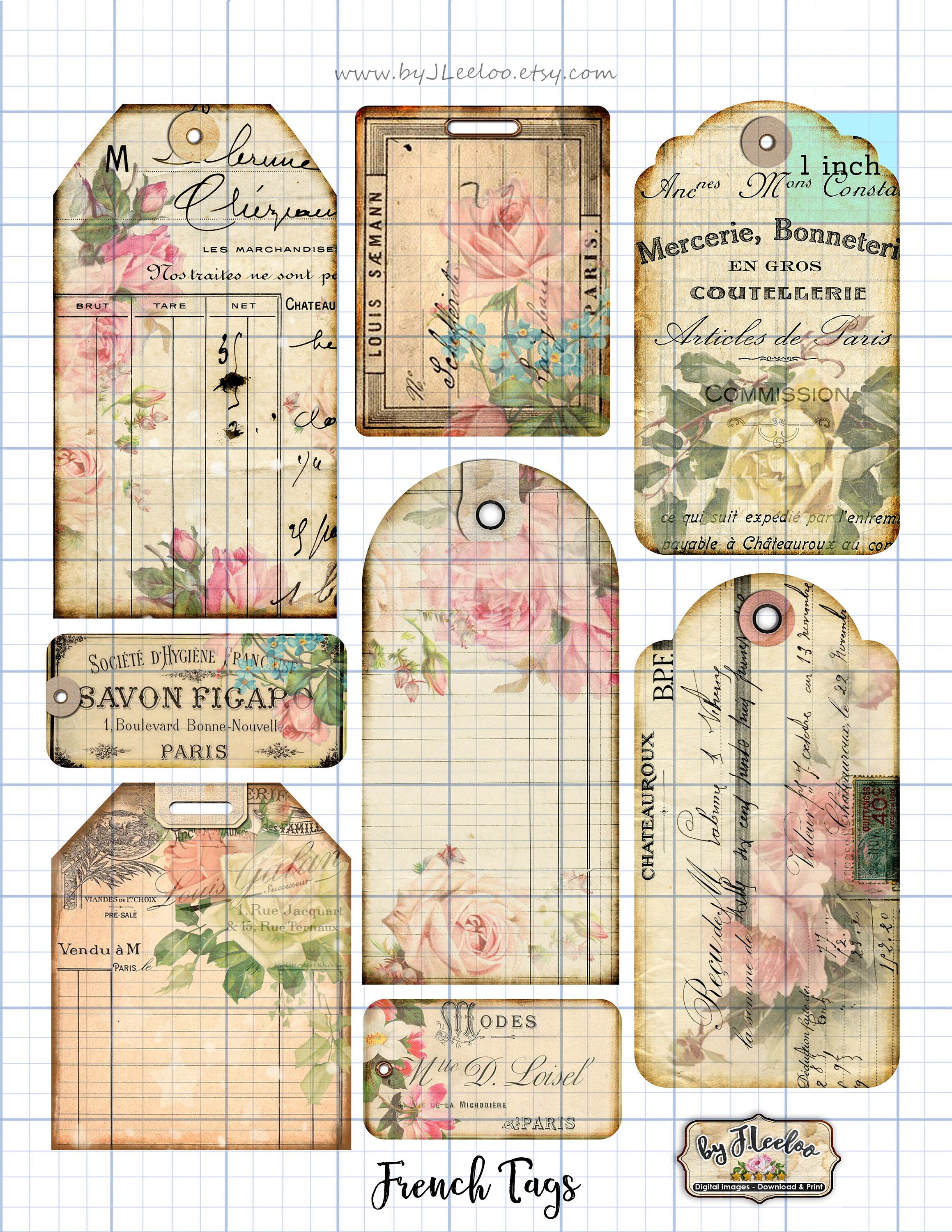 FRENCH TAGS digital shabby chic jewelry holder, french roses paper goods for craft art and your others craft project.