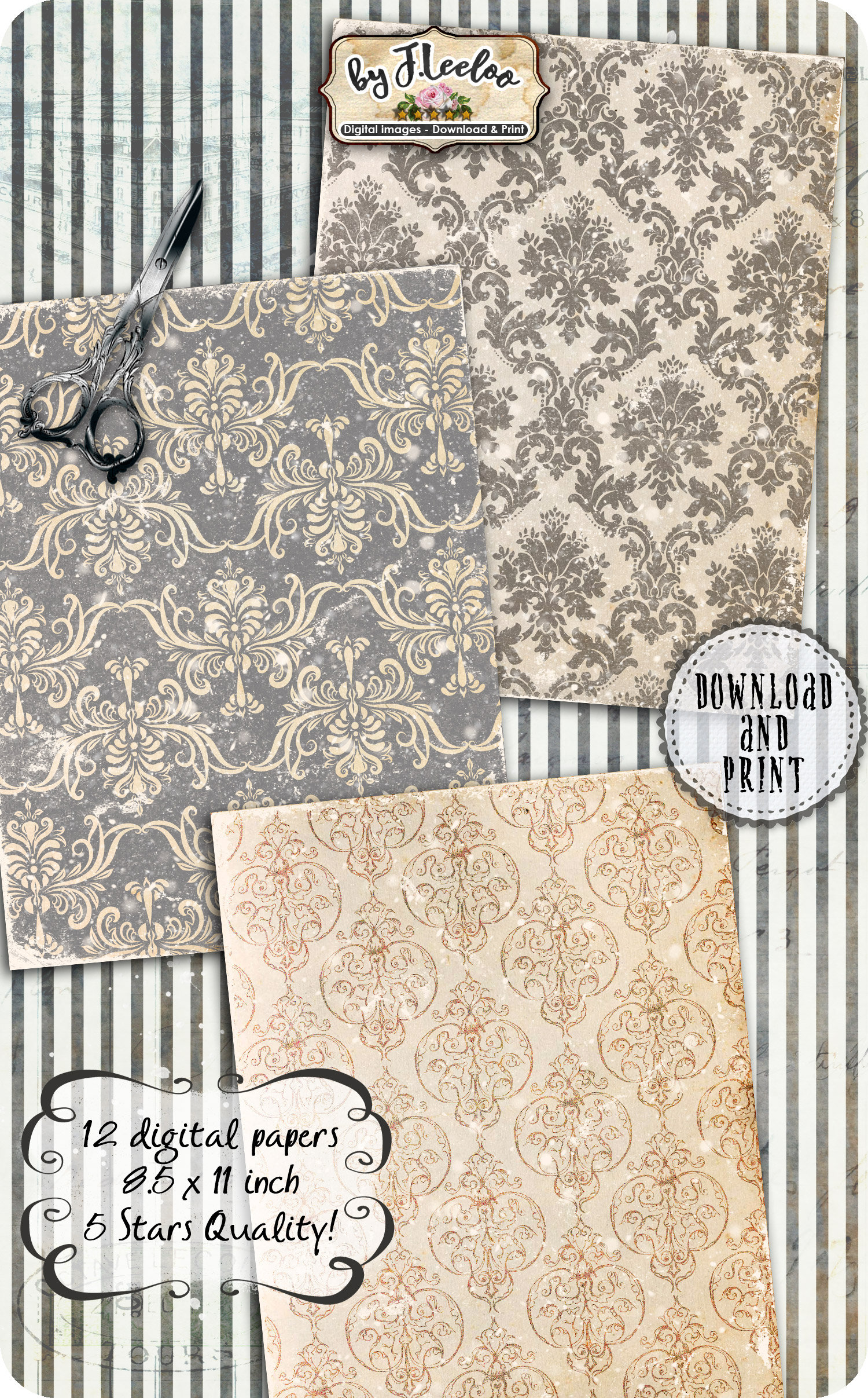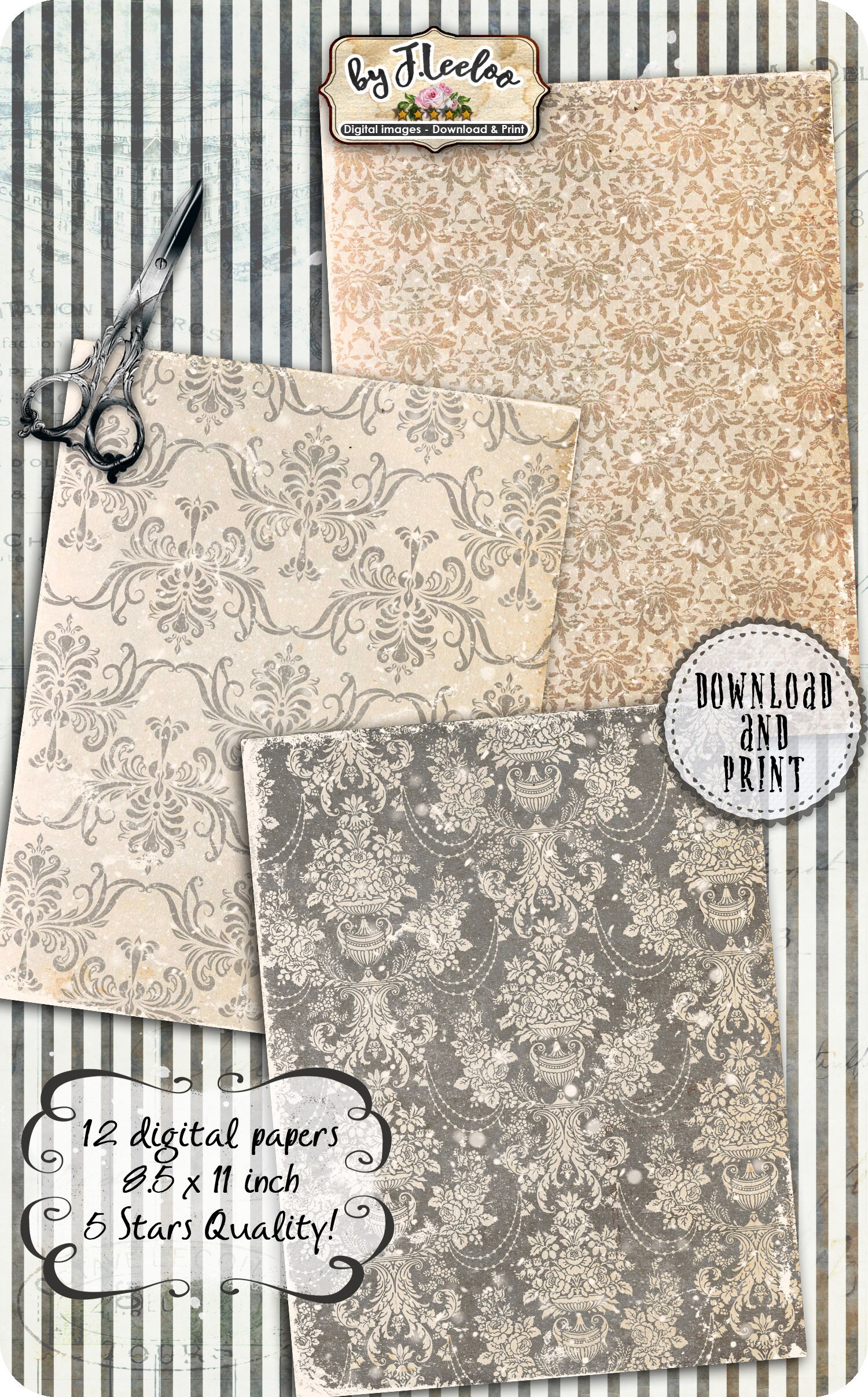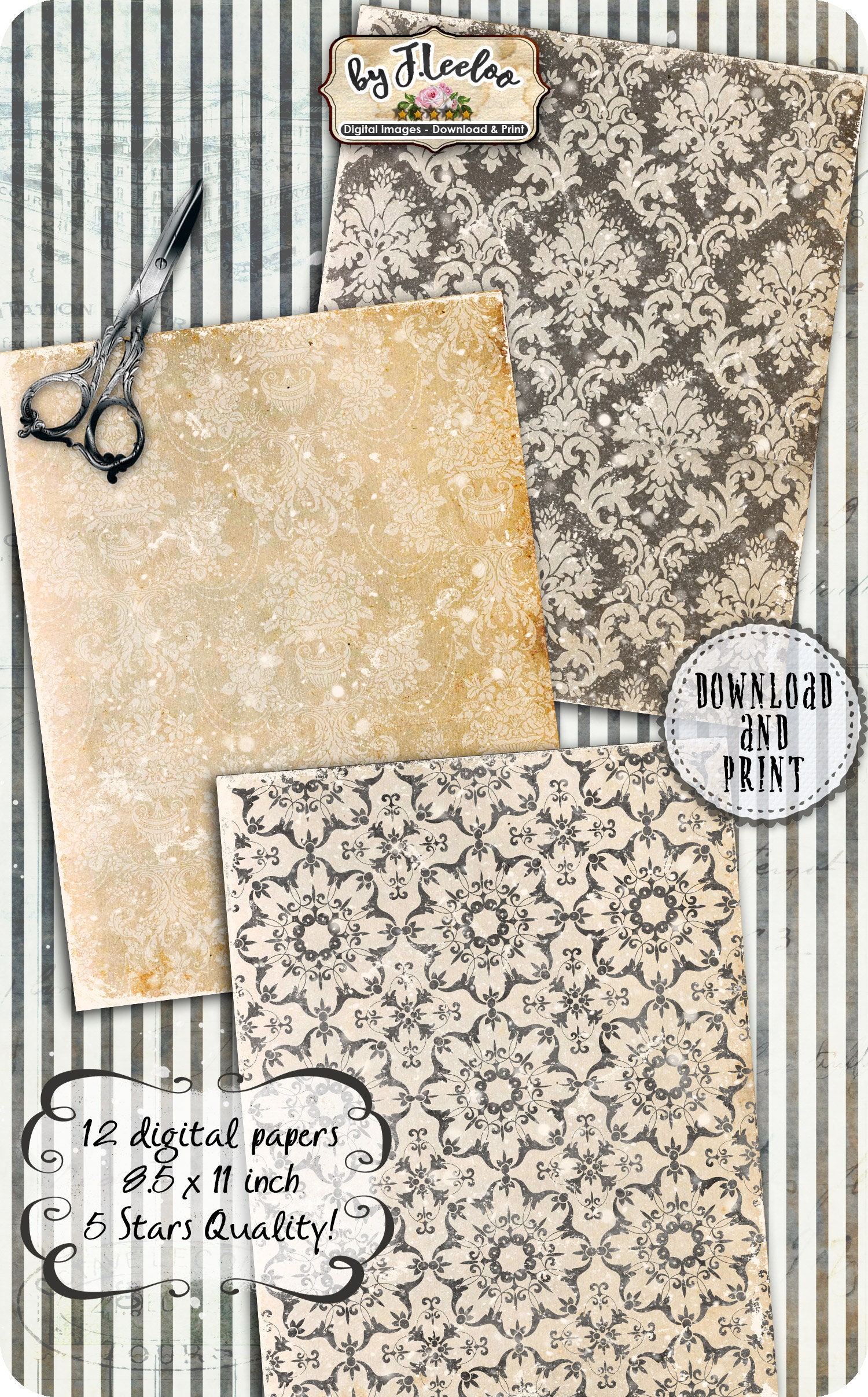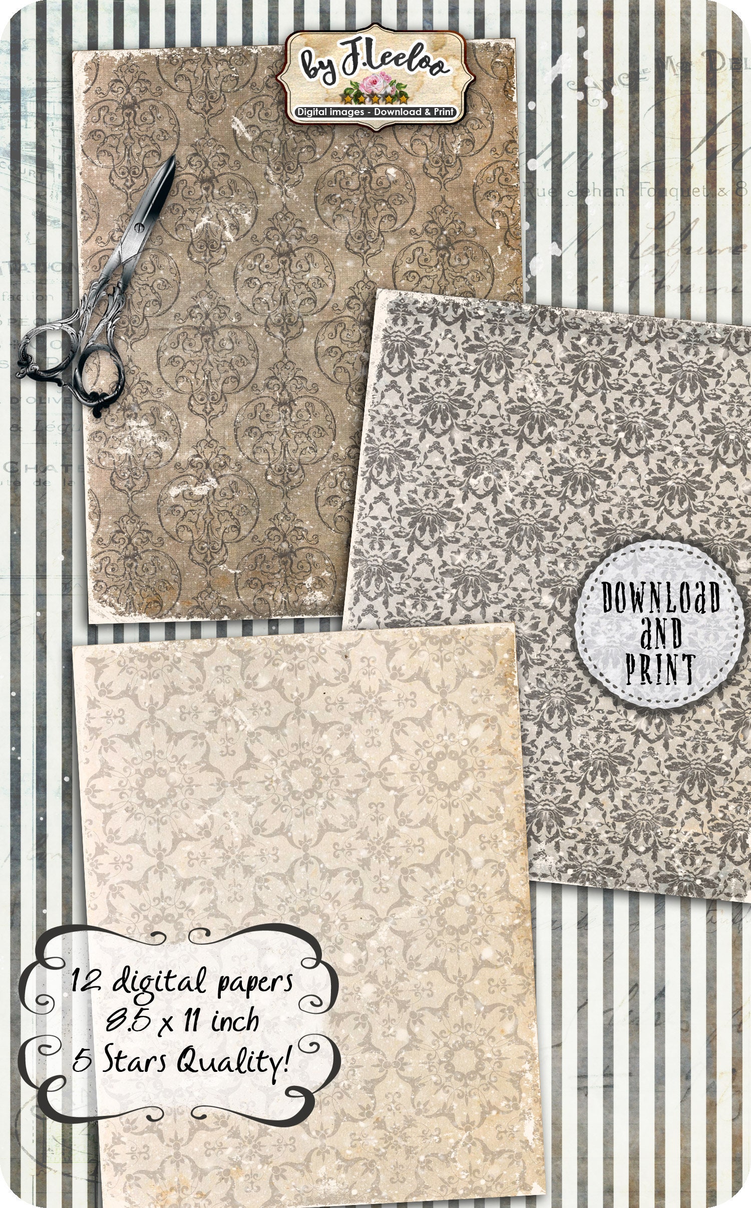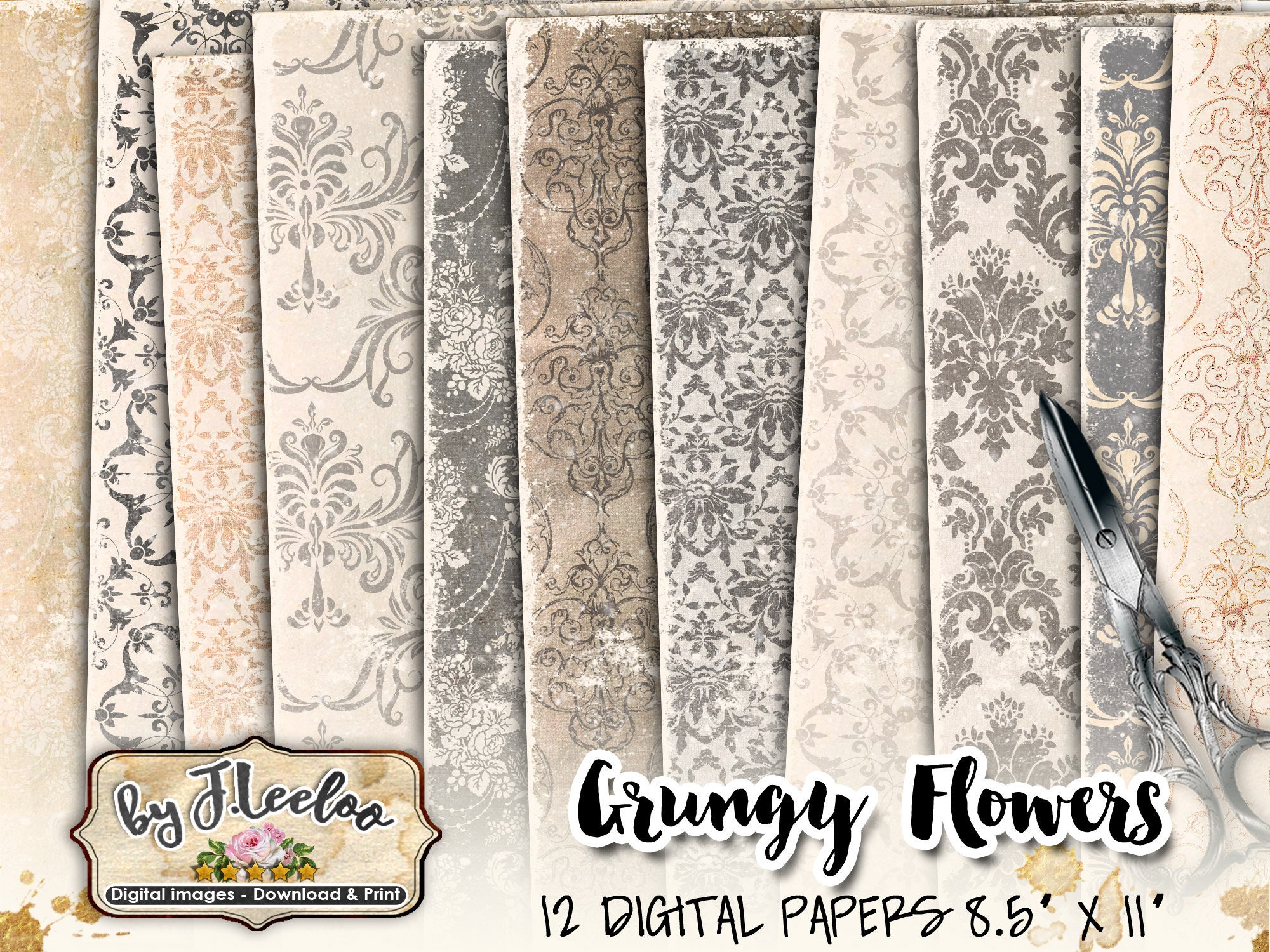 GRUNGY FLOWERS papers for journals layered set damask pattern printable digital vintage collage shee pattern pack- Large images for scrapbook, background, artwork.