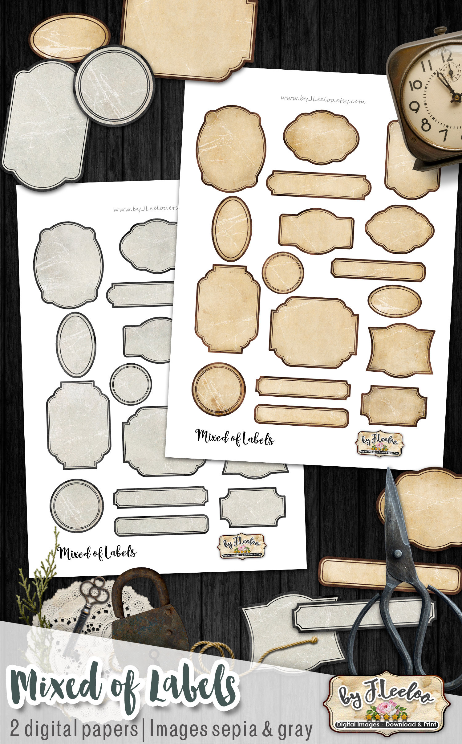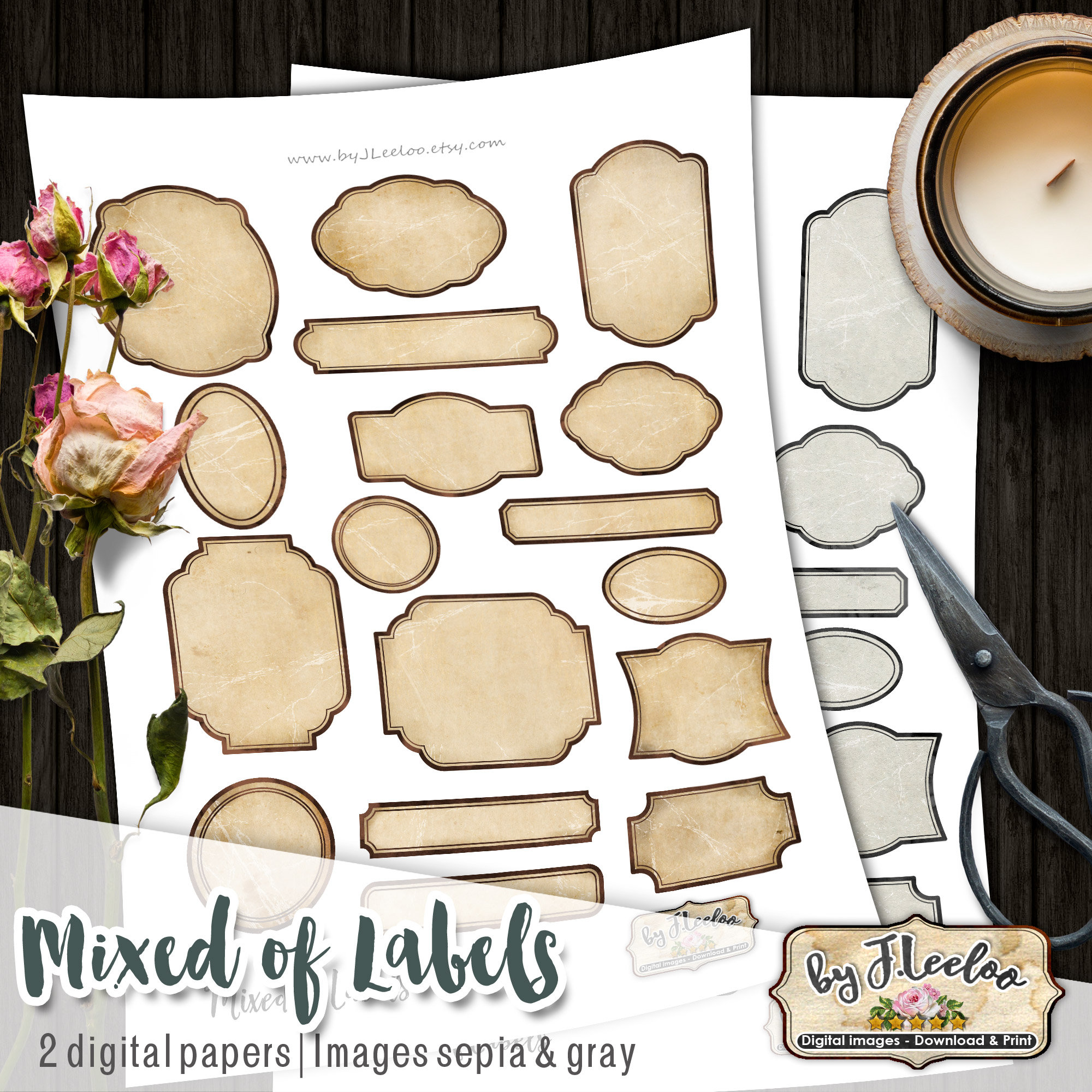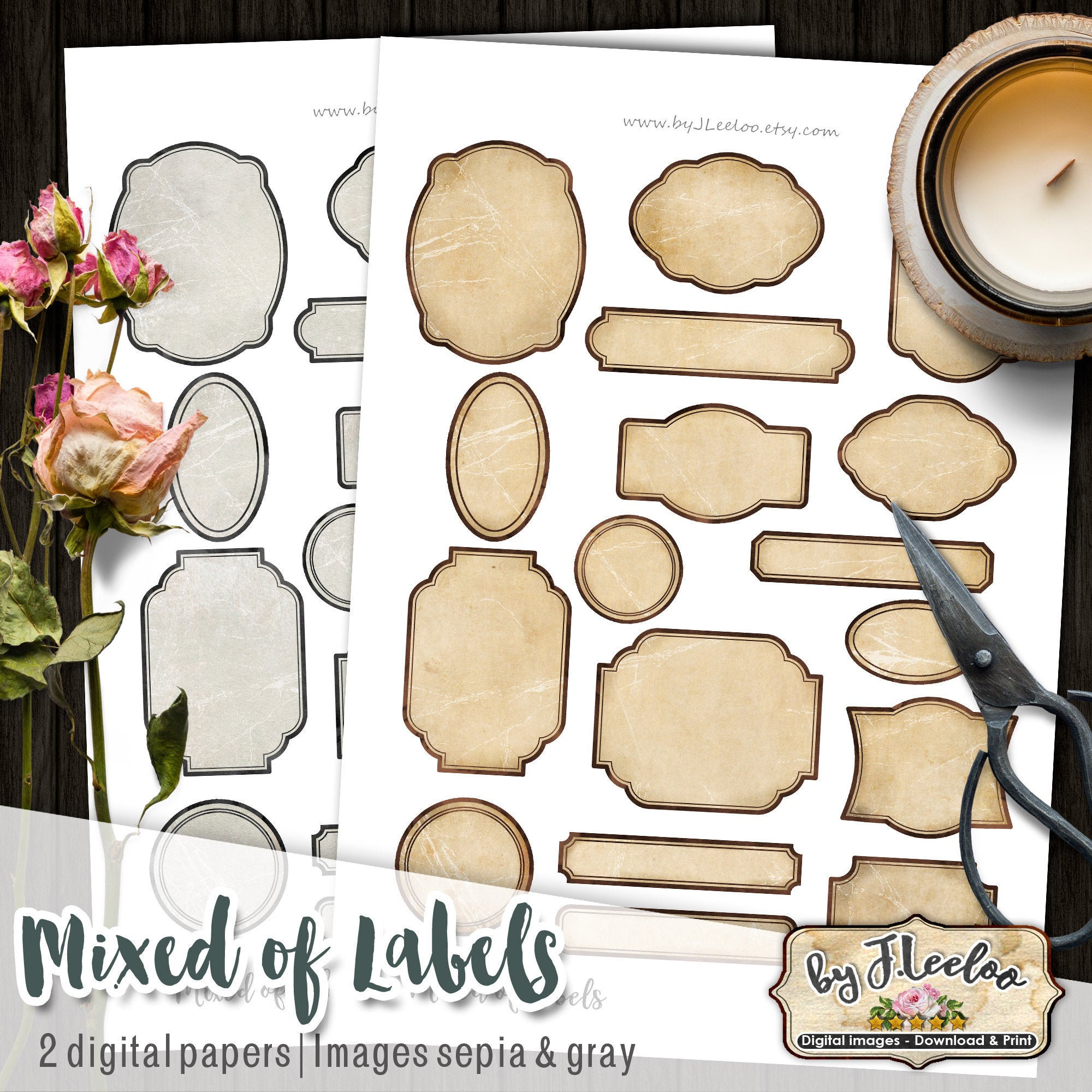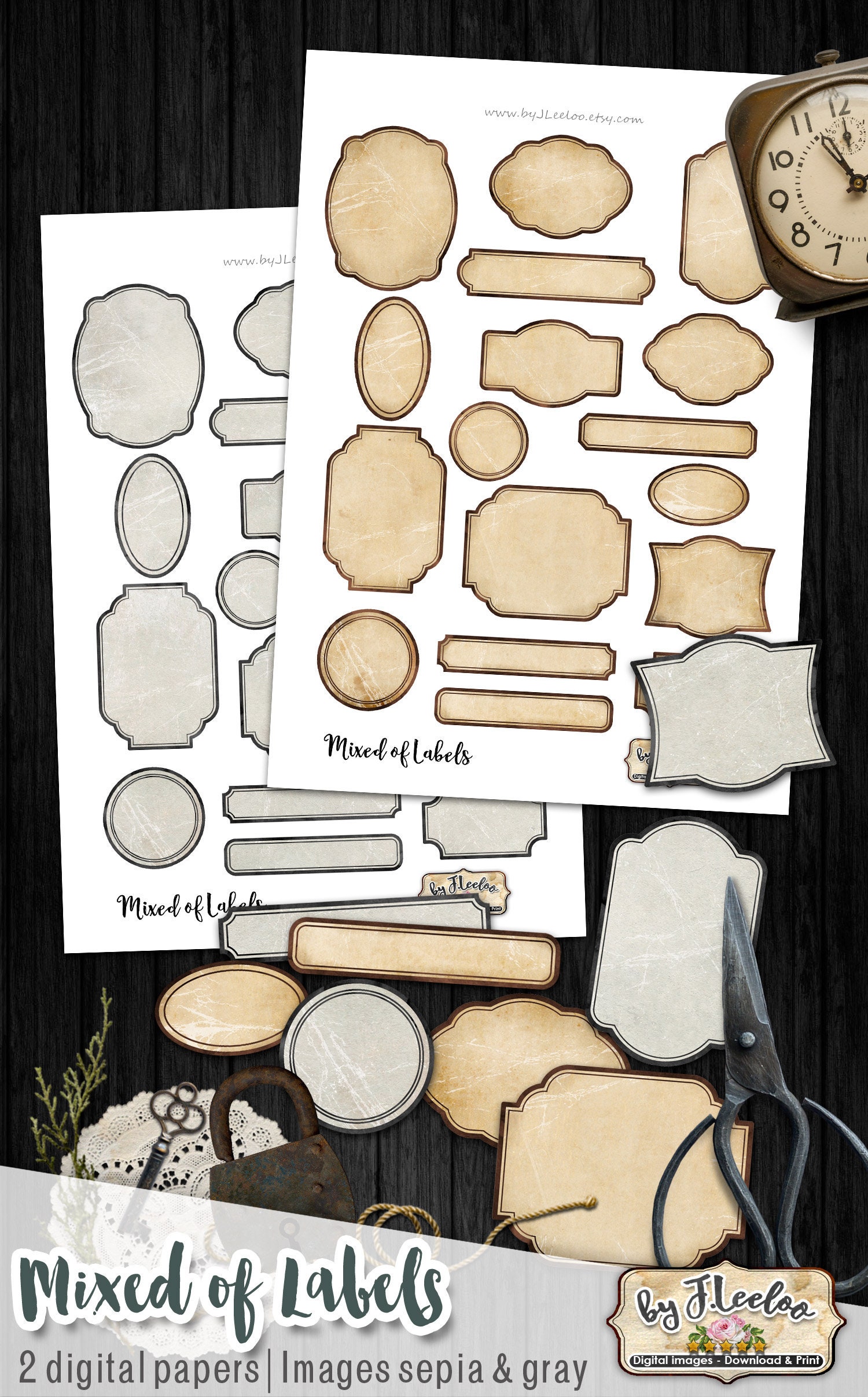 2 pages with labels of different sizes and shapes: the first sheet has the labels in sepia color, the second sheet has the labels in light gray: both are vintage style.